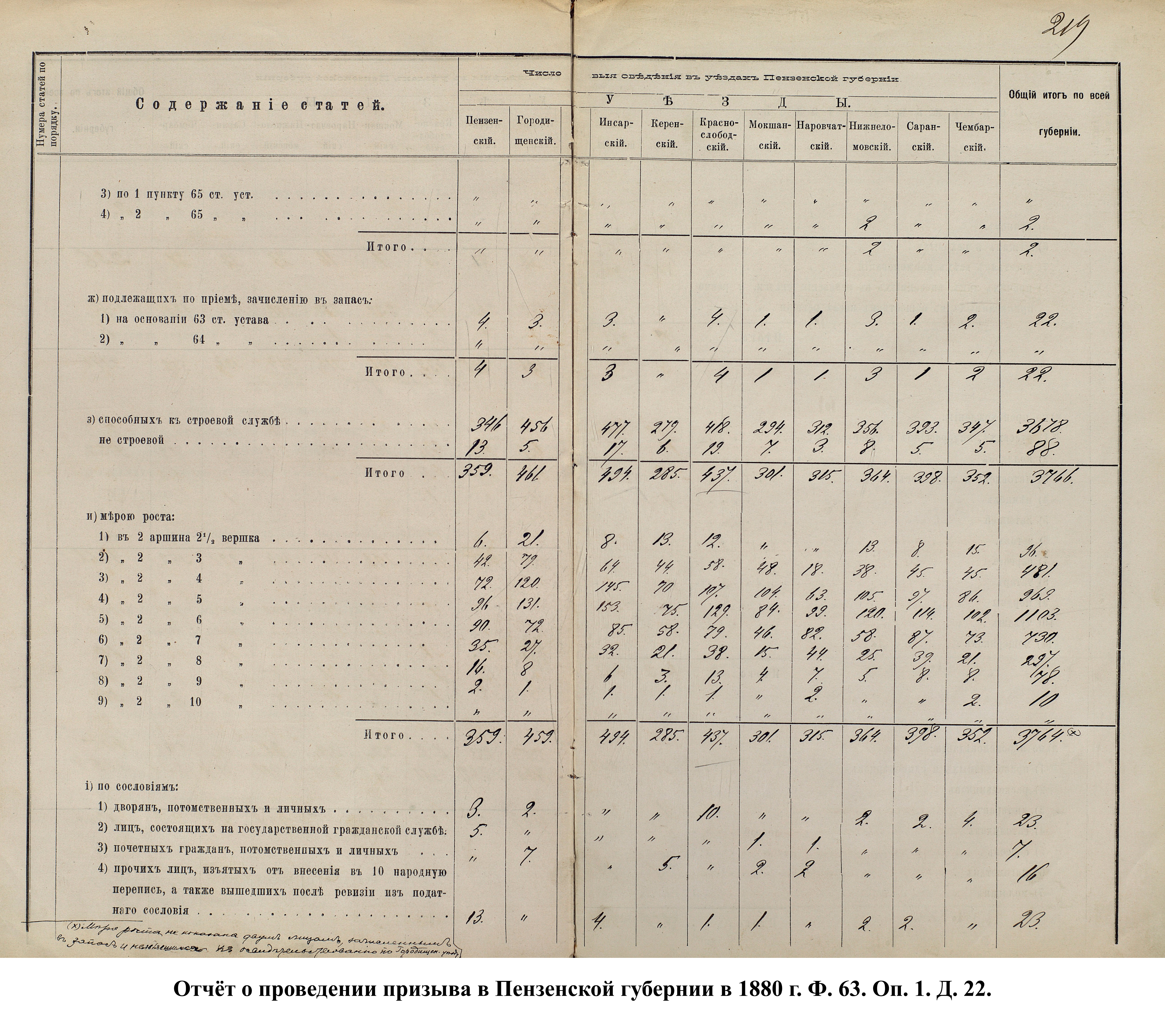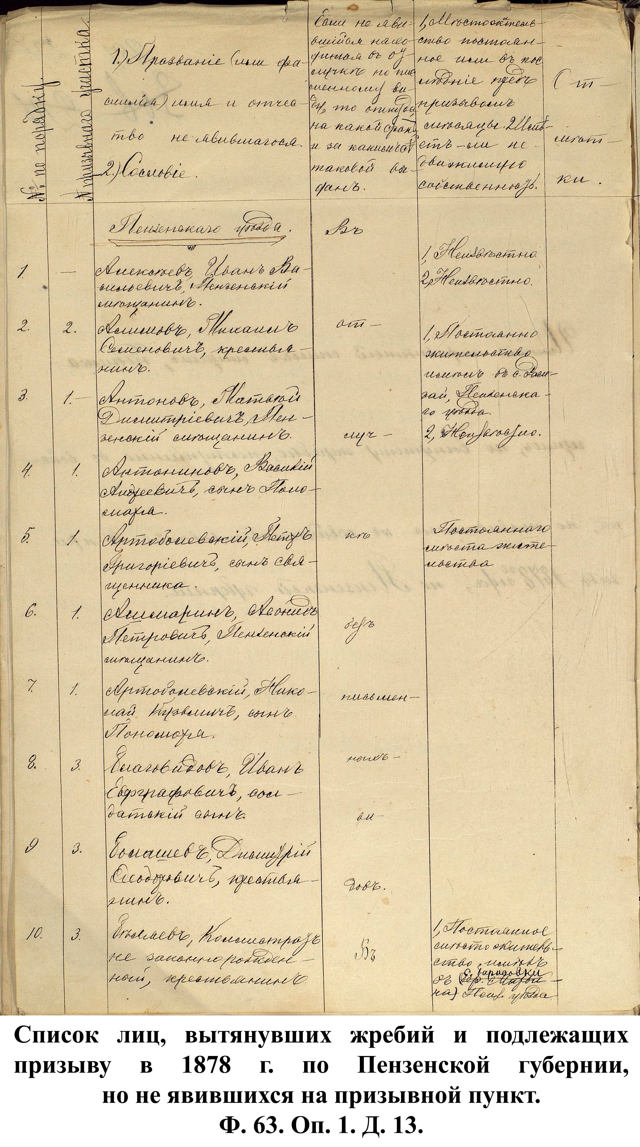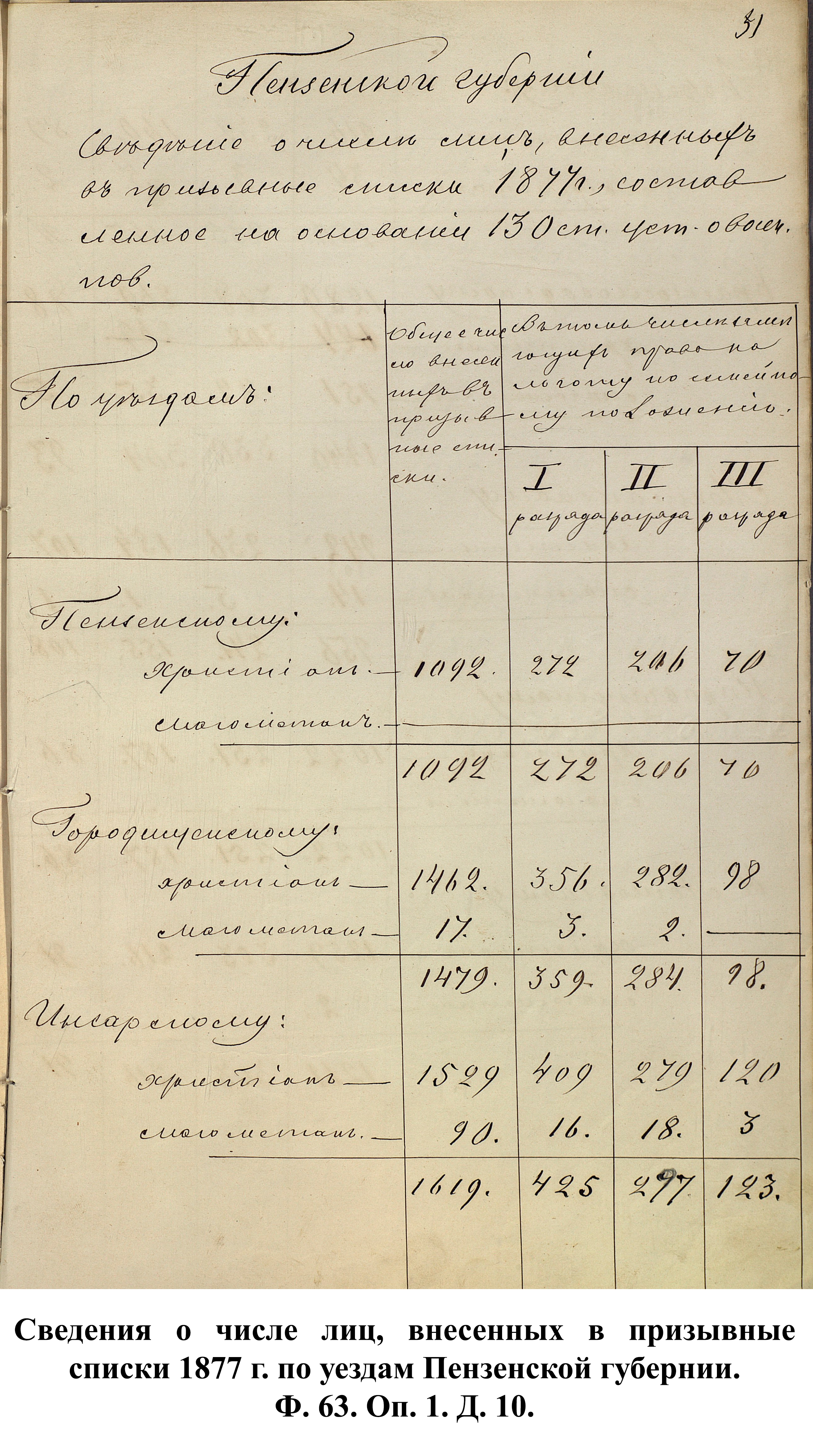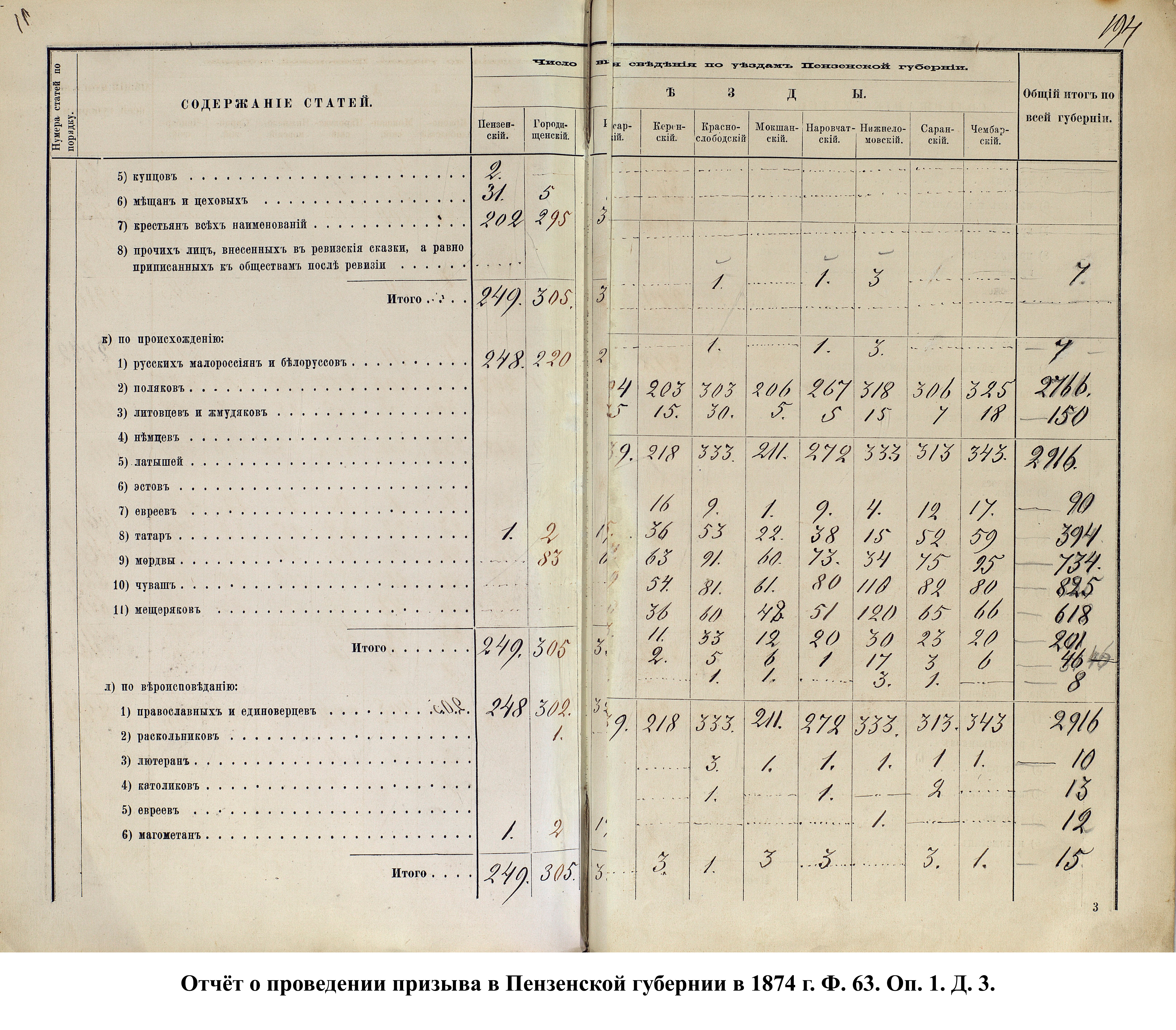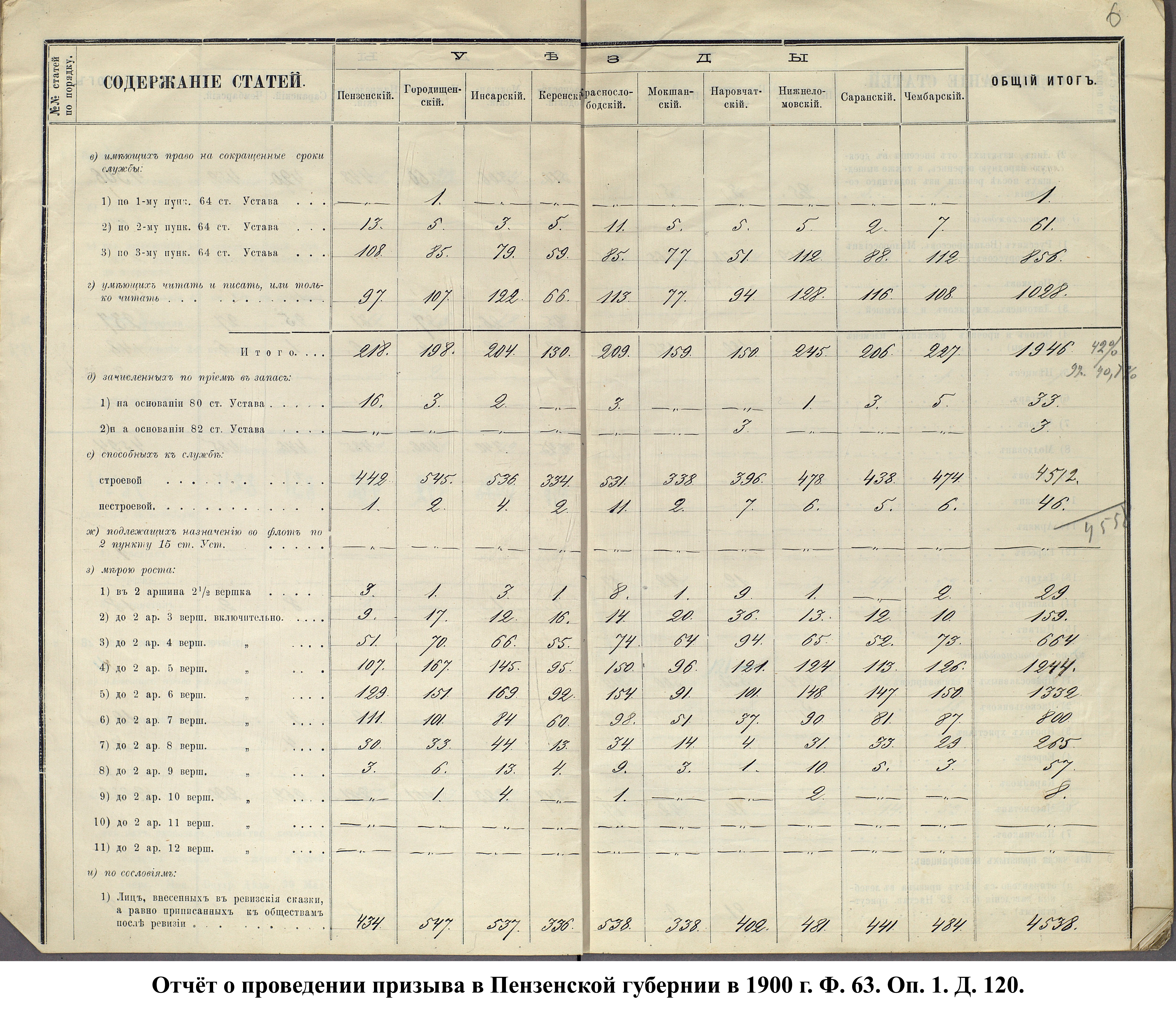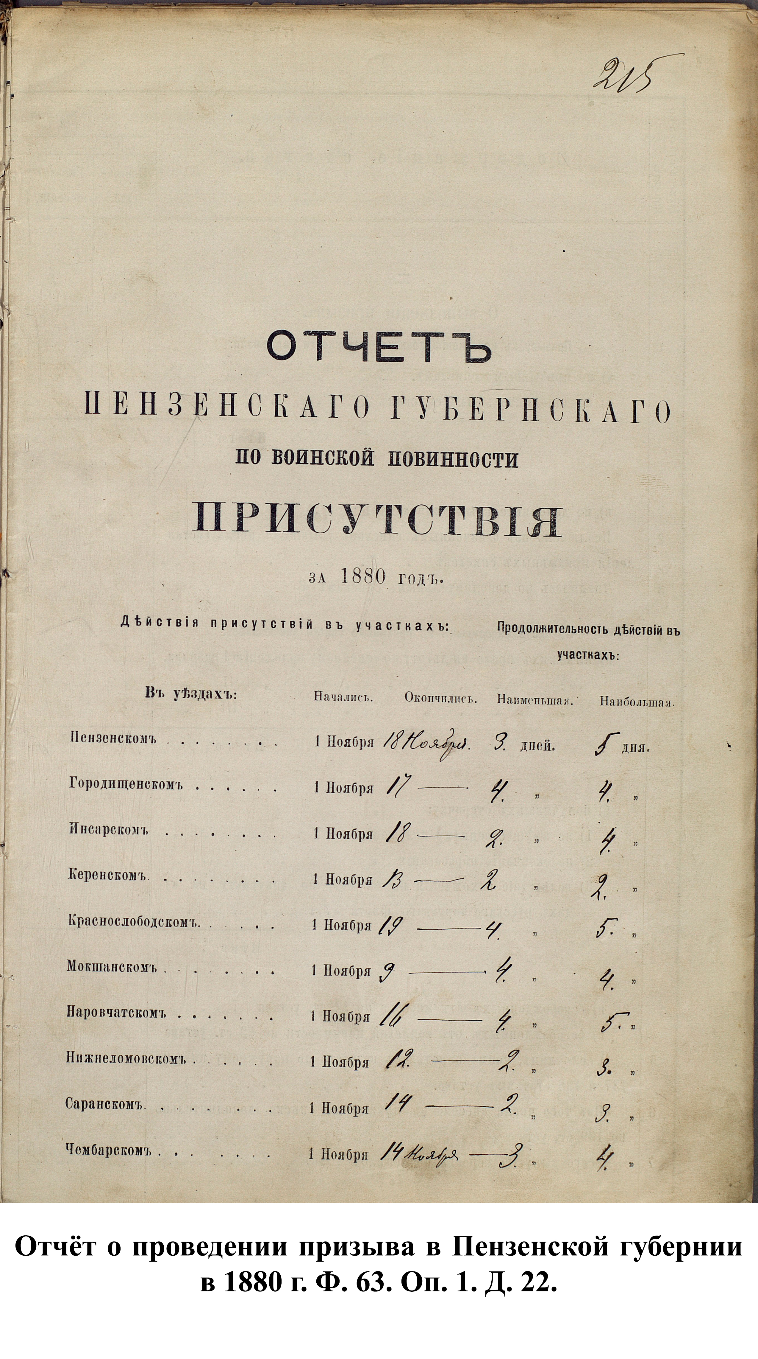 Согласно отчёту Пензенского ВПП от 1885 г., по призывным спискам вытягиванию жребия подлежало 12050 призывников. К исполнению службы было представлено 3248 чел. (см. табл. 3). 162 призывника не явилось к освидетельствованию, из них 61 – из Краснослободского уезда.