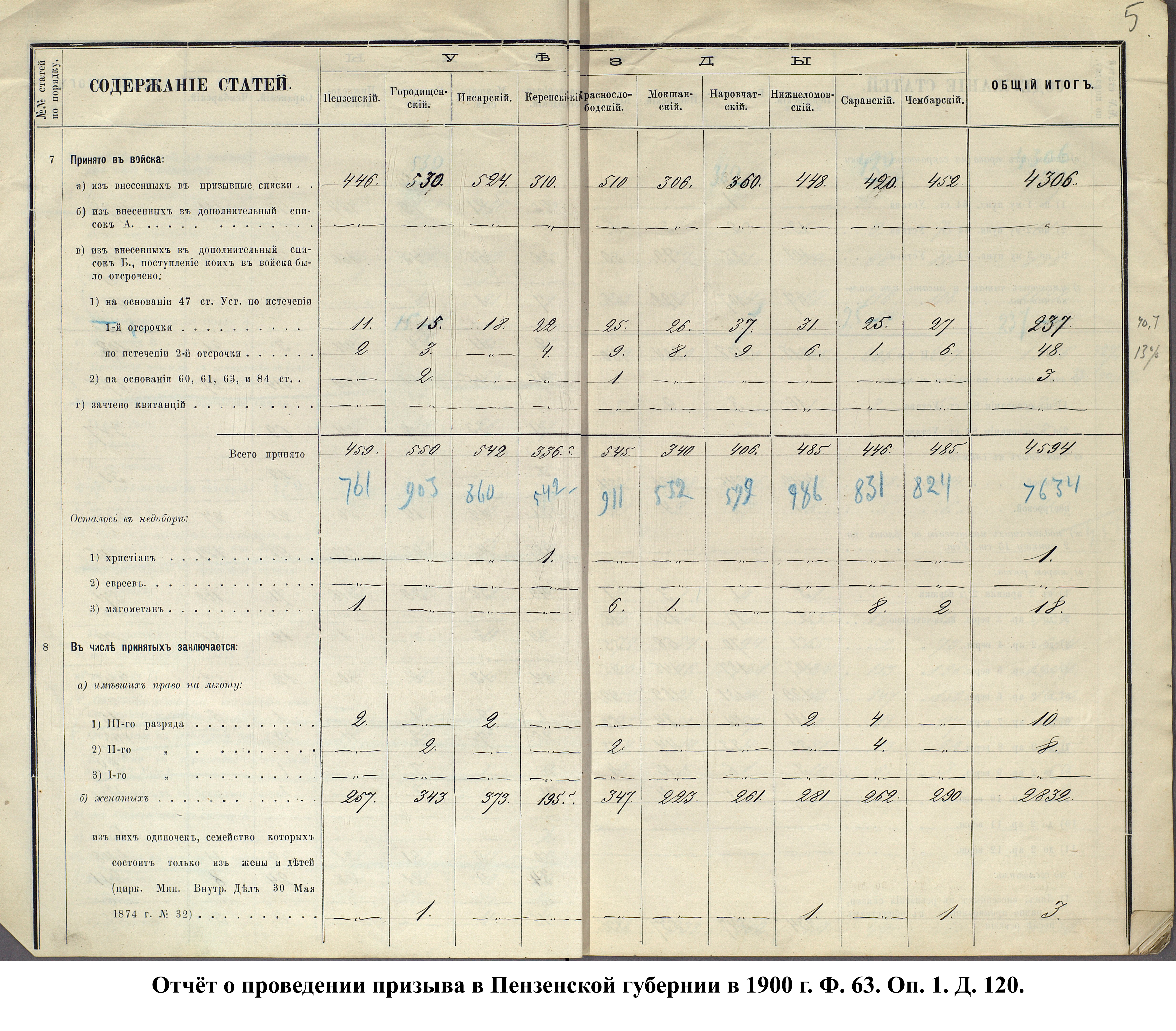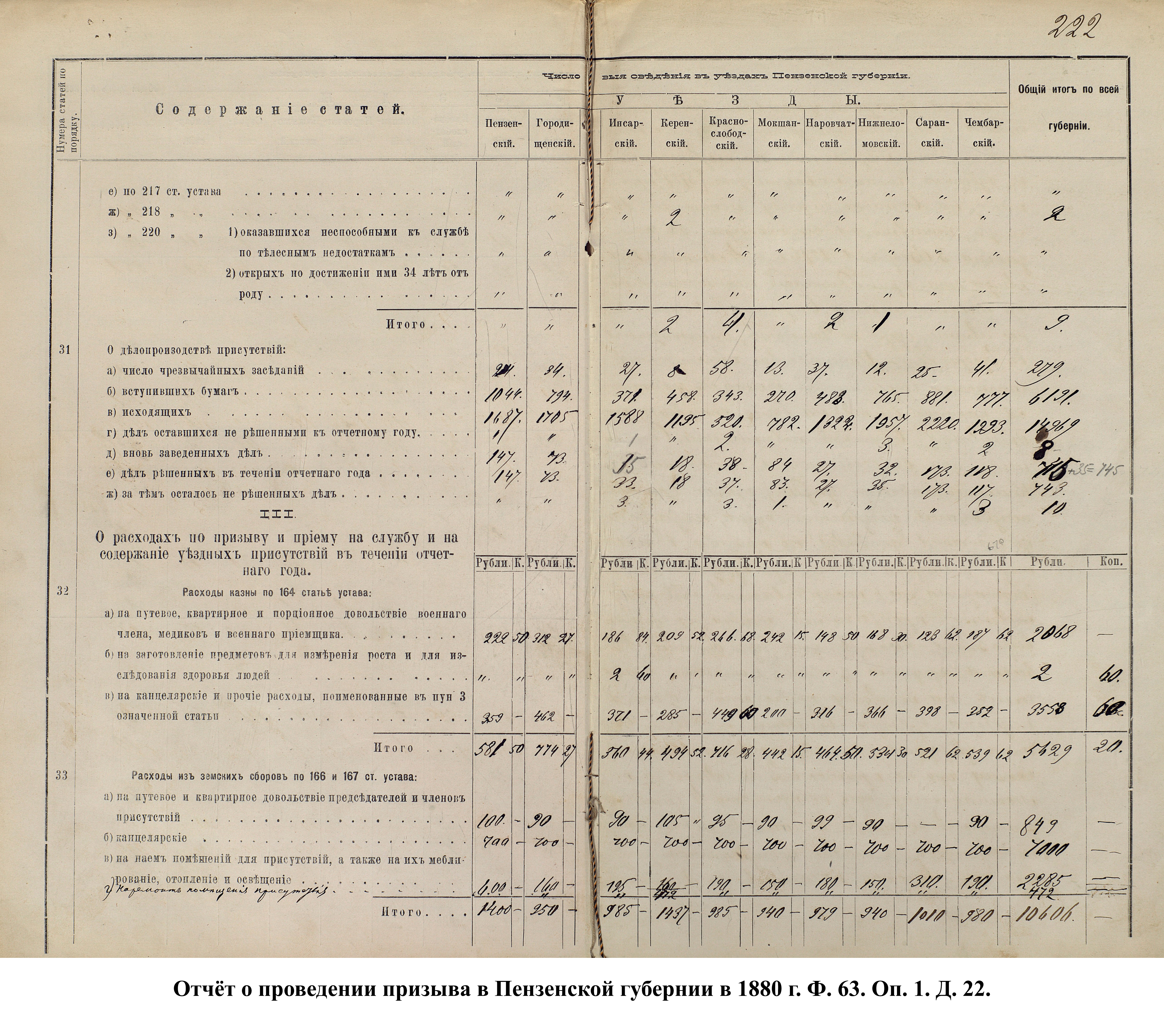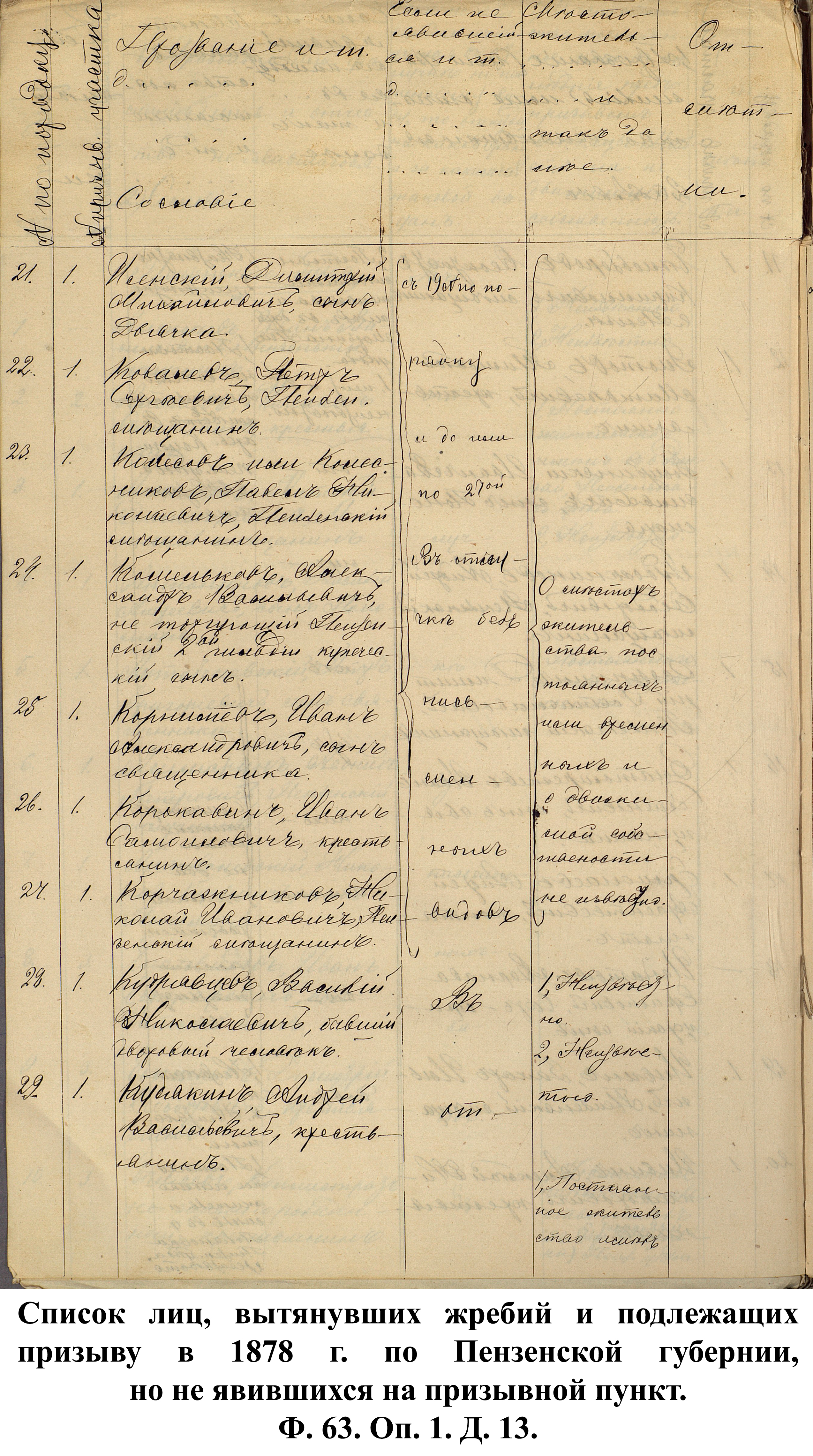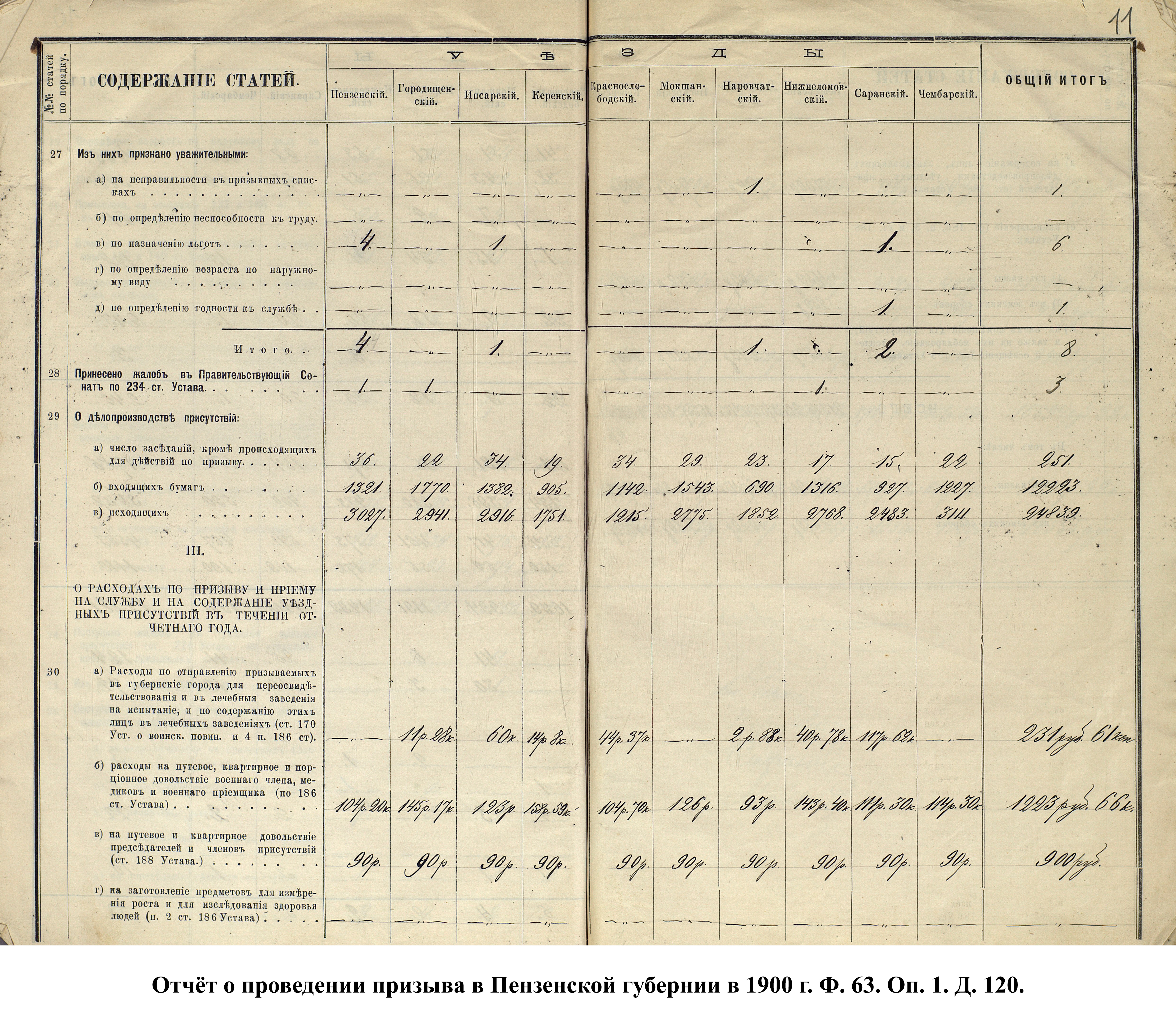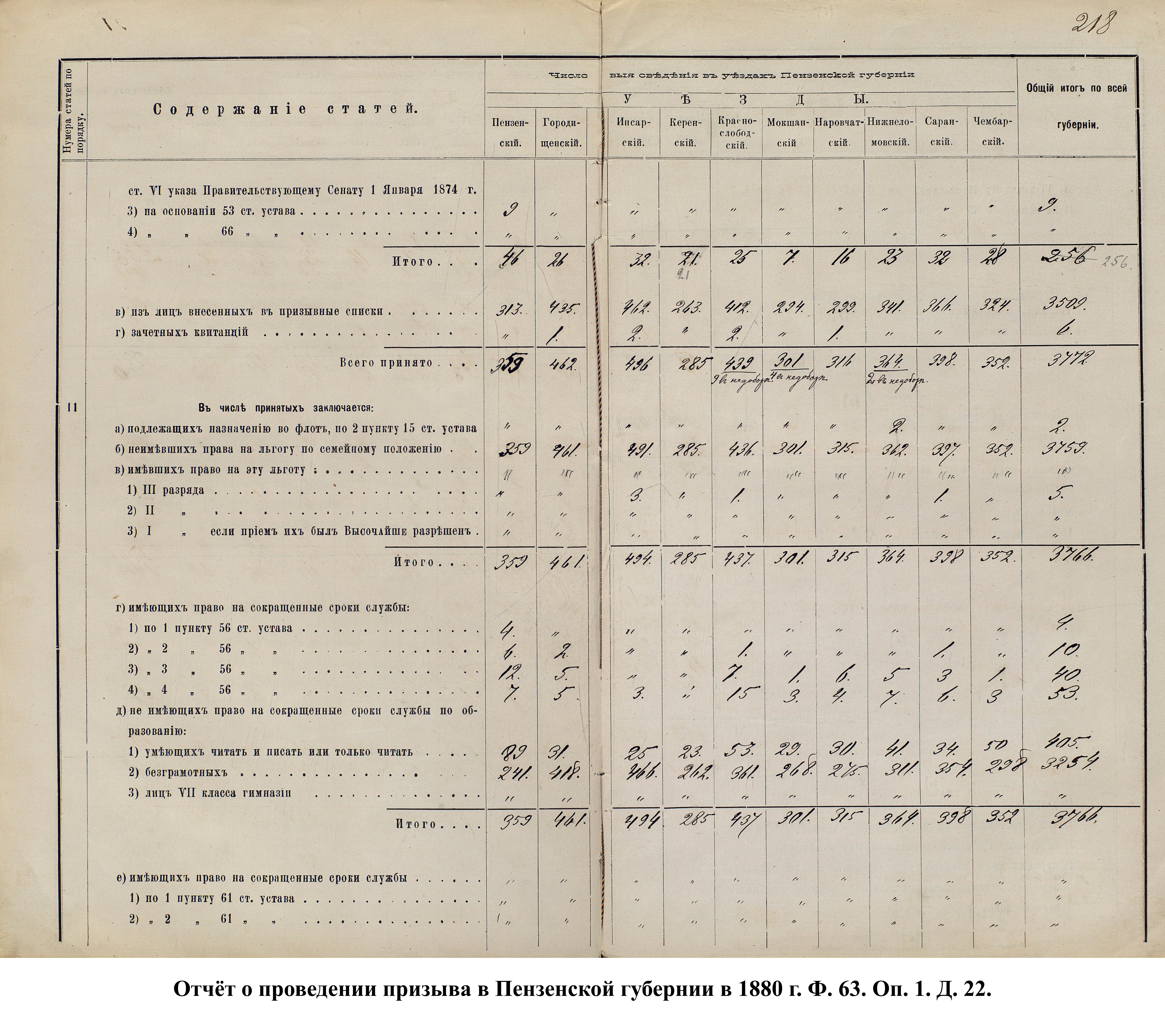 Согласно отчёту Пензенского ВПП от 1885 г., по призывным спискам вытягиванию жребия подлежало 12050 призывников. К исполнению службы было представлено 3248 чел. (см. табл. 3). 162 призывника не явилось к освидетельствованию, из них 61 – из Краснослободского уезда.