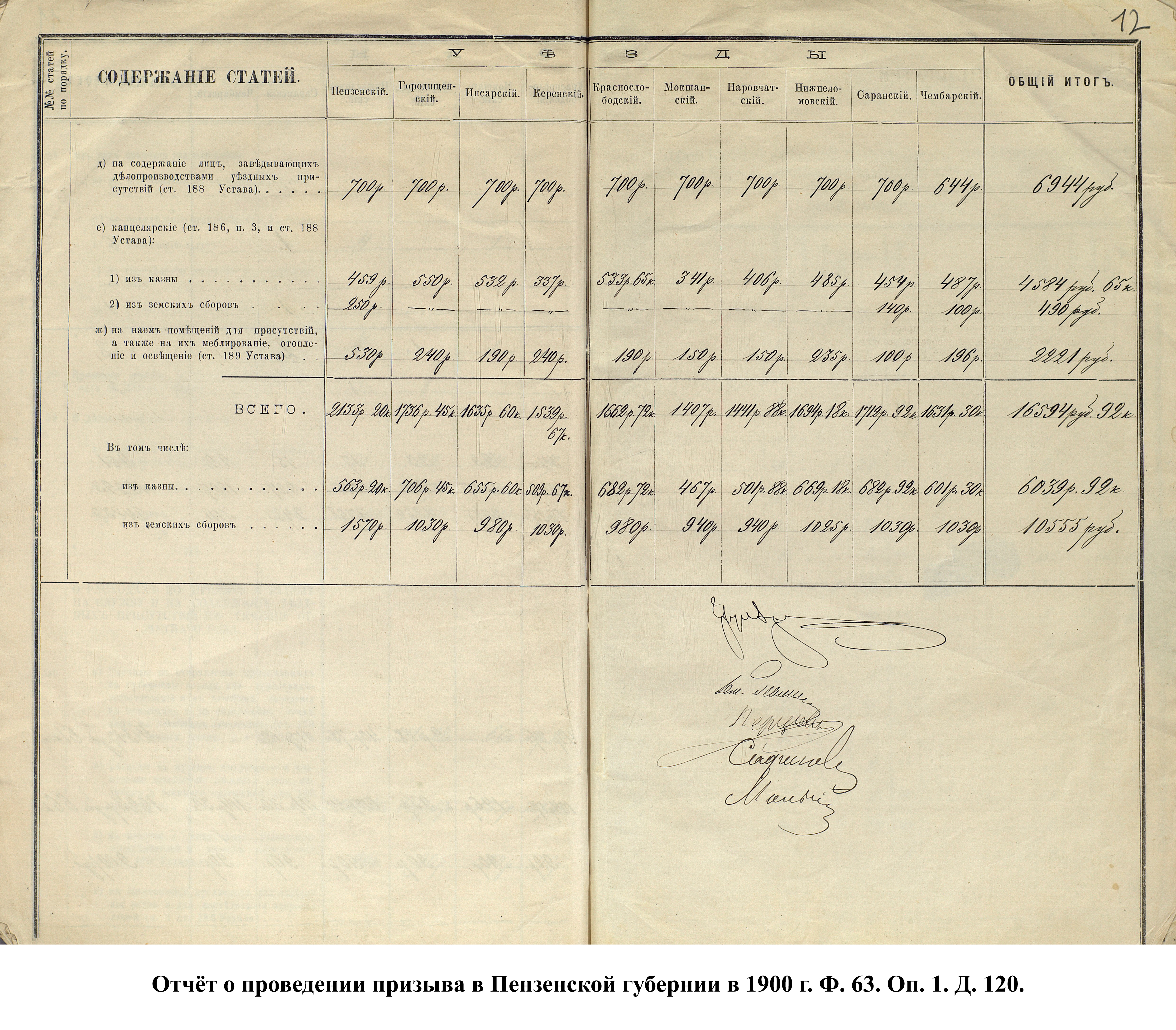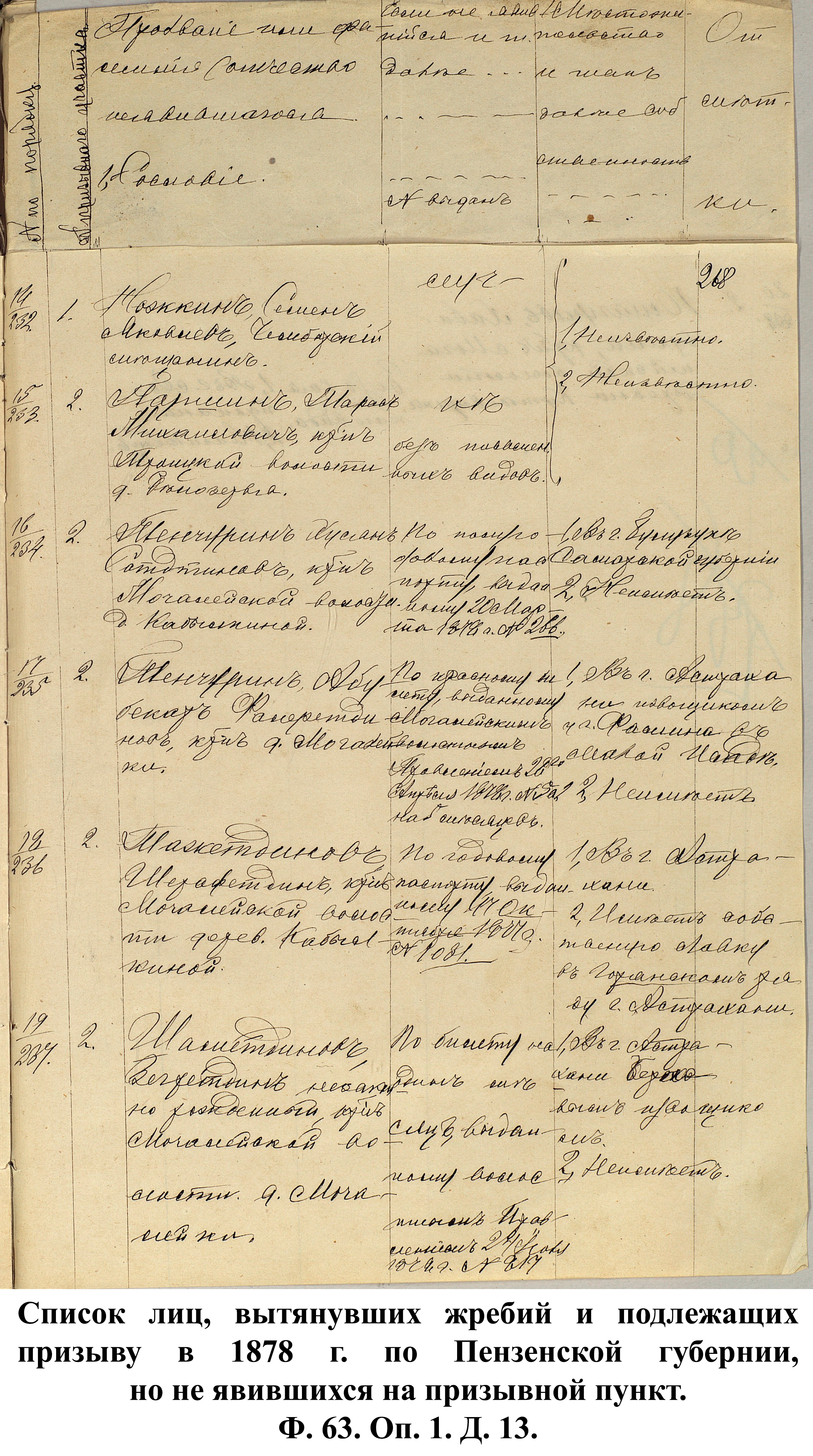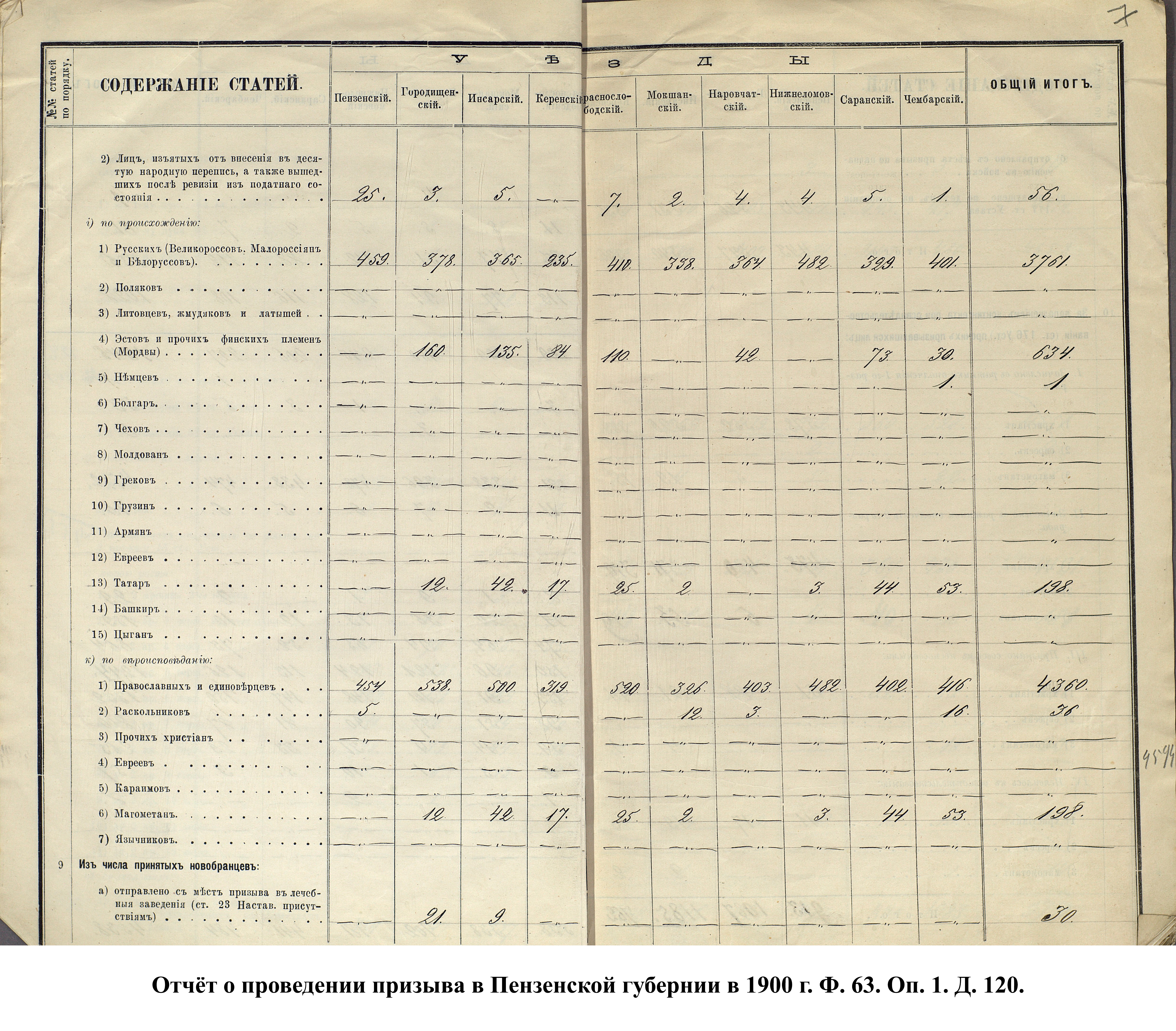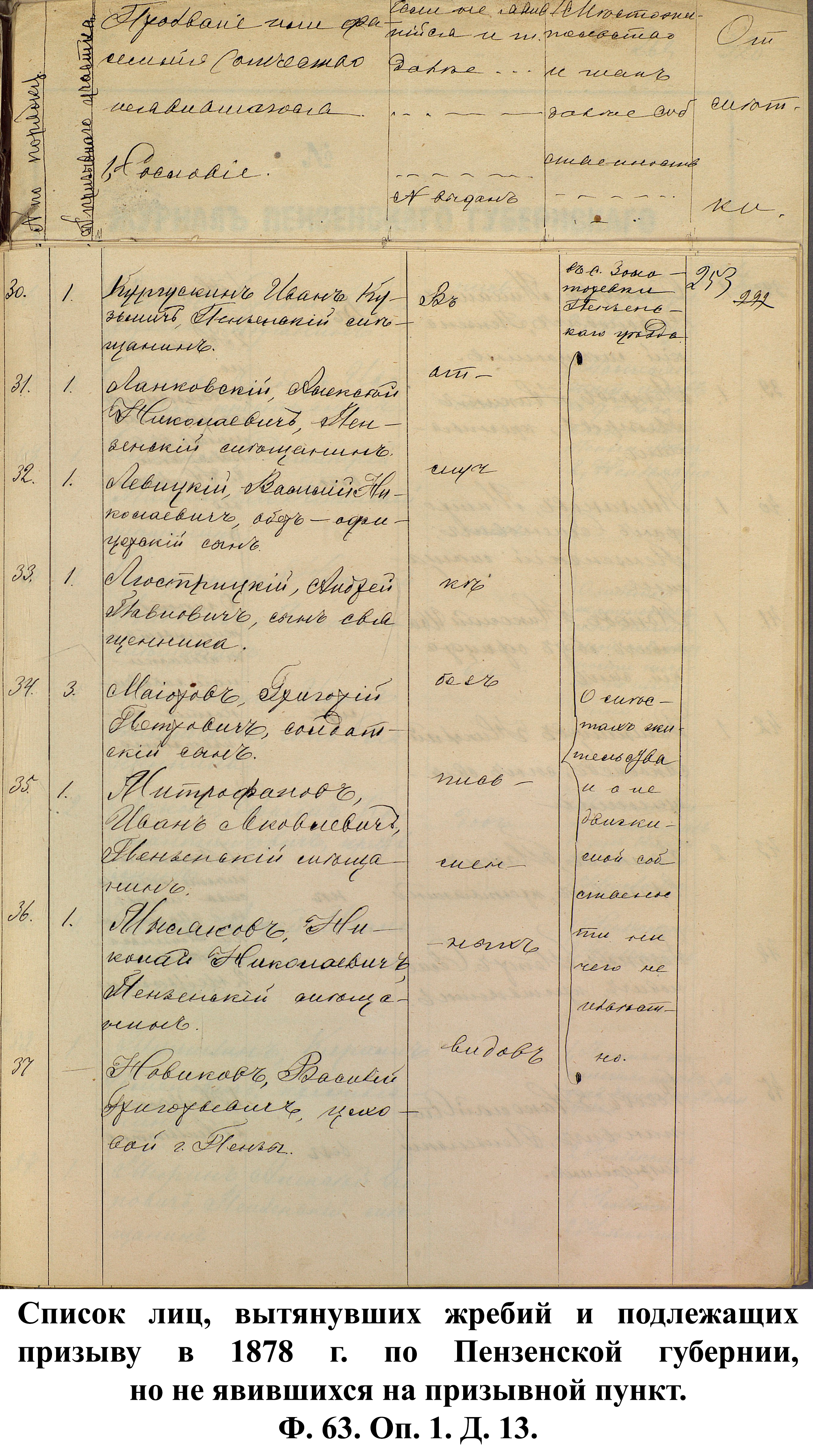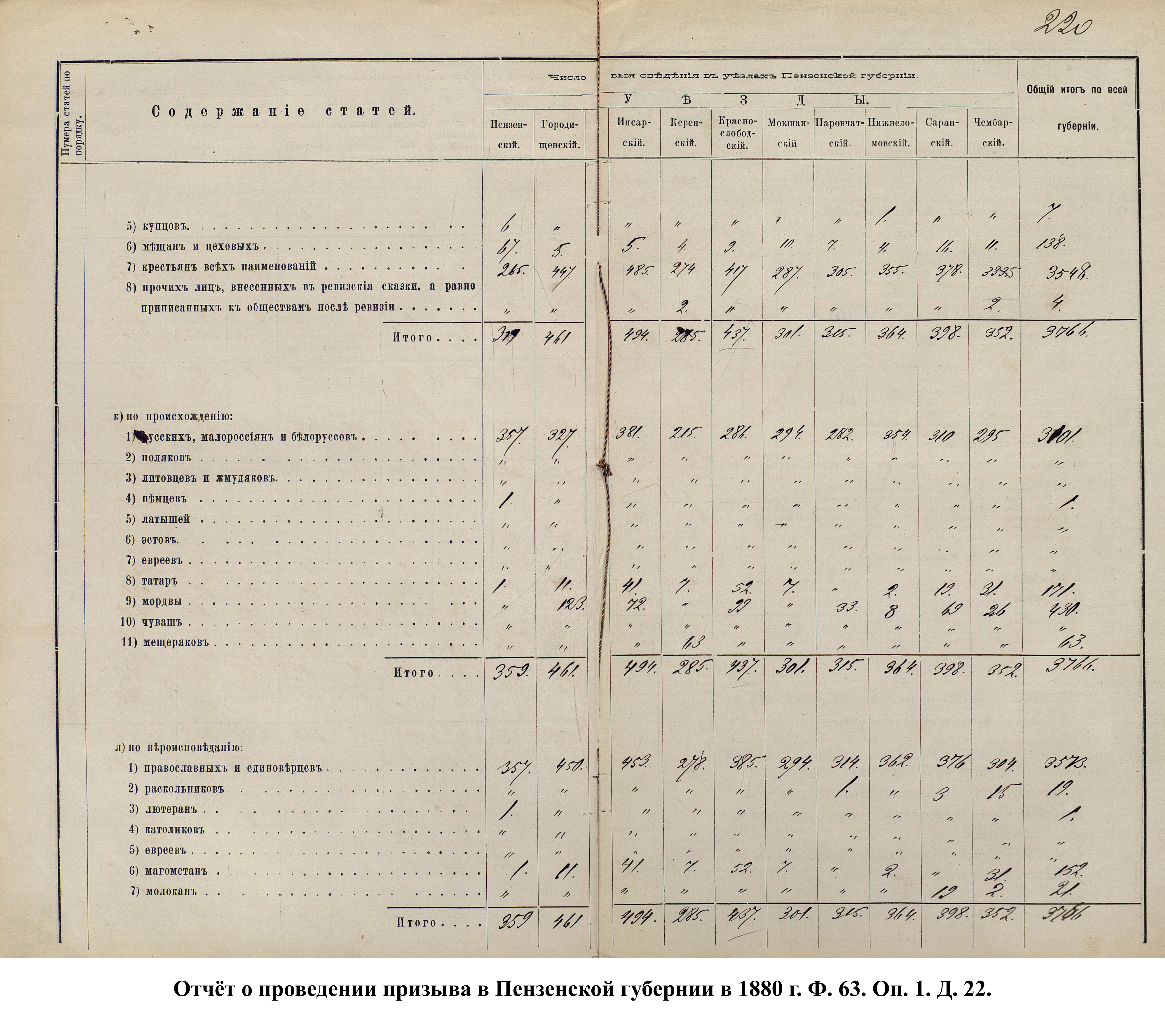 Согласно отчёту Пензенского ВПП от 1885 г., по призывным спискам вытягиванию жребия подлежало 12050 призывников. К исполнению службы было представлено 3248 чел. (см. табл. 3). 162 призывника не явилось к освидетельствованию, из них 61 – из Краснослободского уезда.