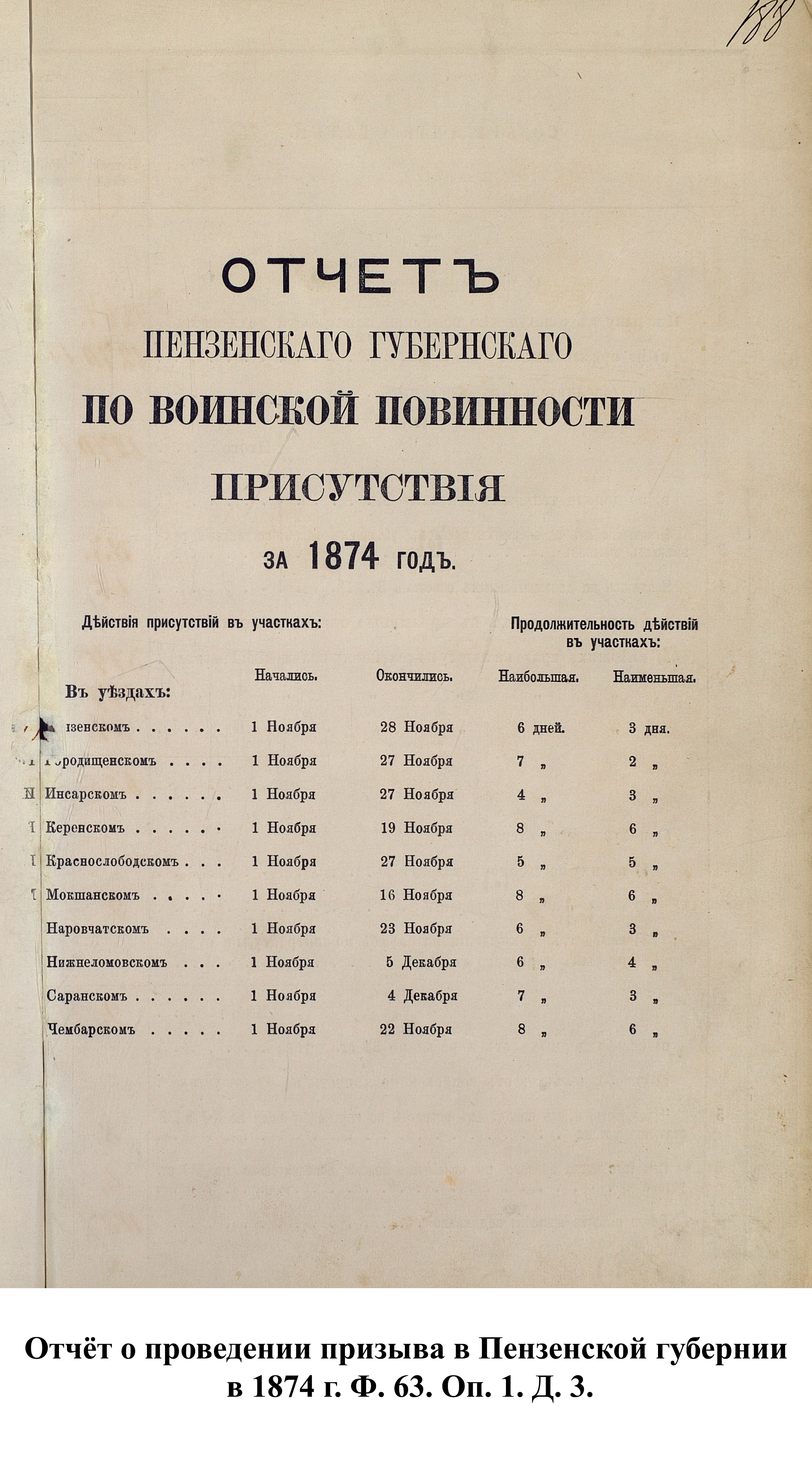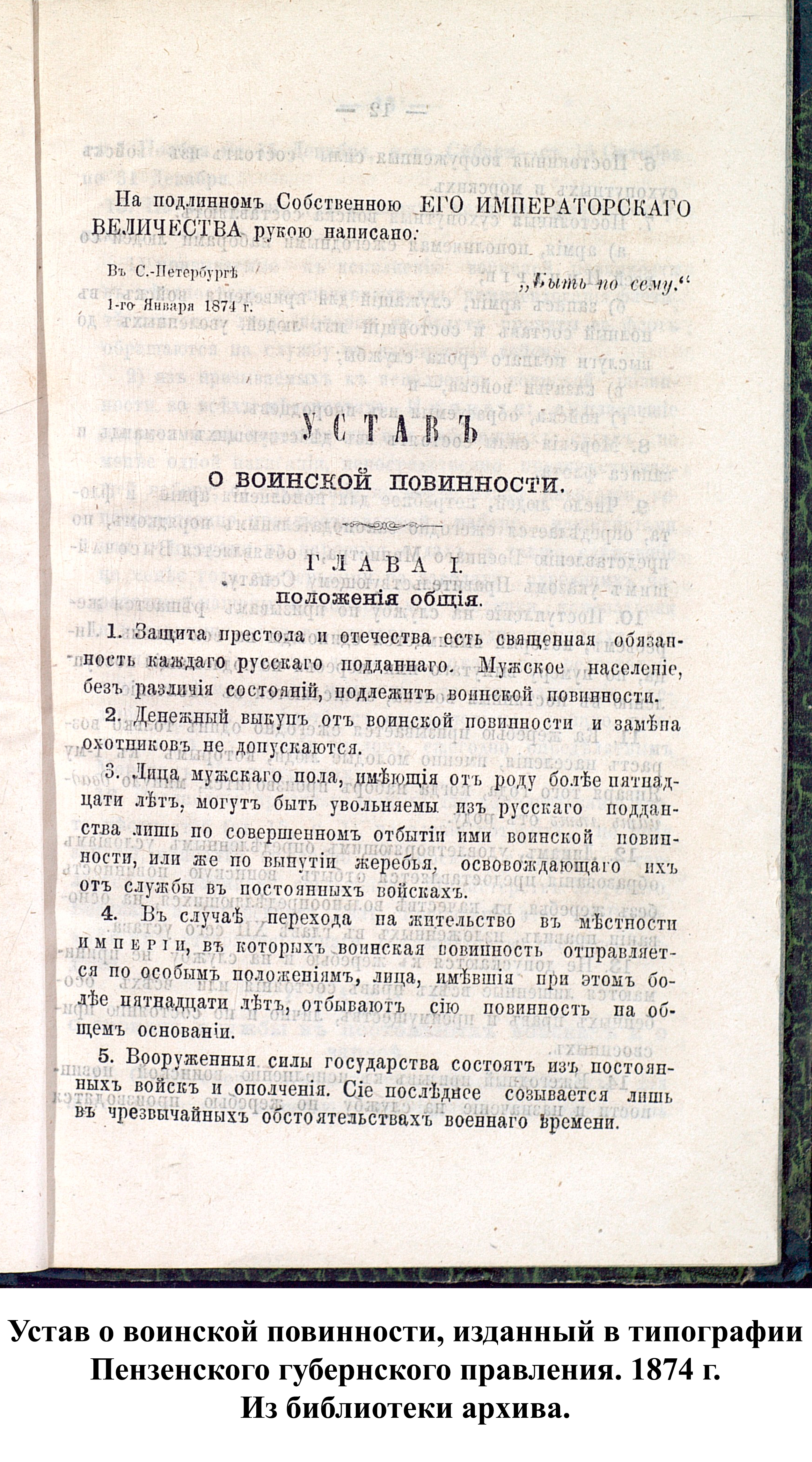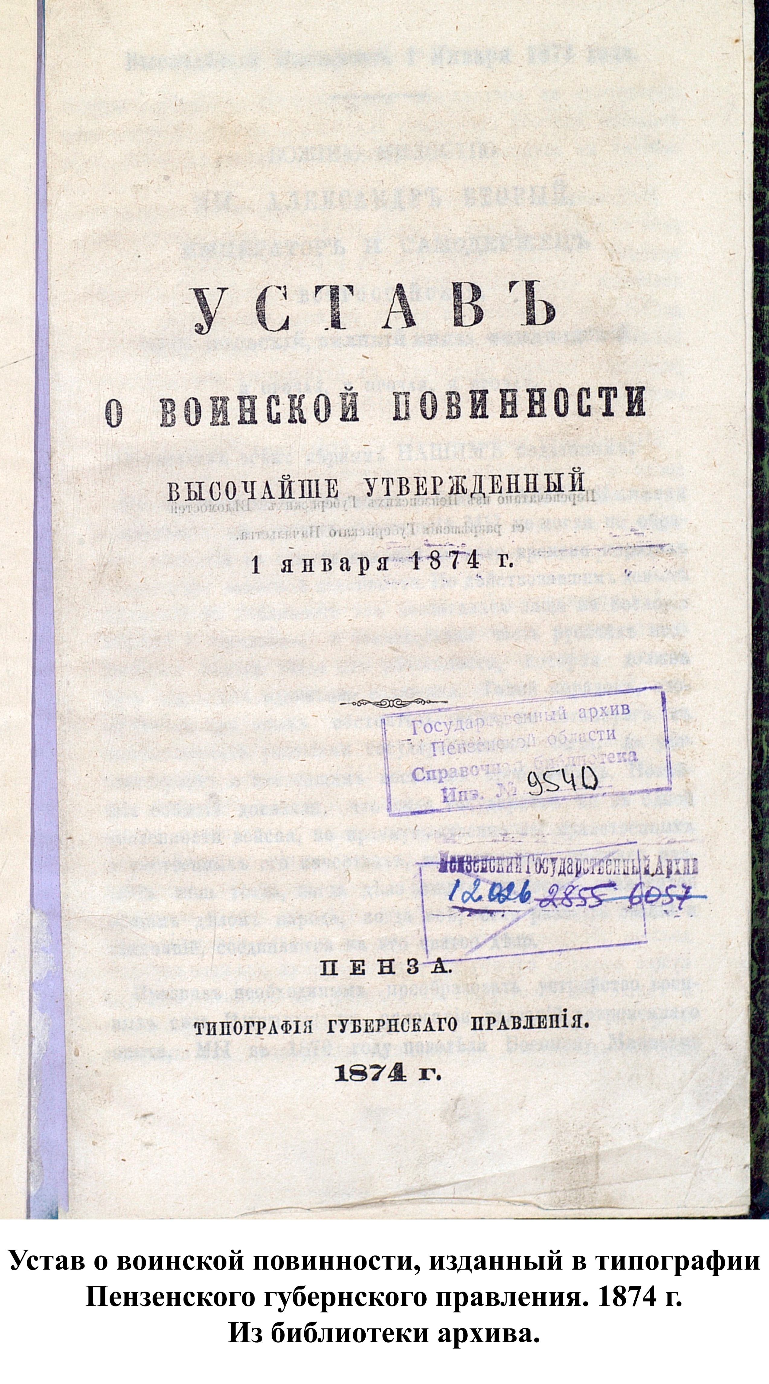 О начале военной реформы в Пензенской губернии было объявлено 10 января 1874 г. на страницах Пензенских губернских ведомостей. В последующих номерах был опубликован полный текст устава о воинской повинности и дано объявление о возможности приобрести печатный вариант устава за 15 коп. в губернской типографии.