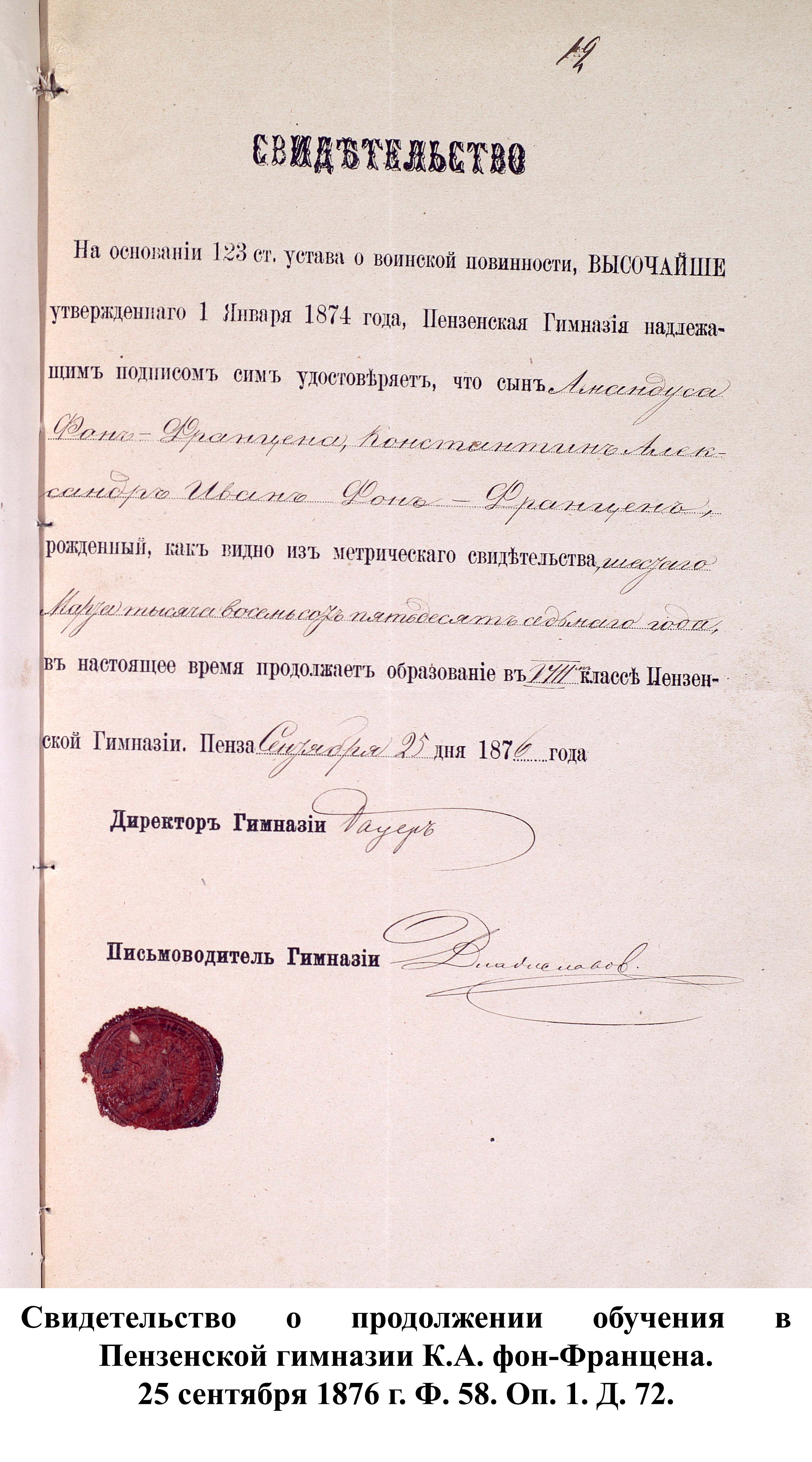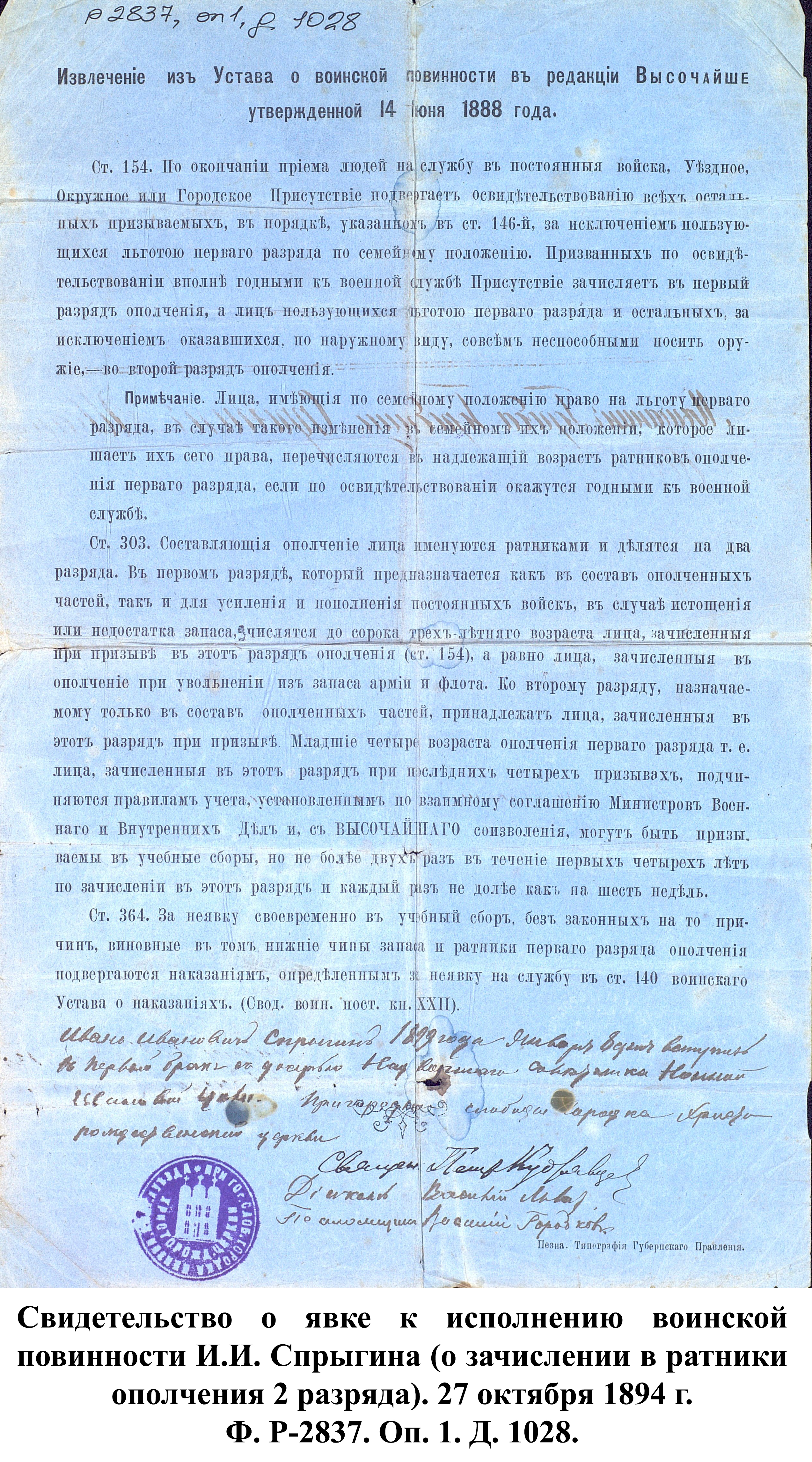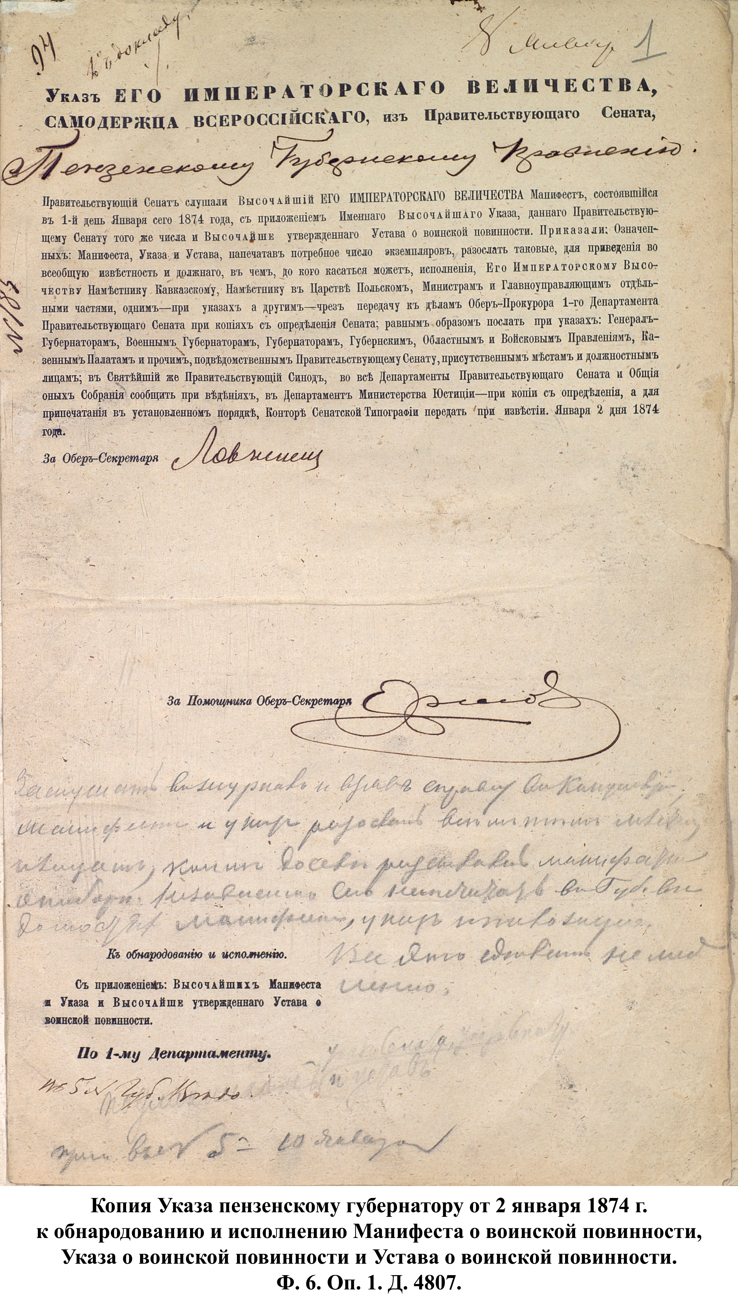 О начале военной реформы в Пензенской губернии было объявлено 10 января 1874 г. на страницах Пензенских губернских ведомостей. В последующих номерах был опубликован полный текст устава о воинской повинности и дано объявление о возможности приобрести печатный вариант устава за 15 коп. в губернской типографии.