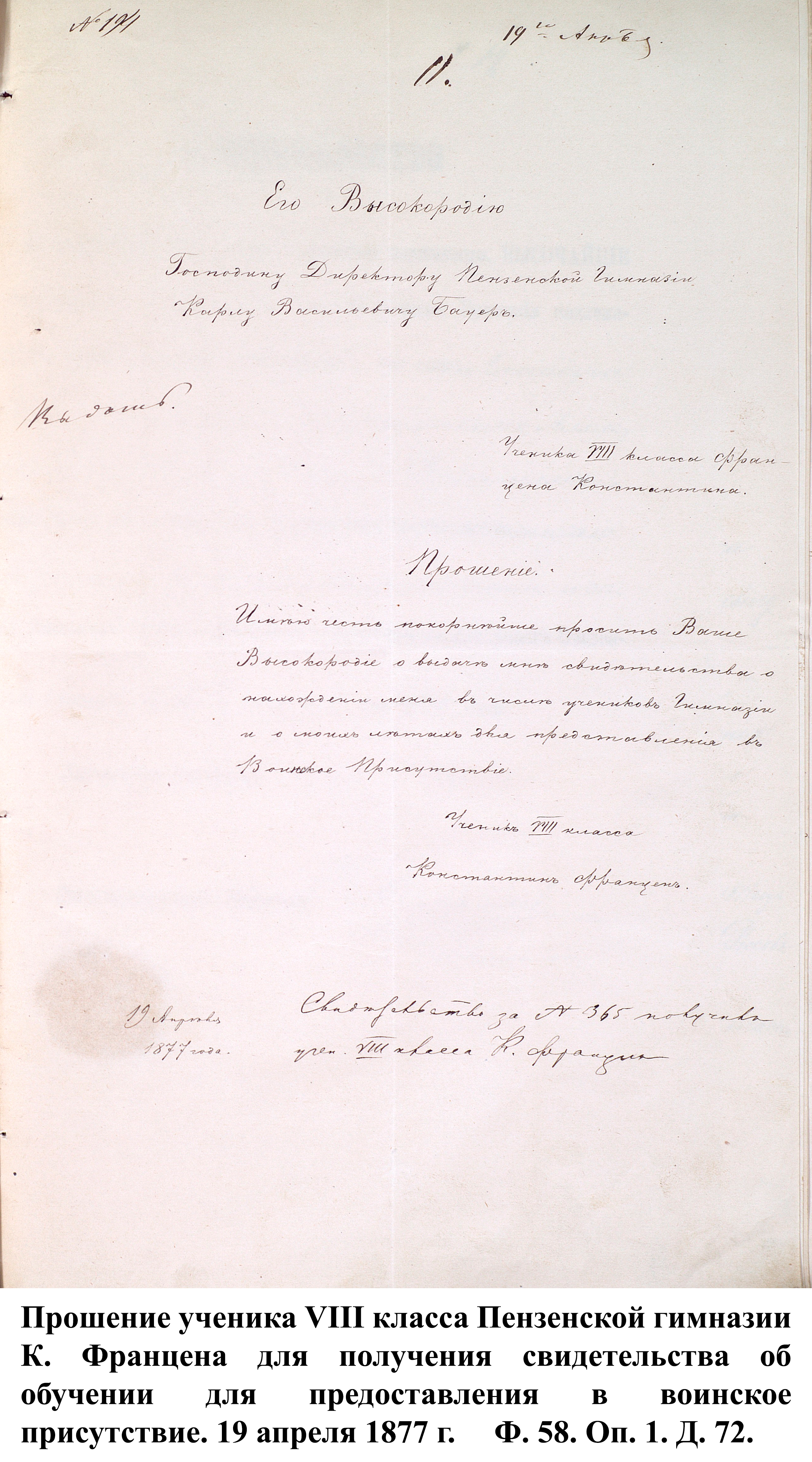 16 апреля Пензенские губернские ведомости сообщили о начале русско-турецкой войны. Согласно расписанию Казанского военного округа, в Пензенской губернии должно призваться 6041 запасных нижних чинов для войск Кавказского фронта и следующих пехотных полков: 81-й Апшеронский, 83-й Самурский, 151-й Пятигорский, 152-й Владикавказский, а также в Майкопскую команду, 7-ю бригаду, Запасную кавалерийскую и 21-ю Артиллерийскую бригады, Подвижной лазарет.