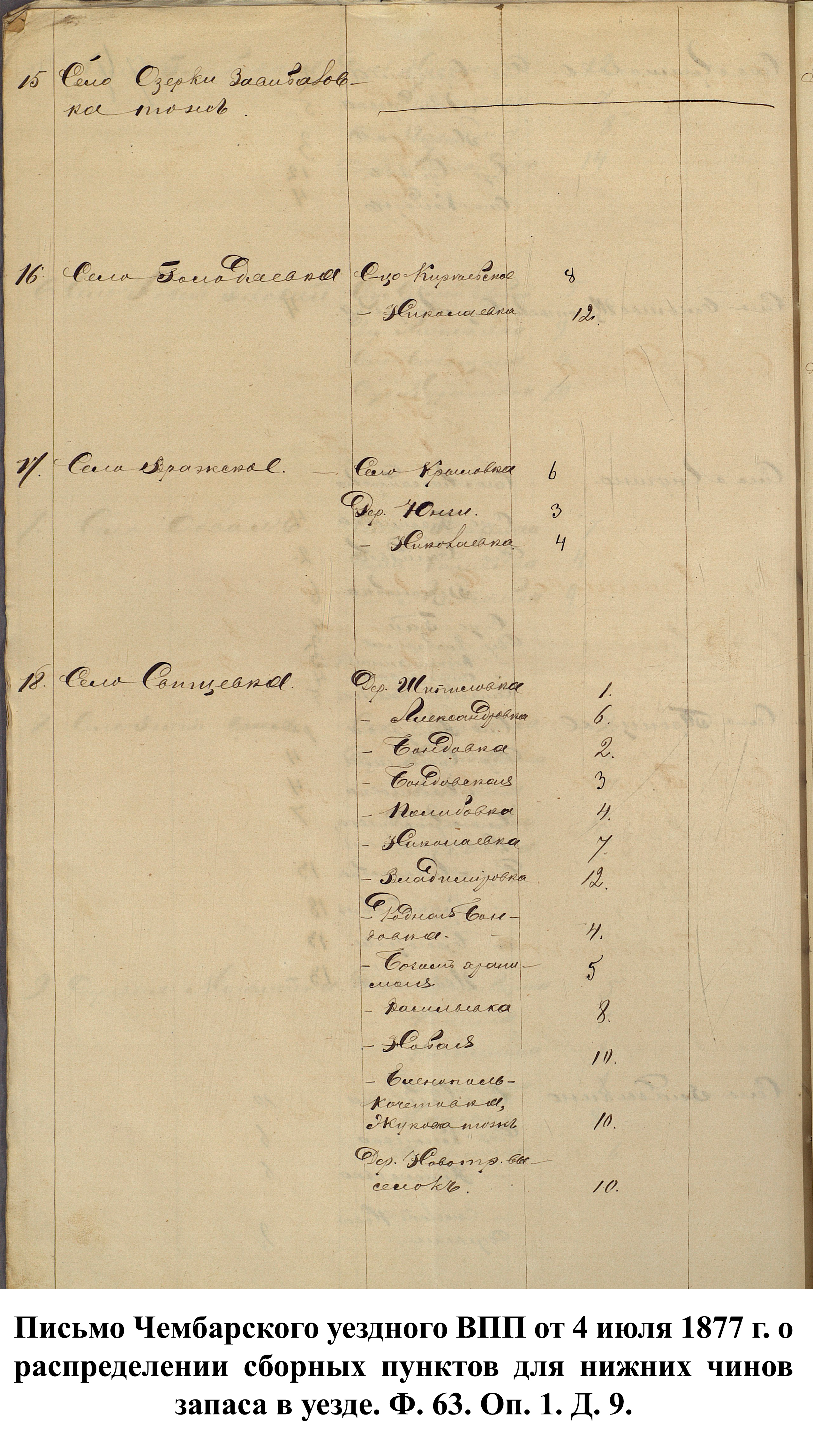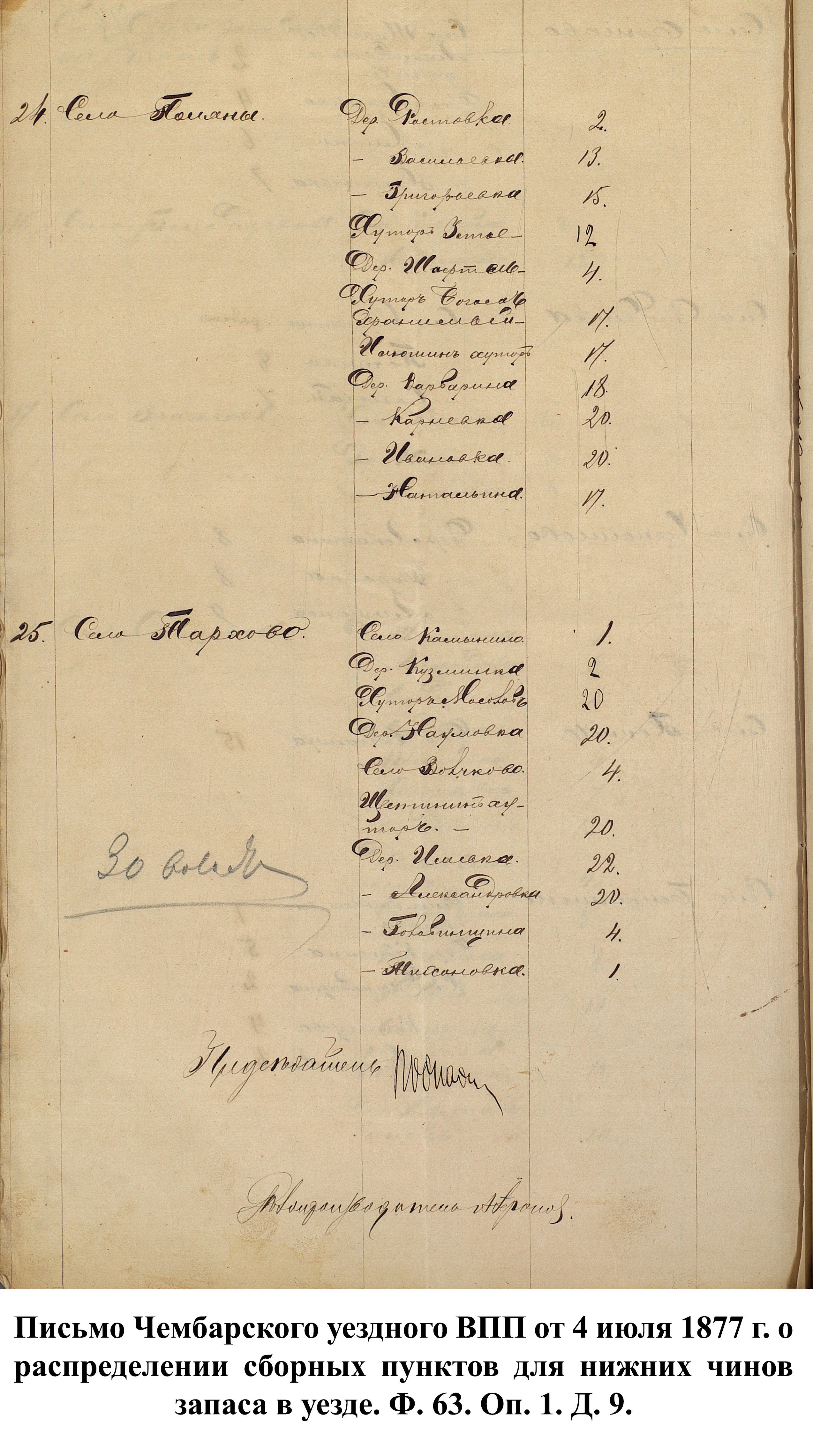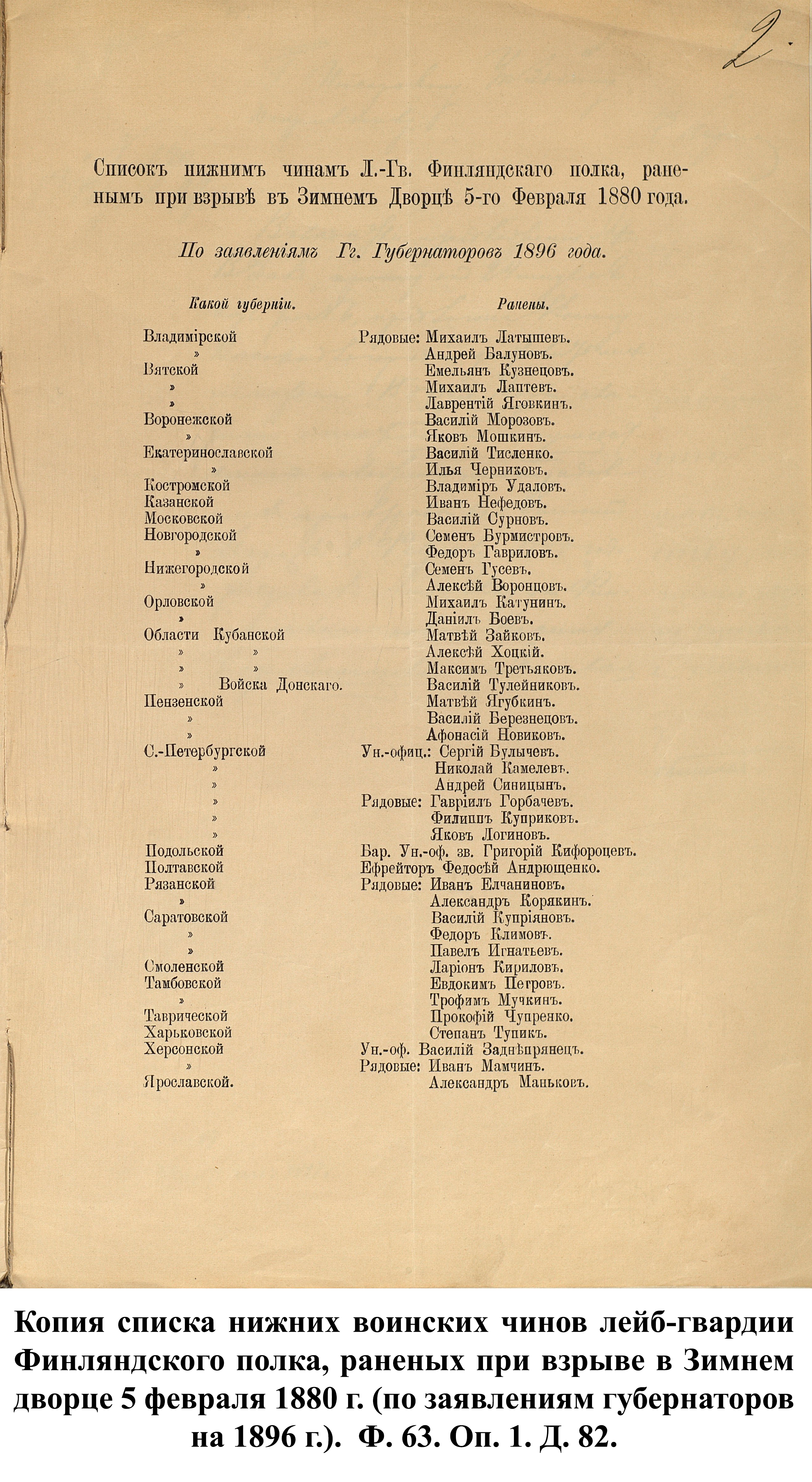 К документу был прикреплён список раненых нижних чинов, составленный из заявлений губернаторов от 1896 г. и отсортированный по губерниям: «Какой губернии: Пензенской. Матвей Ягубкин, Василий Березнецев [Березенцев] и Афанасий Новиков.