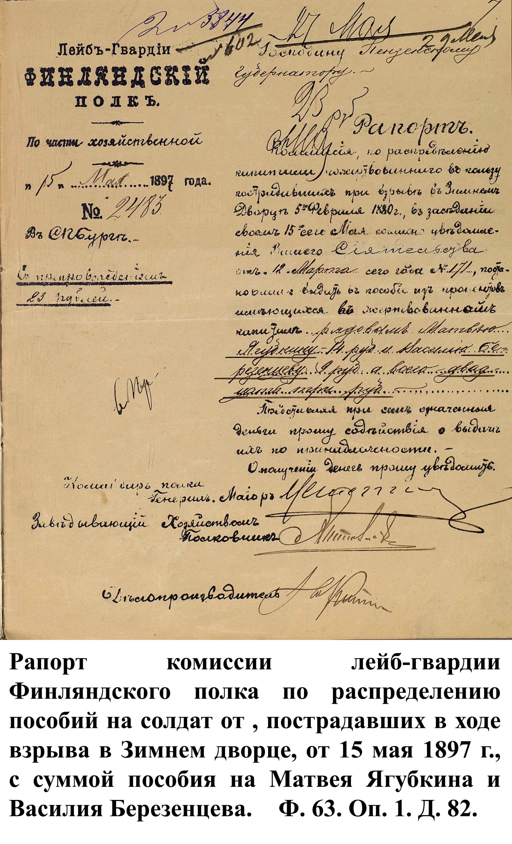 В архиве сохранилось дело о выдаче пособий отставным гвардейцам из Пензенской губернии в 1897 г. С приближением срока раздачи пособий министр внутренних дел И.Л. Горемыкин 12 января 1897 г. отправил циркуляр губернаторам, с просьбой о предоставлении сведений об имущественном положении пострадавших и членов их семей командиру лейб-гвардии Финляндского полка генерал-майору Н.Ф. Мешетичу. Все сведения необходимо было доставить не позднее 1 апреля 1897 г., изложить кратко и в соответствии с рубриками: 1) крайне нуждается; 2) нуждается; 3) обеспечен и в пособии не нуждается.