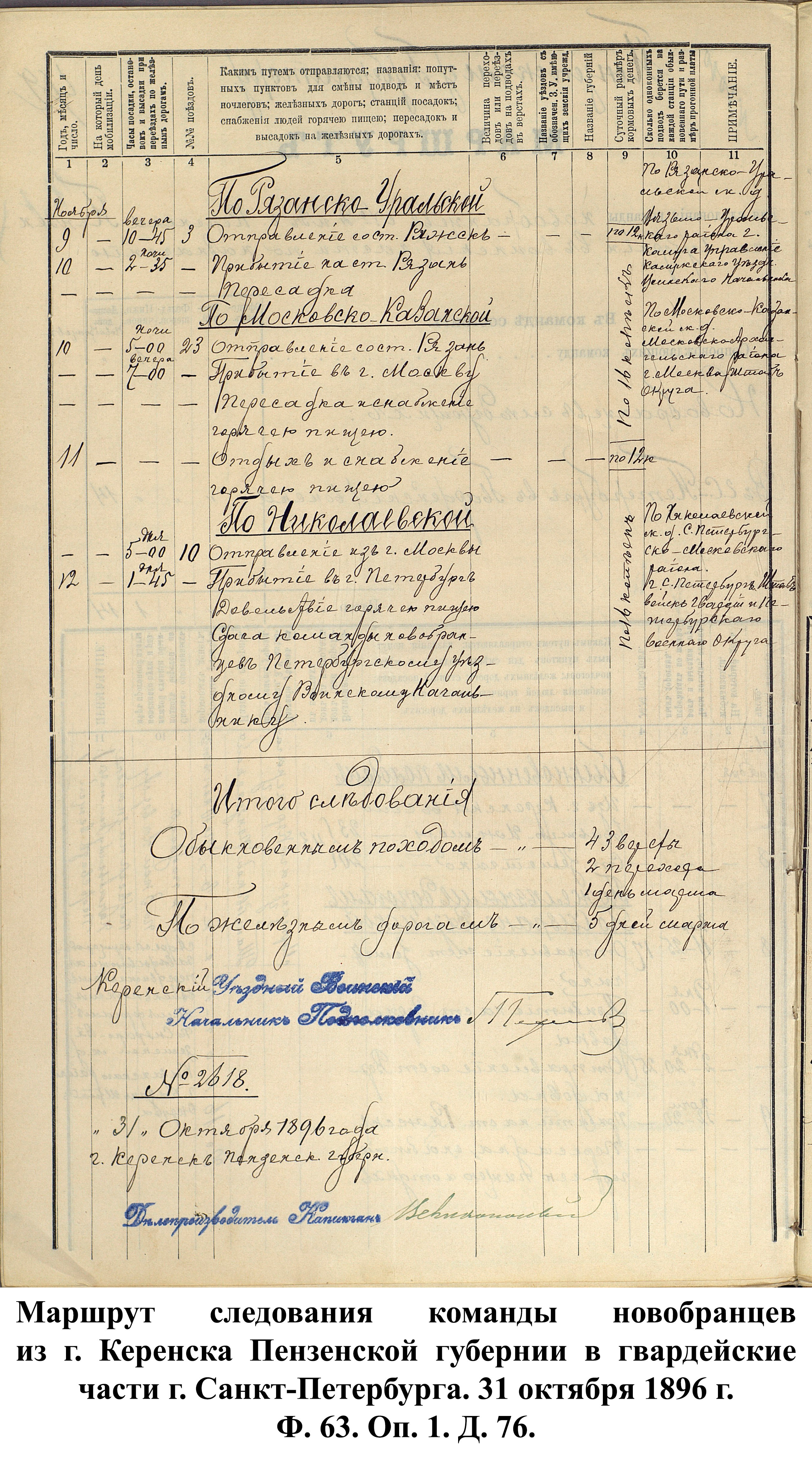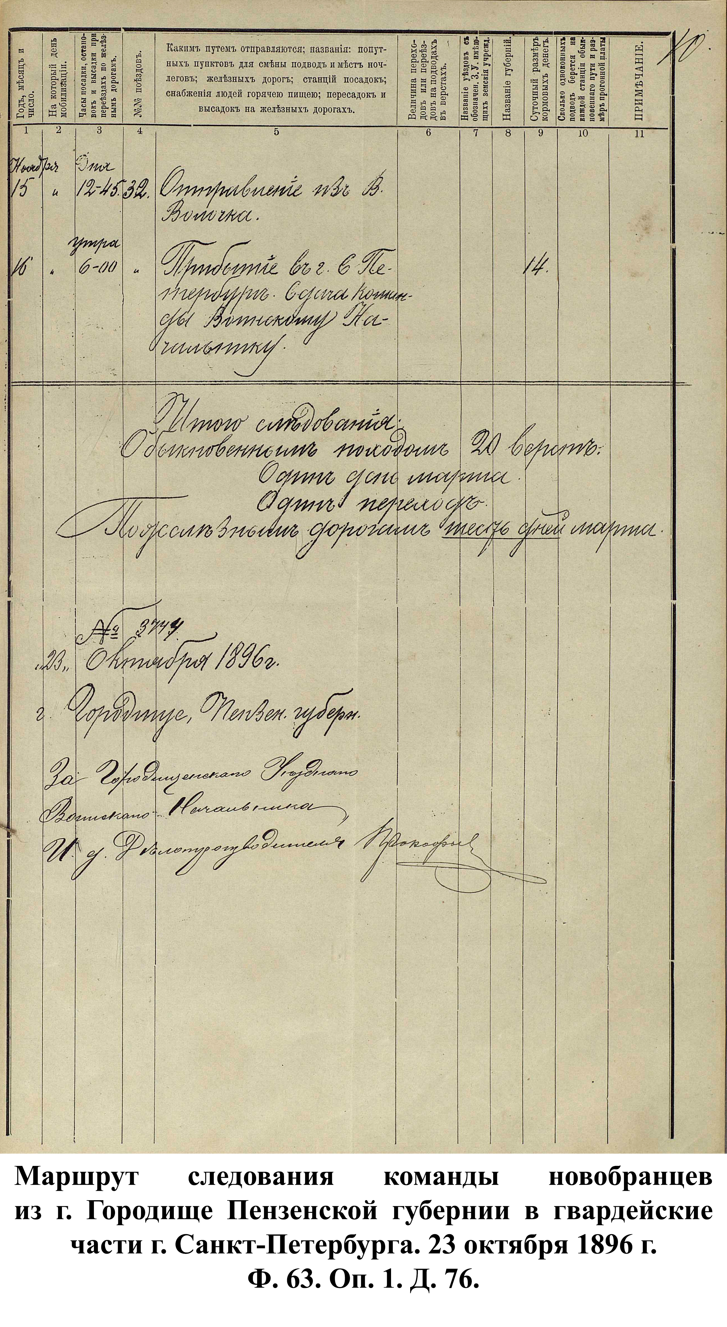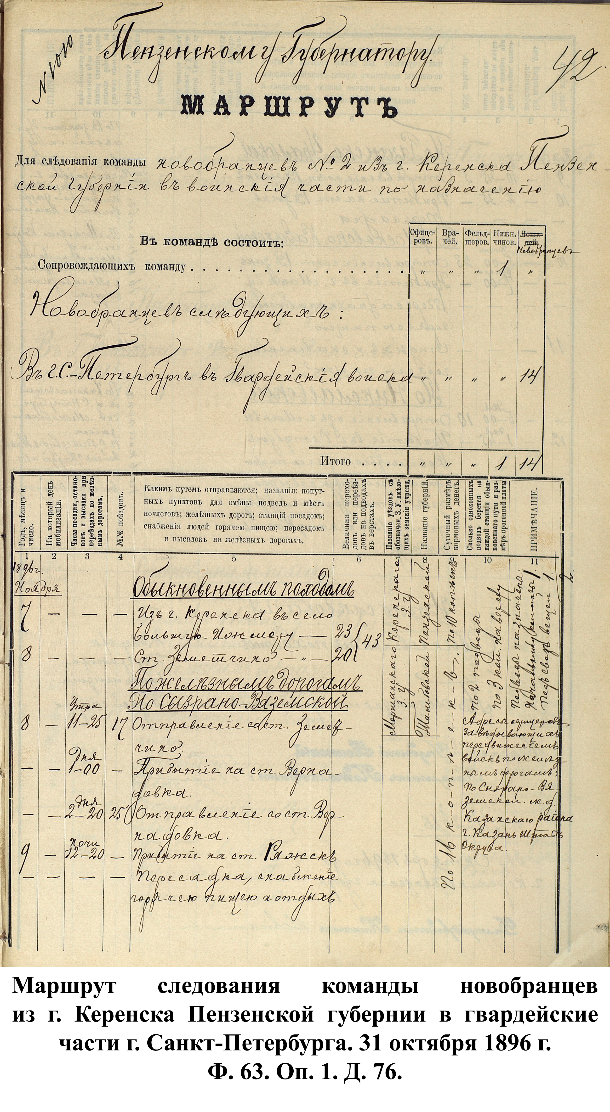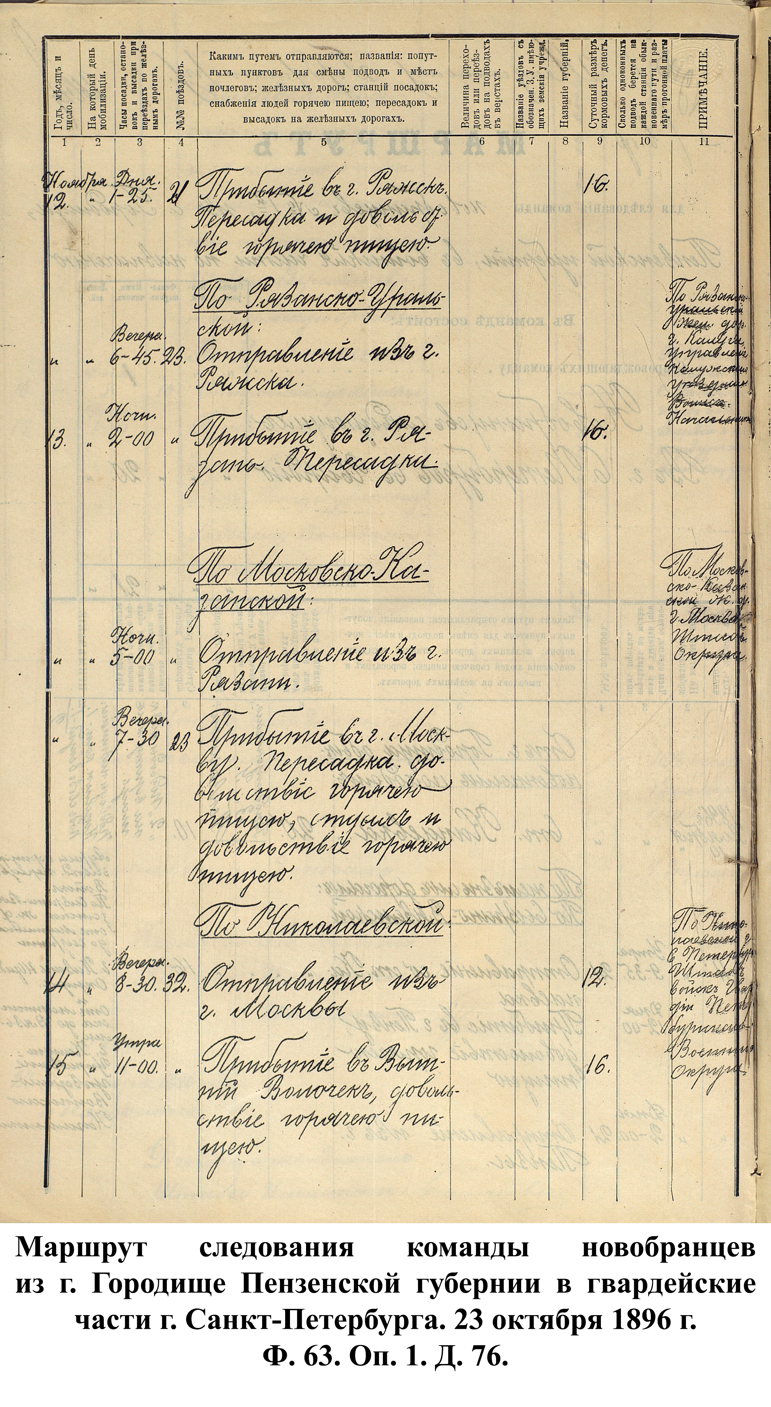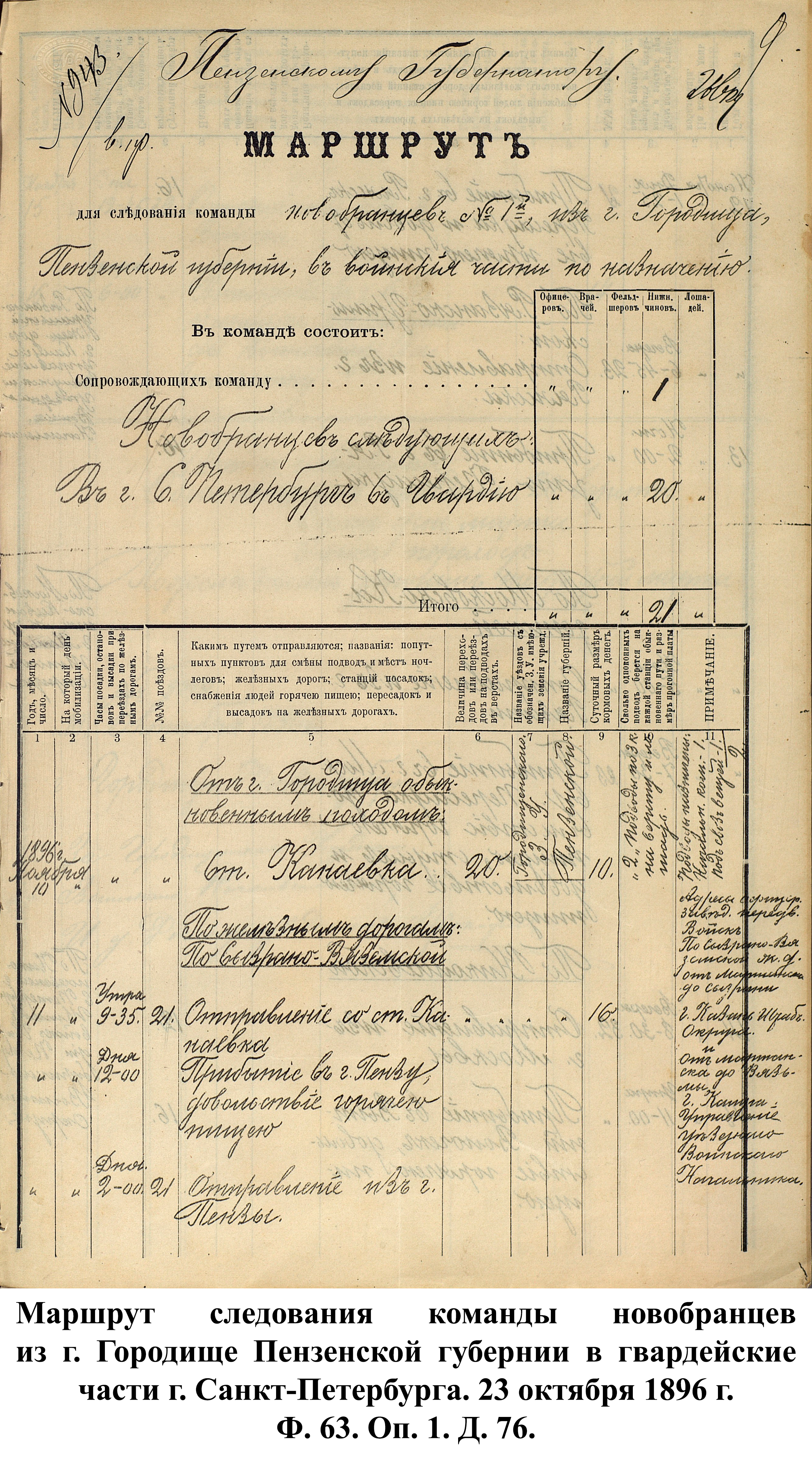 Пензенским губернским ВПП регулярно составлялись маршруты следования новобранцев в воинские части. Для препровождения в войска полагалось сопровождающая команда, численность которой зависела от количества призванных в армию. В качестве примера такого маршрута можно взять расчёт Городищенского уездного ВПП от 23 октября 1896 г. по отправке призывников из г. Городища в г. Санкт-Петербург для пополнения гвардейских частей. 10 ноября команда из 20 чел. с 1 сопровождающим выступала обыкновенным походом в 21,3 км из г. Городища к ст. Канаевка. Во время пешего перехода новобранцам выдавались кормовые деньги по 10 коп. на человека. Для пешего перехода выделялись 2 одноконных подвода (для начальника команды и вещей) с оплатой 3 коп. за пройденную версту и лошадь. 11 ноября в 9:35 команда отправлялась со ст. Канаевка до ст. Пенза по Сызранско-Вяземской железной дороге. С пересадкой на поезд выдача кормовых составляла от 12 до 16 коп. в сутки. В 12:00 этого же дня – прибытие в г. Пензу и довольствие горячей пищей, в 14:00 – отправление со станции. 12 ноября в 13:25 – остановка в г. Ряжск Рязанской губернии, приём пищи и пересадка на Рязанско-Уральскую ж.д. Отбытие из г. Ряжска в 18:45, прибытие в г. Рязань 13 ноября в 2:00 ночи и пересадка. Через 3 часа команда продолжала свой путь по Московско-Казанской ж.д. до г. Москвы, запланированное время прибытия: 19:30. В Москве предполагался суточный отдых с 2 приёмами горячей пищи и пересадкой на Николаевскую ж.д. Отправление из Москвы – 14 ноября в 20:30 с. В 11:00 следующего дня – остановка и обеспечение горячей пищей в г. Вышний Волочёк Тверской губернии, в 12:45 – отбытие до конечного пункта назначения – г. Санкт-Петербурга, где 16 ноября в 6:00 утра городищенские призывники передавались в распоряжение местного воинского начальника . Весь путь занимал более 6 дней и предполагал обеспечение призванных 5 приёмами горячей пищи, а также выдачу кормовых денег общей суммой 1 руб. на человека.