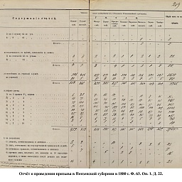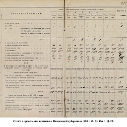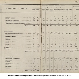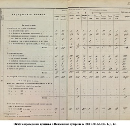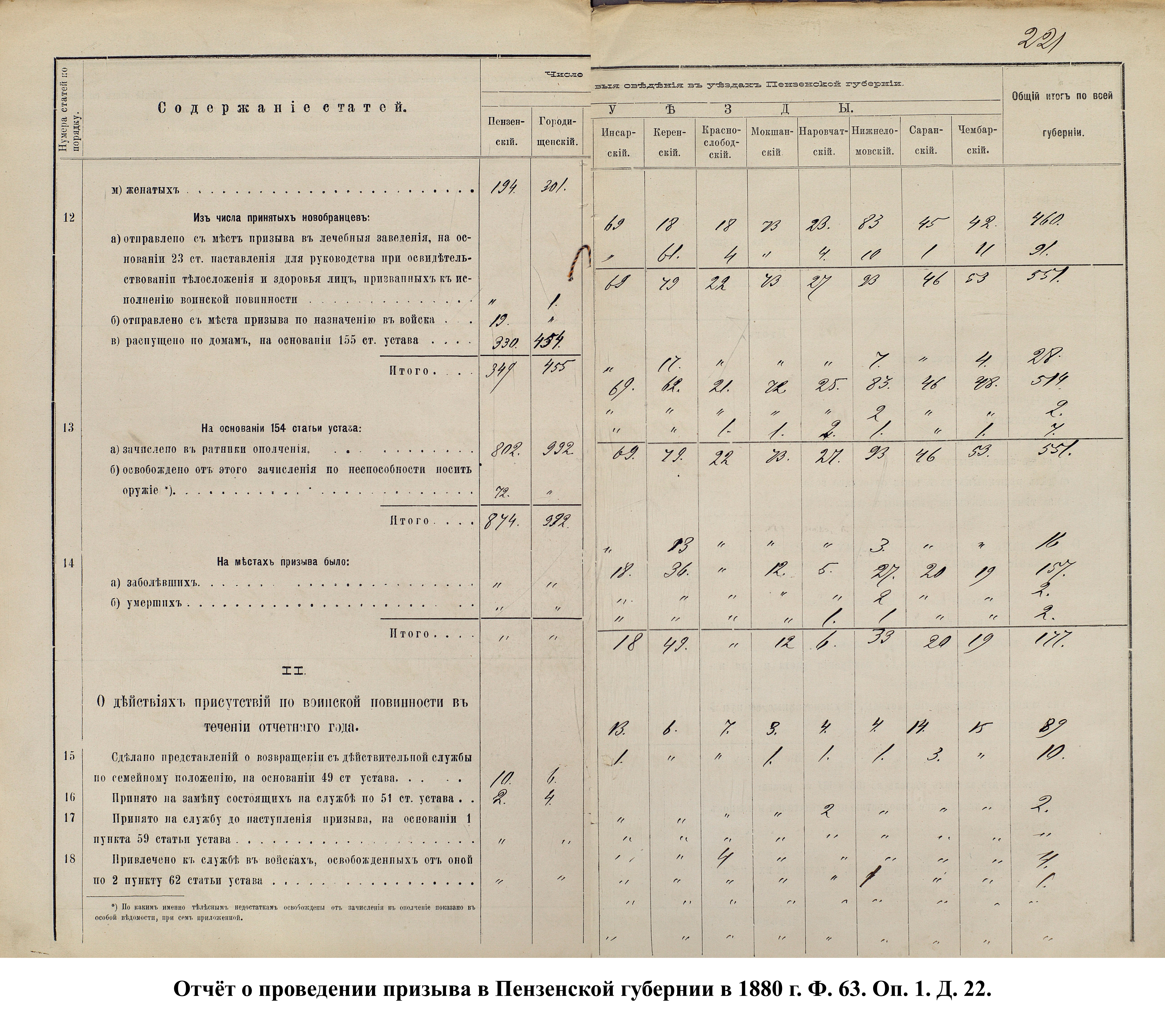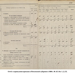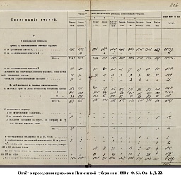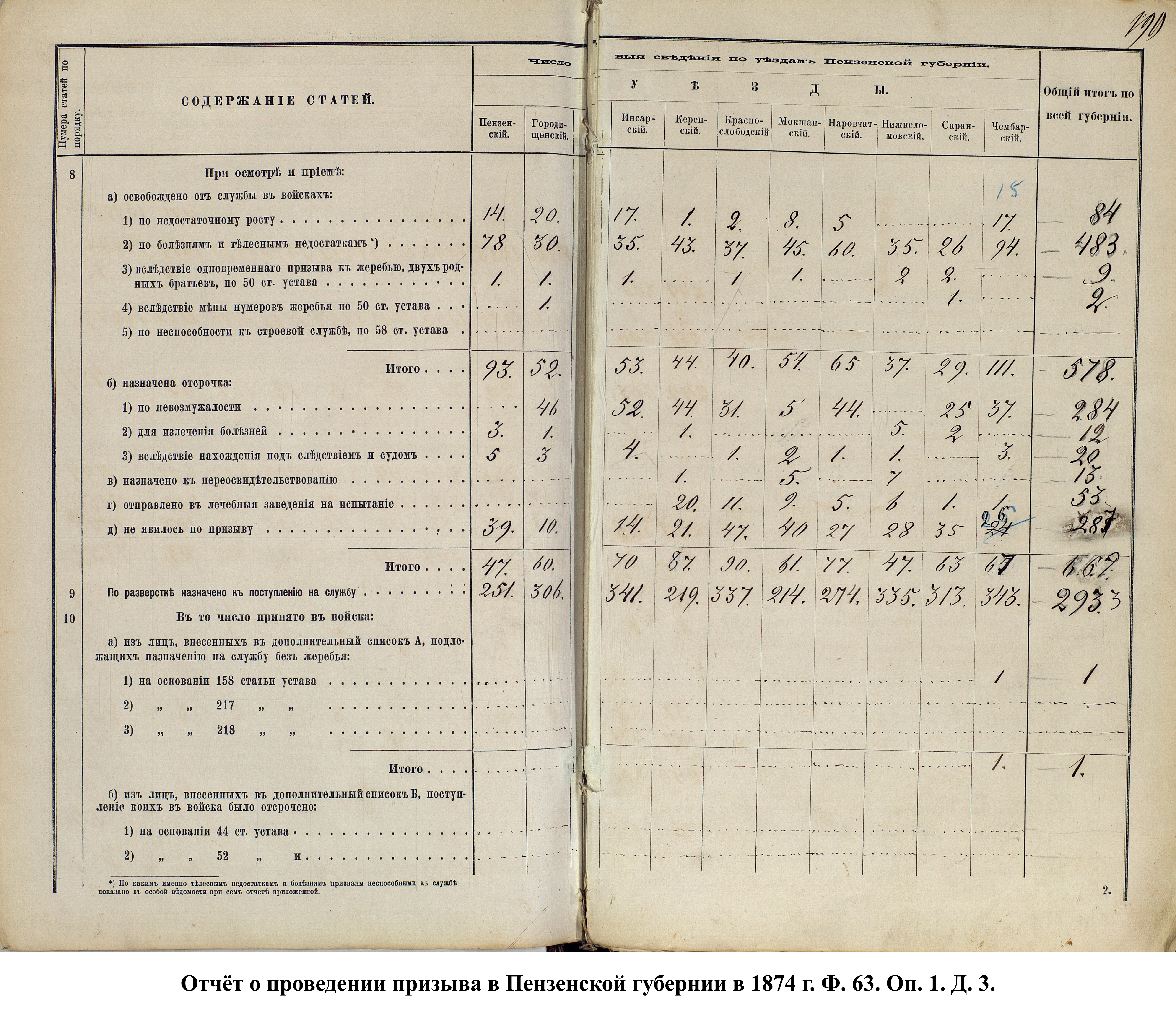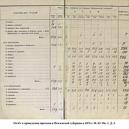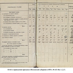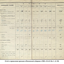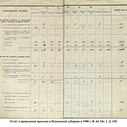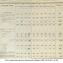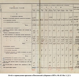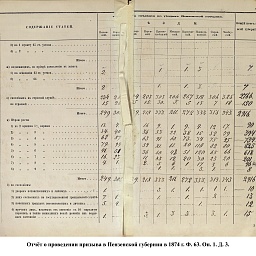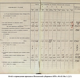 В первый призыв 1874 г. в Пензенской губернии по спискам к исполнению воинской службы подлежало 14049 чел. Из них, после исключения получивших отсрочку, тянули жребий 13674 чел. 287 призывников не явилось на призывной пункт. В числе внесенных в призывные списки значились льготы по семейному положению: I разряда – 4194, II – 2550, III – 1008. При осмотре и приёме освобождены от службы в войсках по недостаточному росту – 84 чел., вследствие болезней – 483, по перемене жребия или одновременному призыву двух родных братьев – 11. Всего на службу было зачислено 2916 новобранцев. В ополчение было зачислено 9419 ратников, 357 чел. освобождены от воинской службы по неспособности носить оружие. Общие расходы по обустройству и содержанию уездных ВПП в год проведения реформы составили 4171 руб. 66 коп.