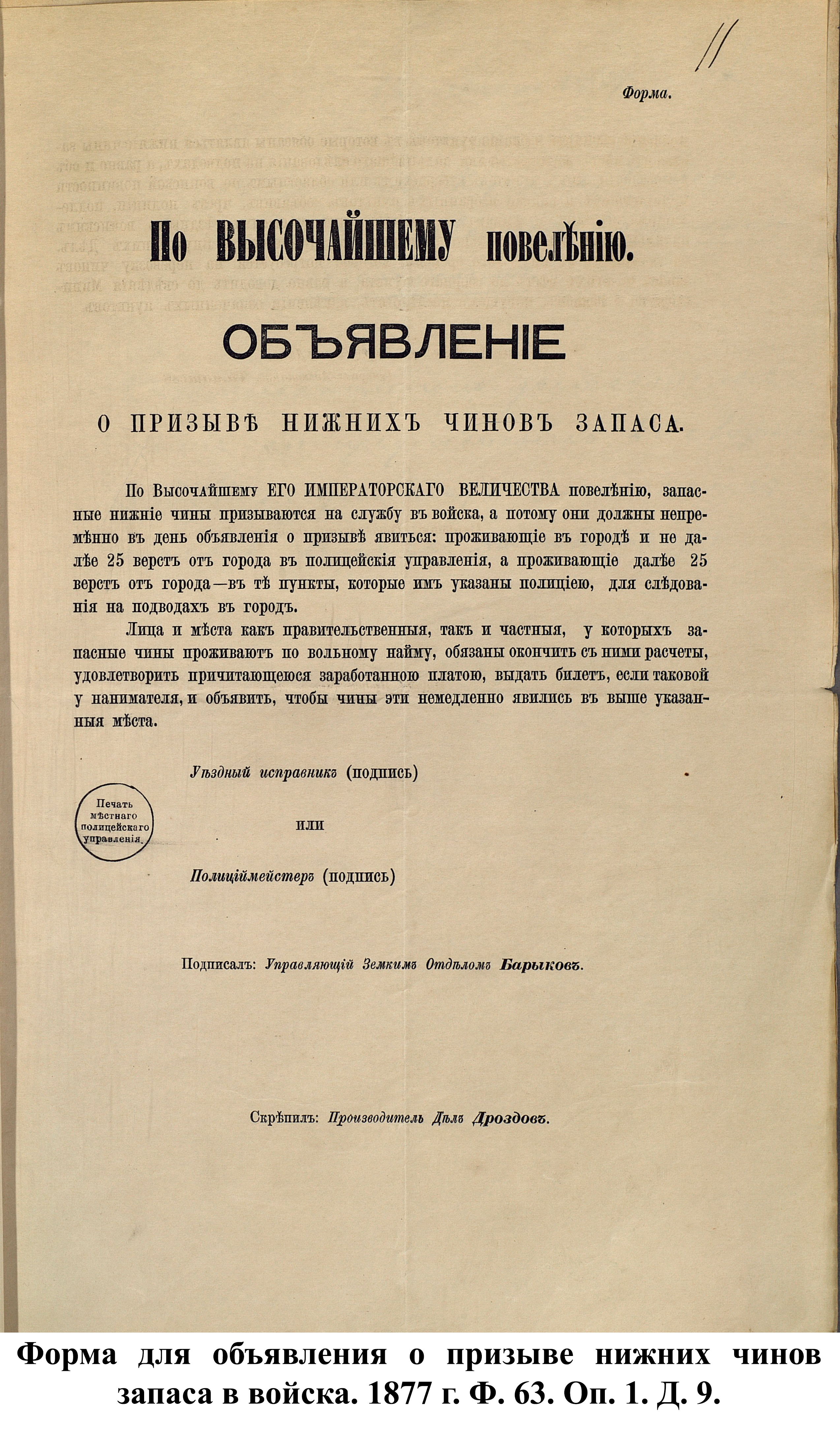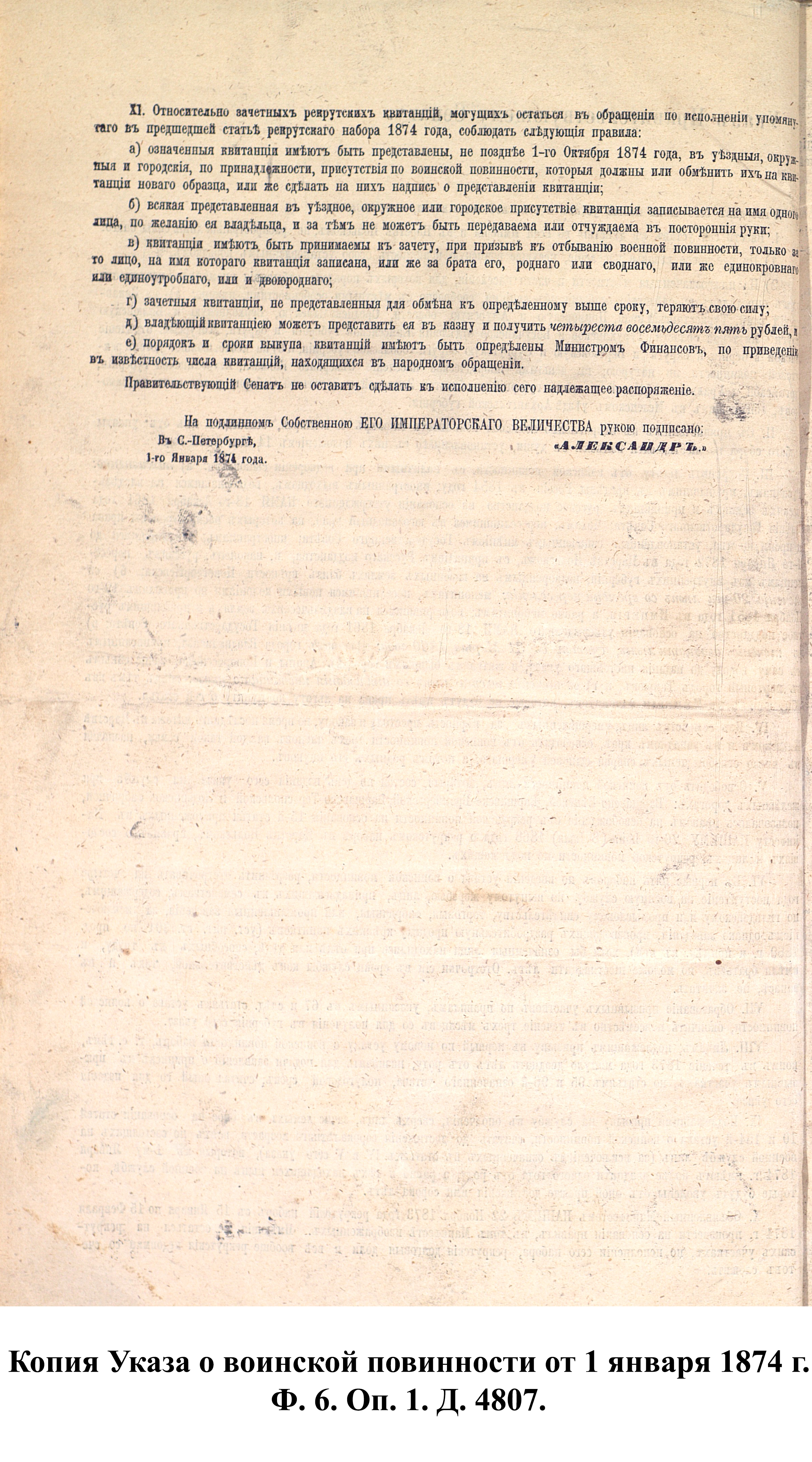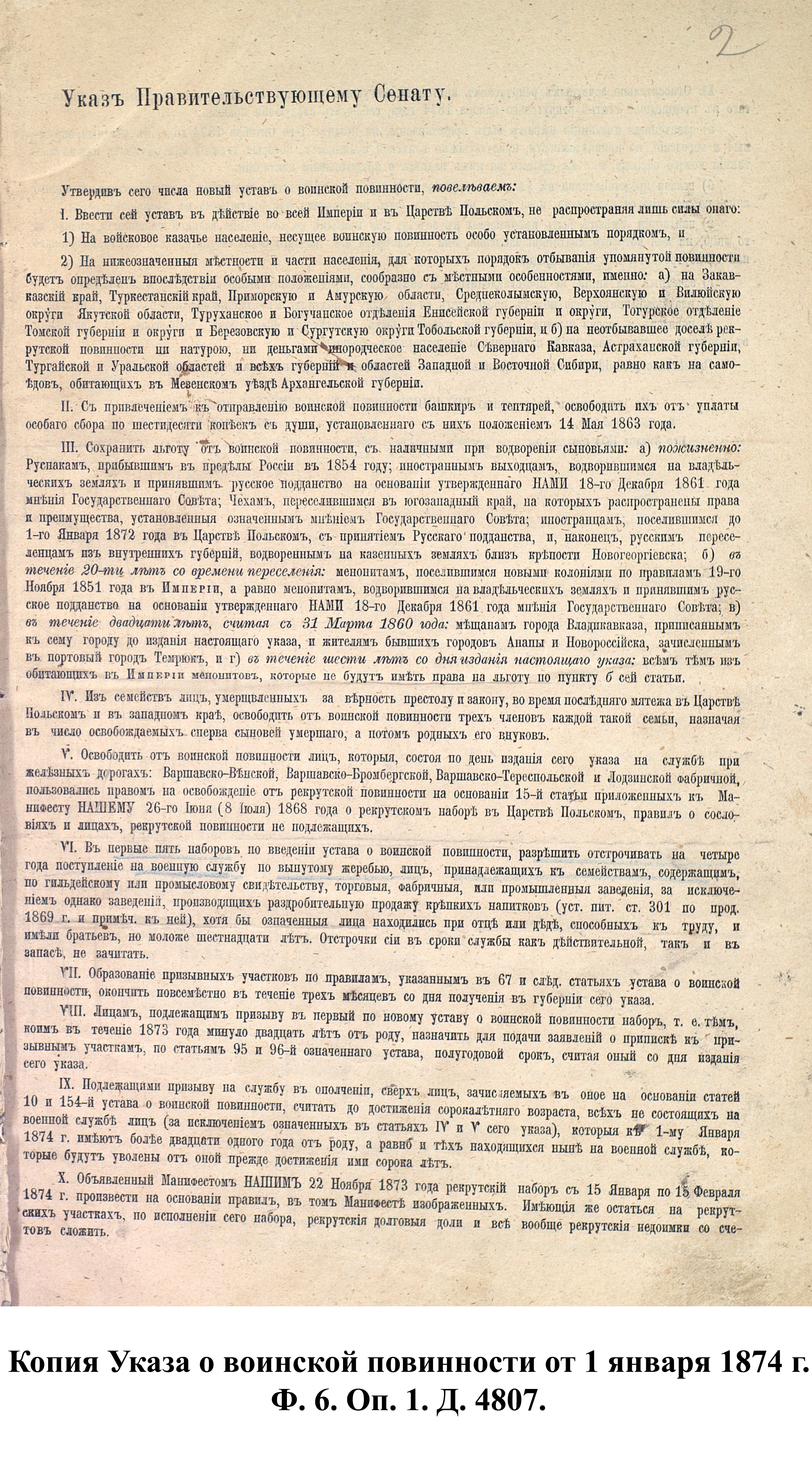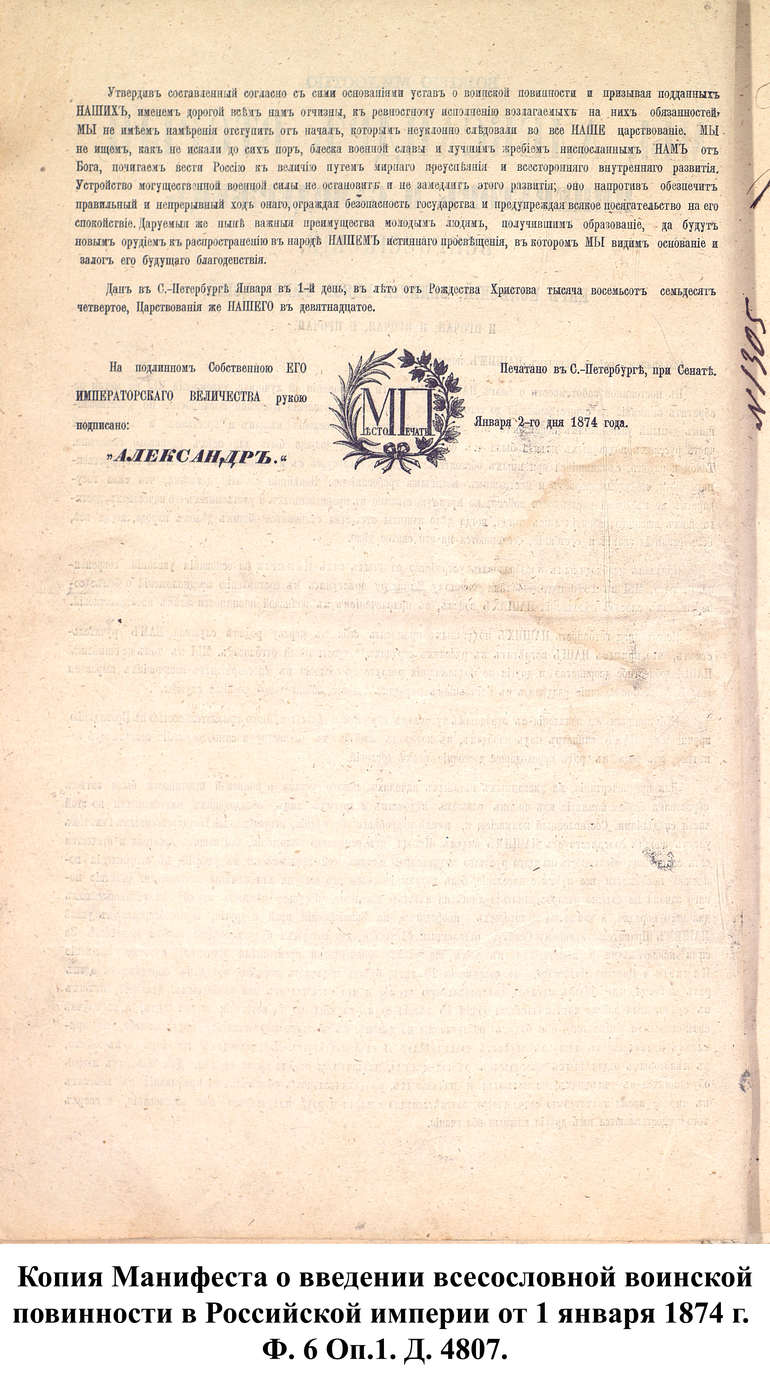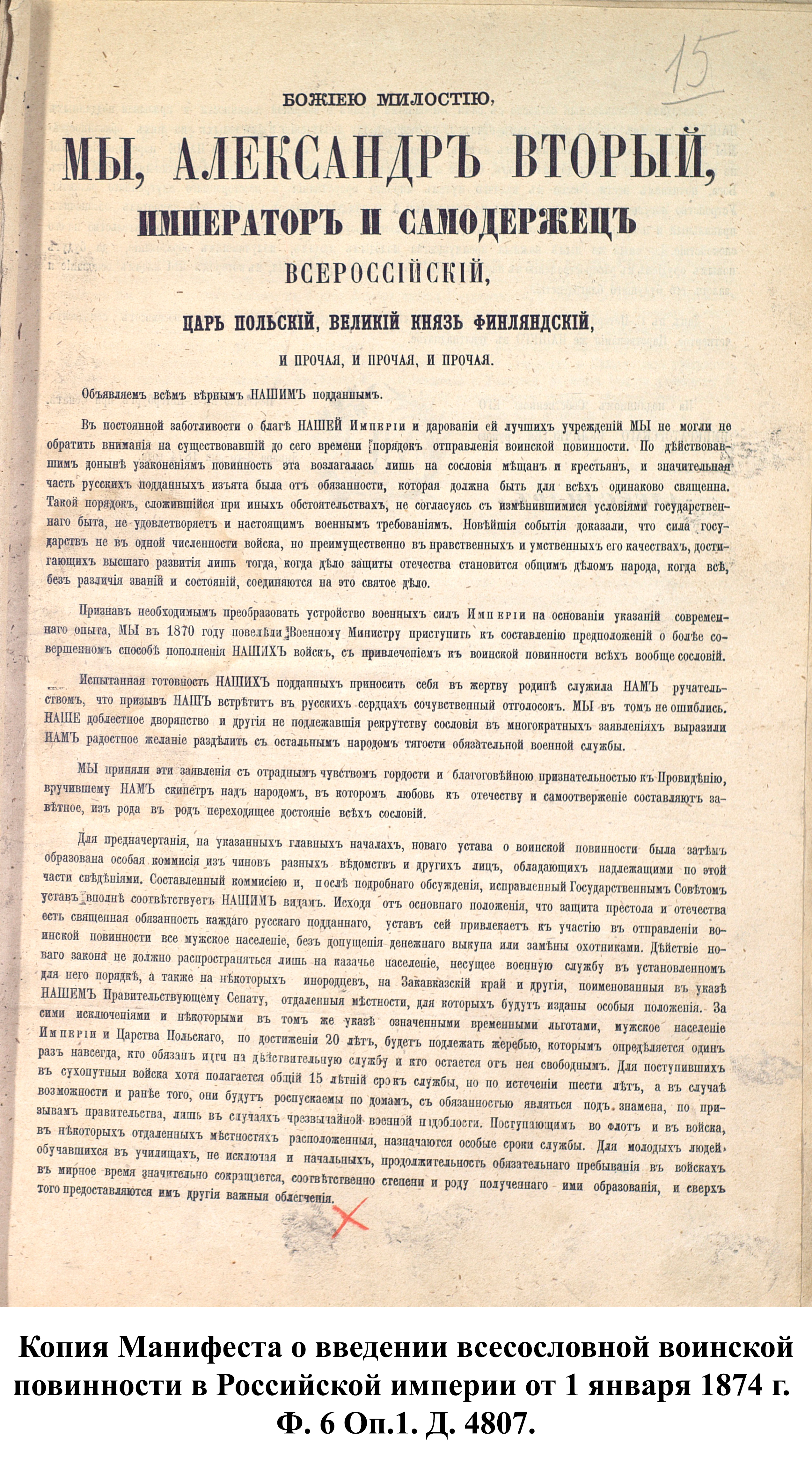 1 января 1874 г. император Александр II подписал «Манифест о введении всеобщей воинской повинности», в соответствии с которым в Российской империи устанавливалась всесословная воинская повинность мужского населения. В тот же день был утверждён «Устав о воинской повинности», объявивший, что «защита престола и отечества есть священная обязанность каждого русского подданного. Мужское население без различия состояний подлежит воинской повинности…». Главной задачей реформы, по словам военного министра Д.А. Милютина, было «дать армии такой состав, чтобы при наименьшей численности в мирное время она могла в случае надобности развернуть наибольшие силы и притом в кратчайший по возможности срок». Т.е. небольшая регулярная армия мирного времени, при необходимости, могла стать массовой и иметь значительный резерв для восполнения потерь в ходе войны.