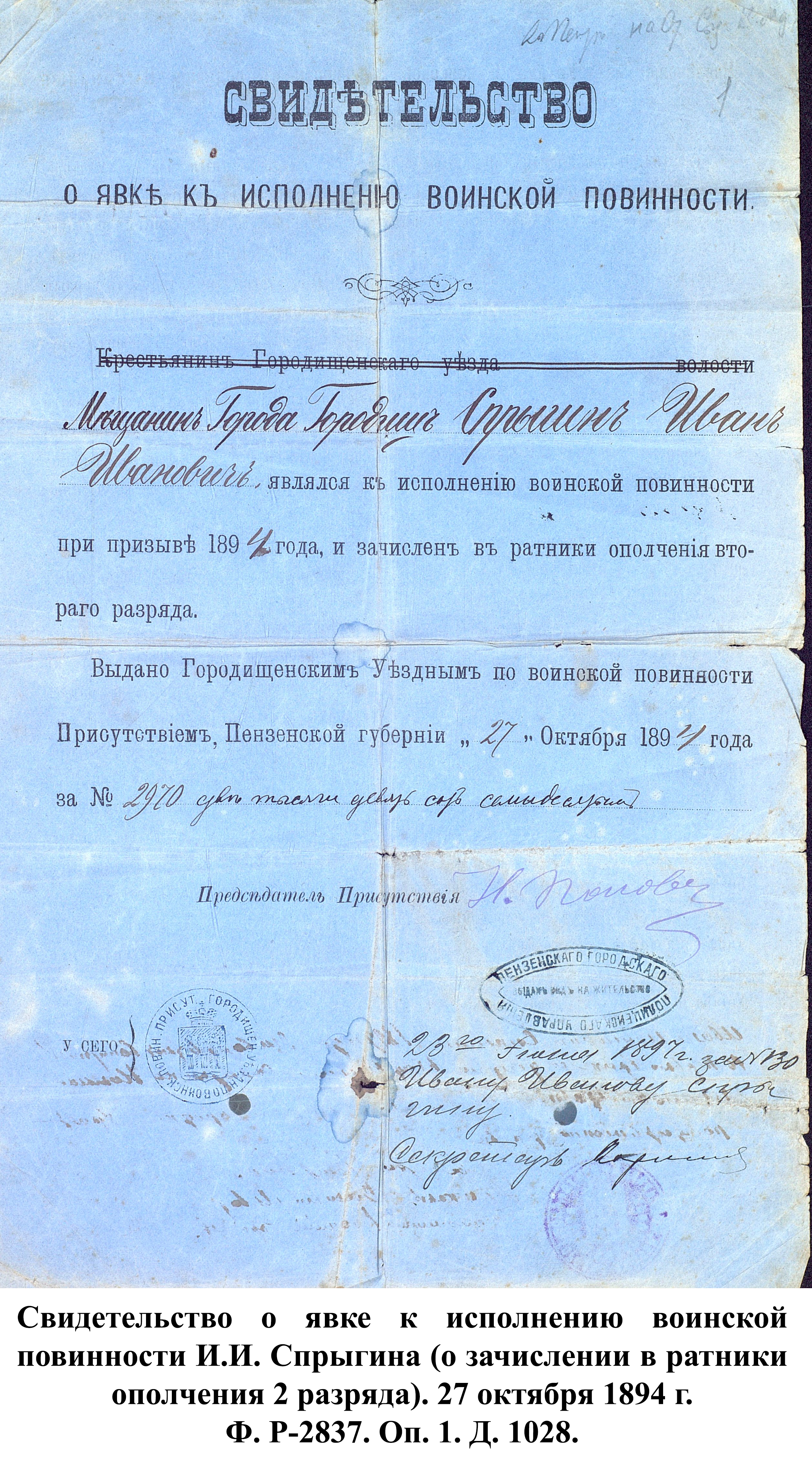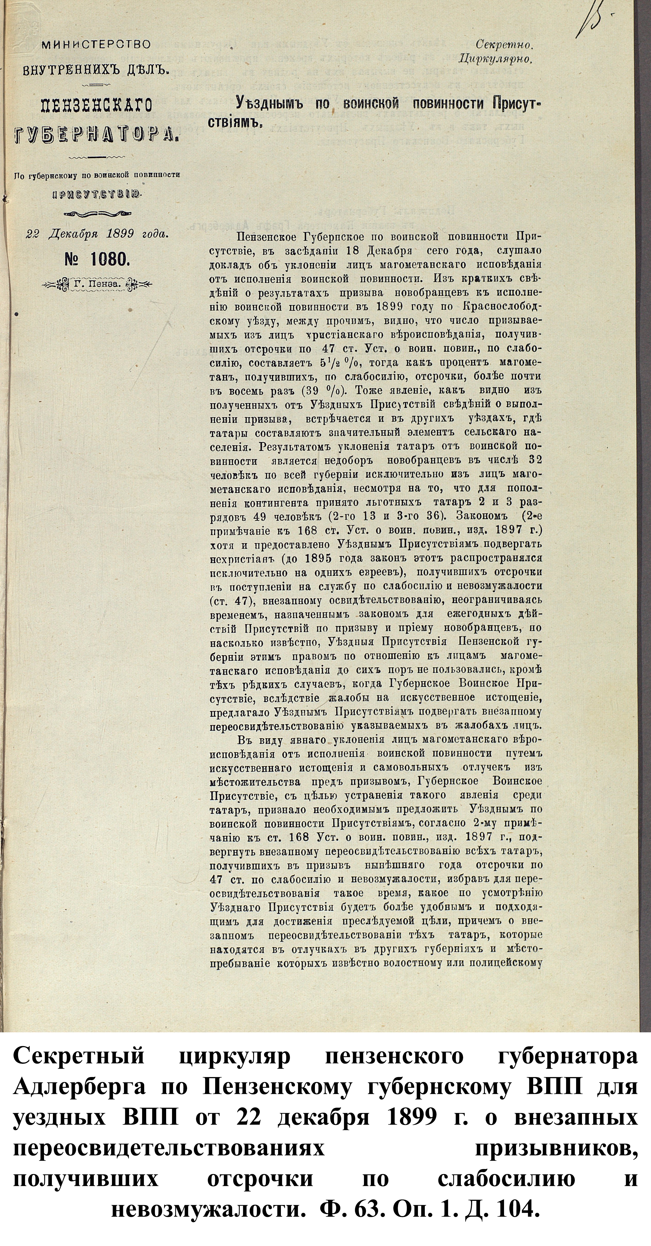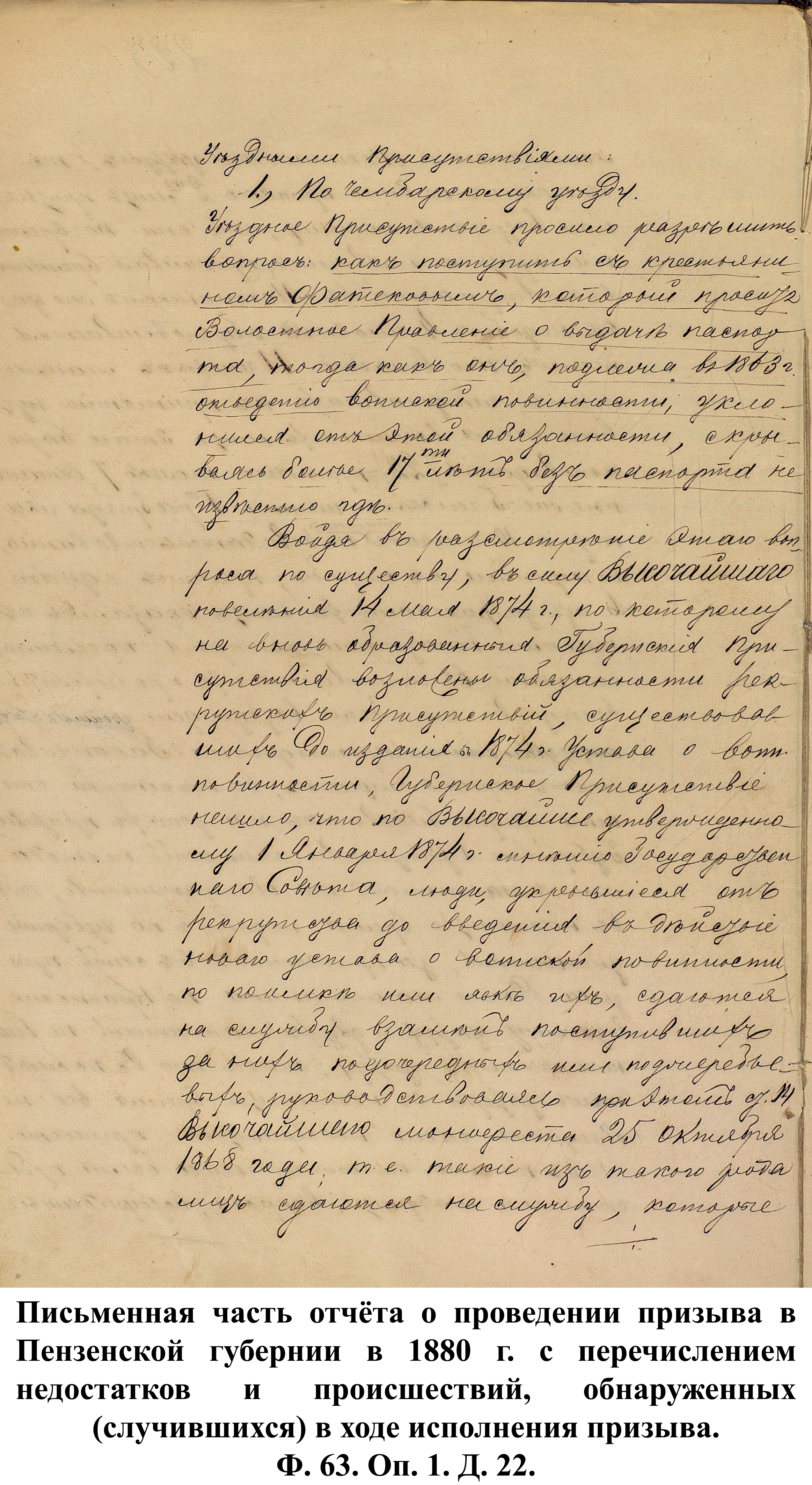 «…защита престола и Отечества есть священная обязанность каждого русского подданного»… Деятельность Пензенского губернского по воинской повинности присутствия