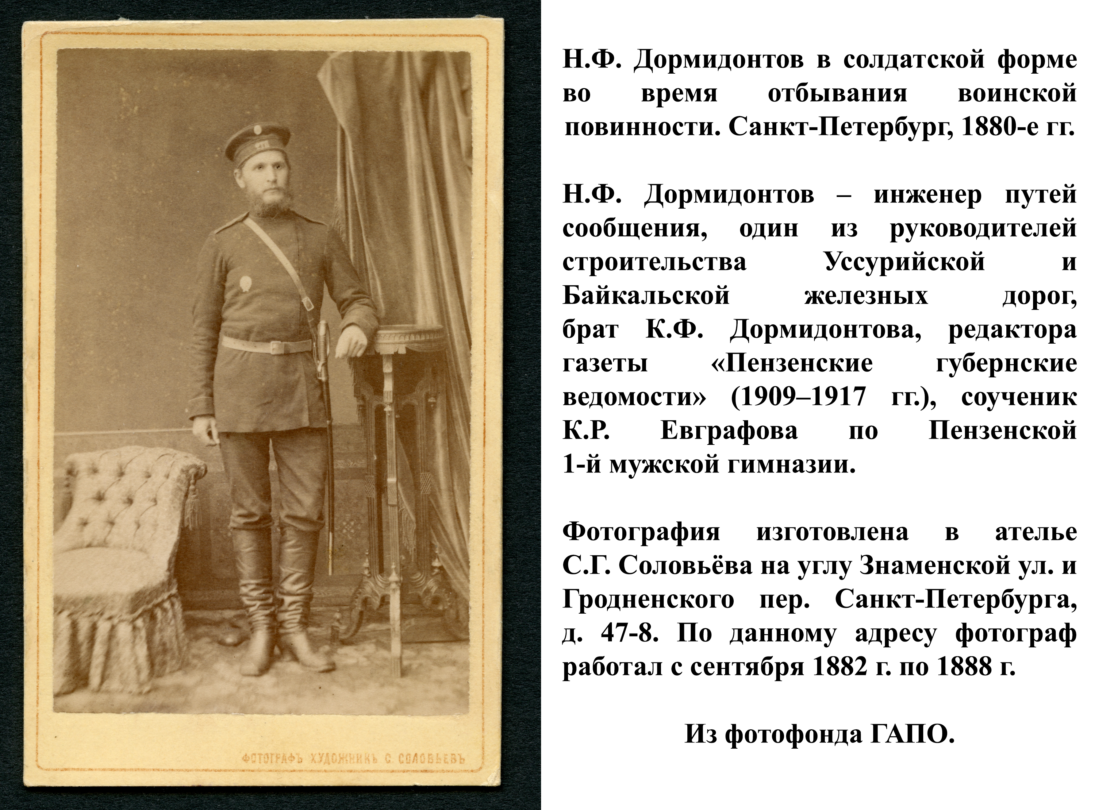 Н.Ф. Дормидонтов – инженер путей сообщения, один из руководителей строительства Уссурийской и Байкальской железных дорог, брат К.Ф. Дормидонтова, редактора газеты «Пензенские губернские ведомости» (1909–1917 гг.), соученик К.Р. Евграфова по Пензенской 1-й мужской гимназии.