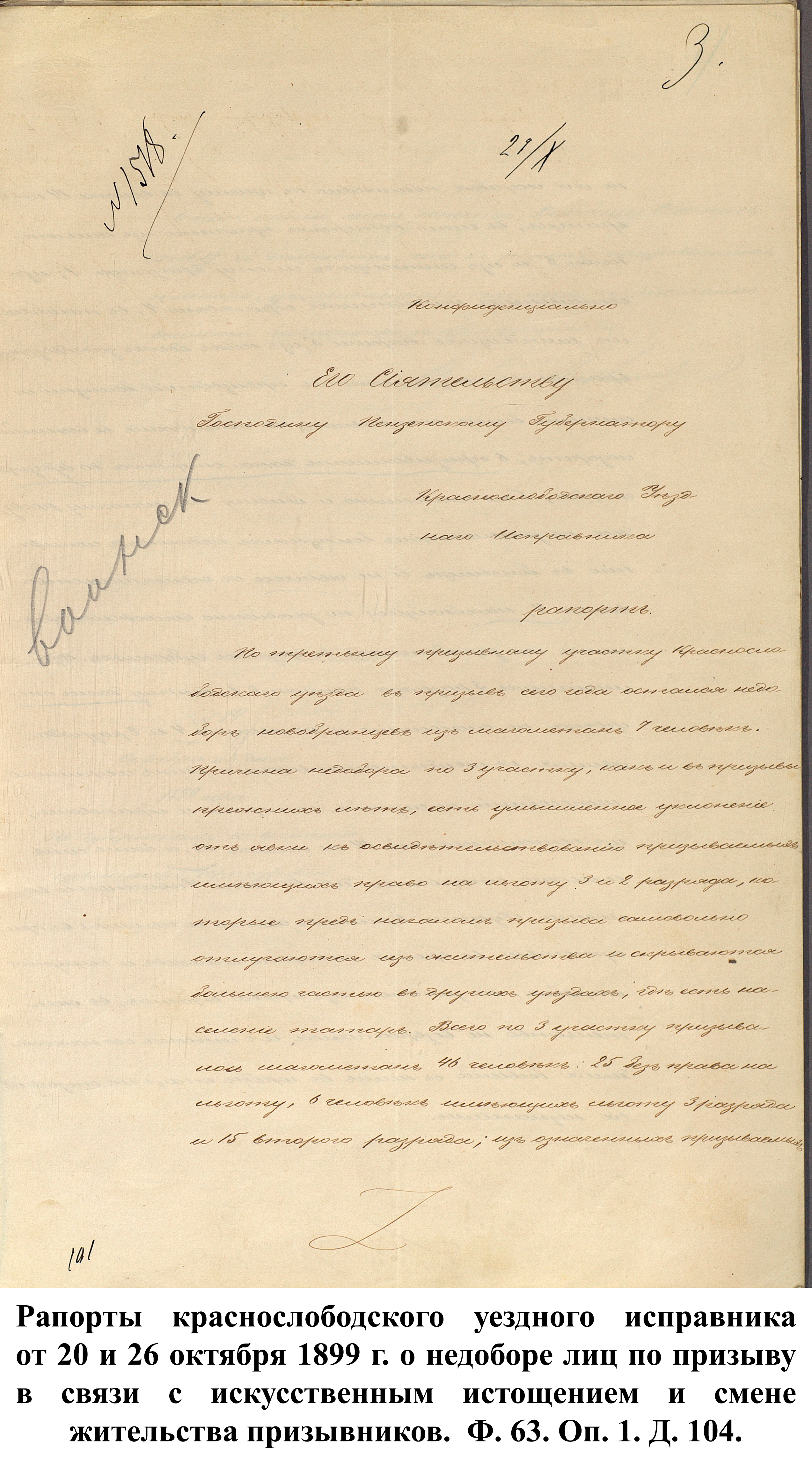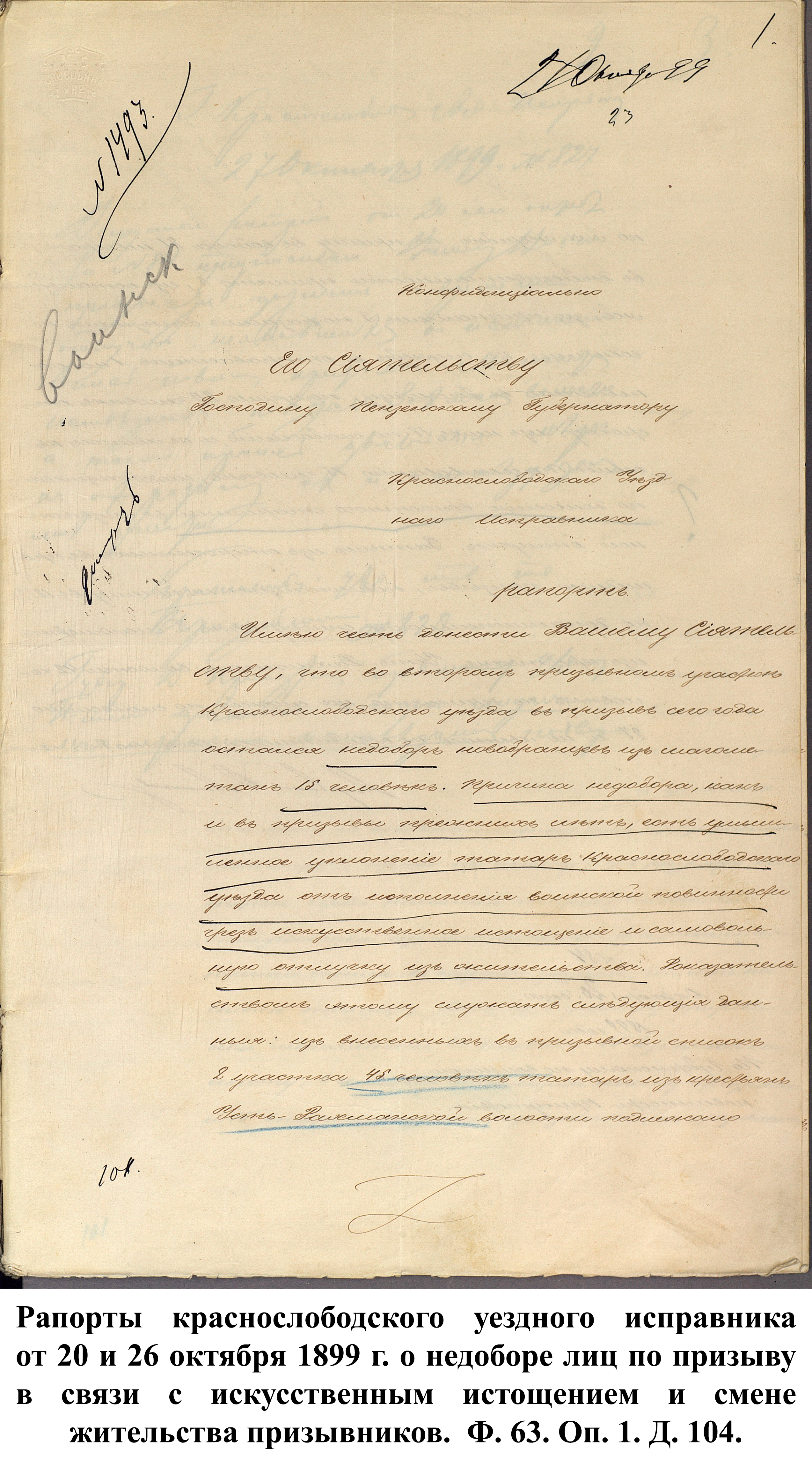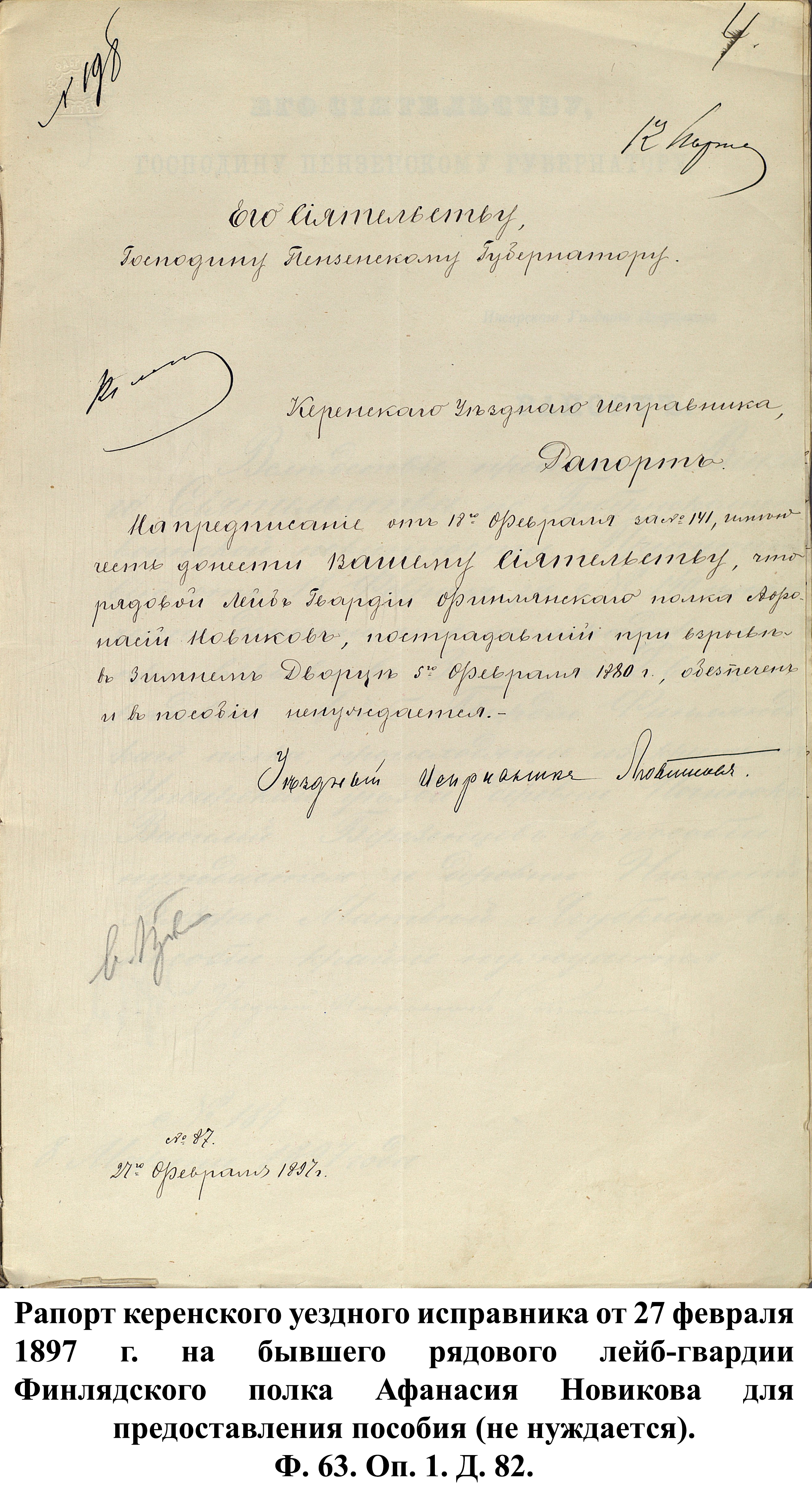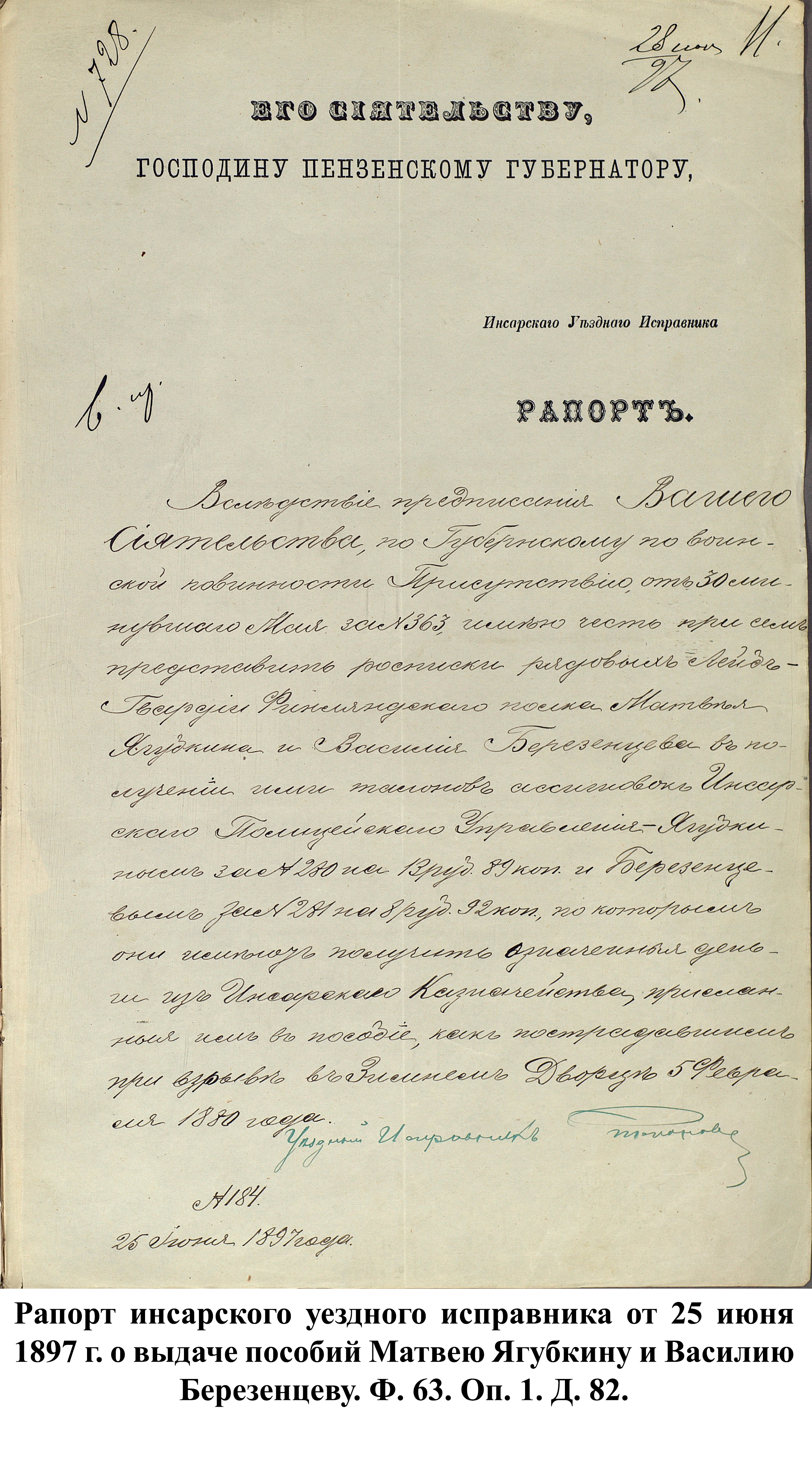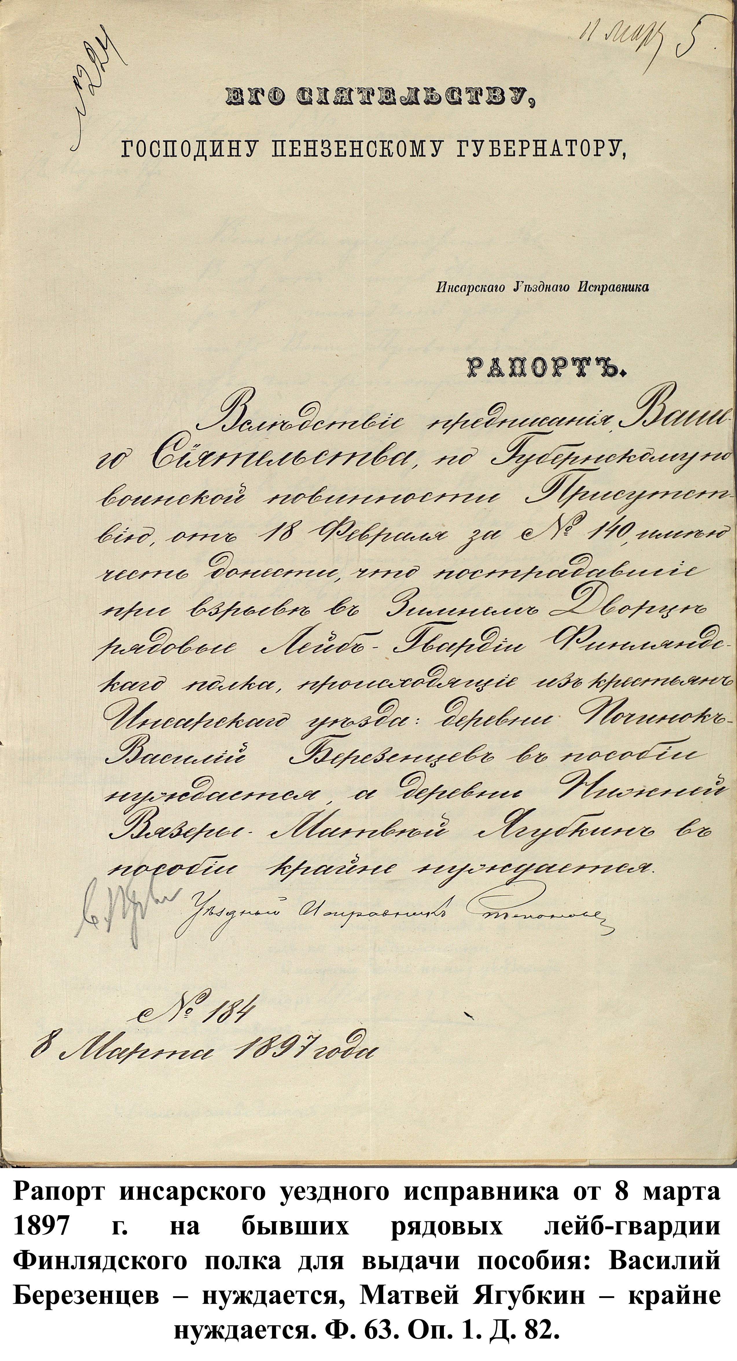 Первый рапорт от 28 февраля 1896 г., написанный Керенским уездным исправником для пензенского губернатора П.Д. Святополка-Мирского, гласил: «…рядовой лейб-гвардии Финляндского полка Афанасий Новиков… …обеспечен и в пособии не нуждается…». 8 марта Инсарский уездный исправник отчитался, что житель д. Починки В. Березенцев нуждается в пособии, а М. Ягубкин, уроженец д. Нижняя Вязера – крайне нуждается.