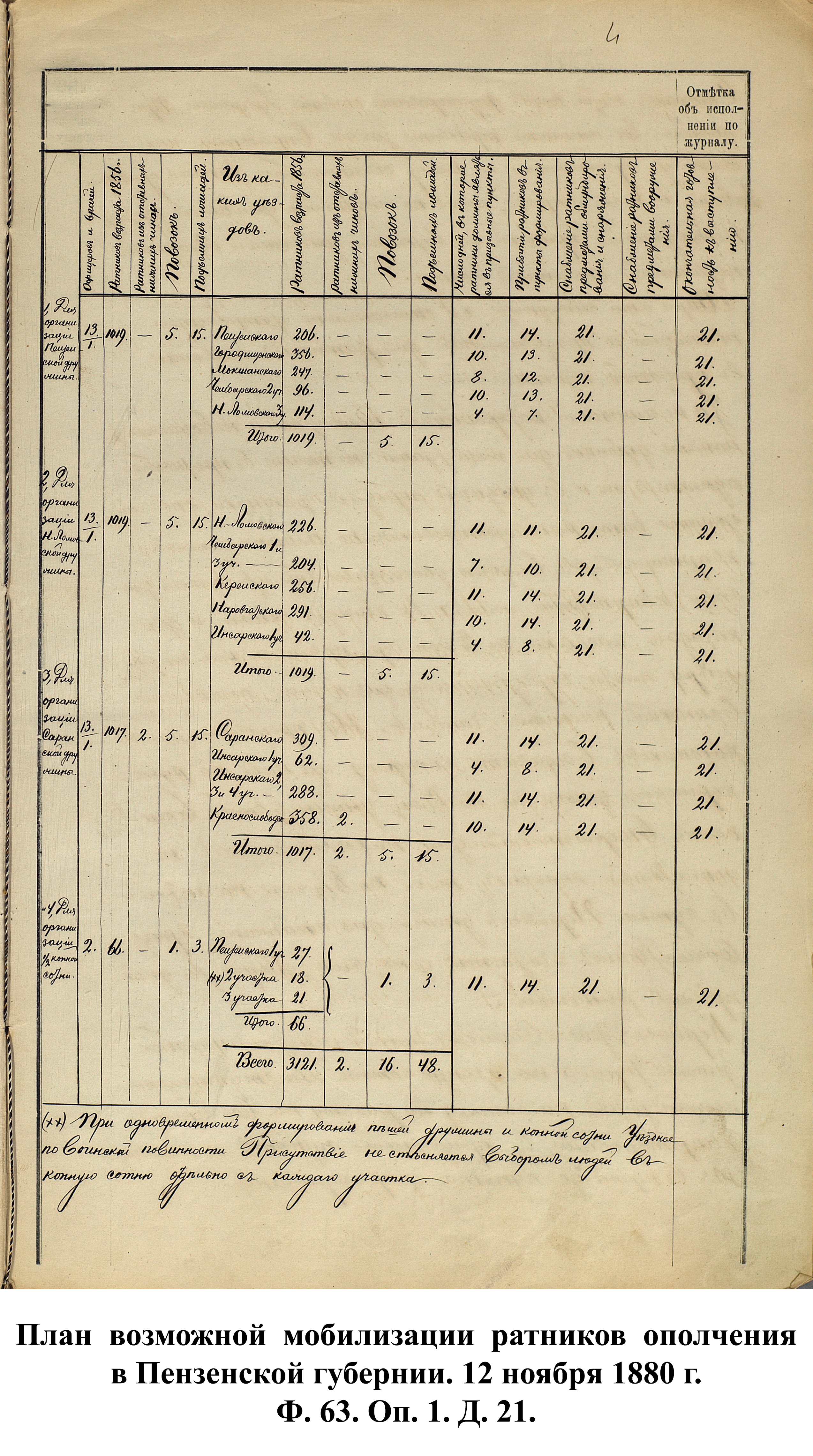 12 ноября 1880 г. заседание Пензенского ВПП составило план по мобилизации ратников ополчения. Всего в случае мобилизации планировались к призыву: Пензенская, Саранская и Нижнеломовская дружины и половинная конная сотня общей численностью 3121 чел., 2 отставных нижних чина. В главе каждой дружины стояло 13 офицеров, половинной сотни – 2 офицера. На ополчение выделялось 3 врача, 16 повозок и 46 подъемных лошадей. На путь до призывного пункта ратникам отводилось от 4 до 11 дней, в пункты формирований – 7–14 дней, снабжение обмундированием и снаряжением – 21 день, окончательная готовность к выступлению – 21 день. Из-за отсутствия казарм и других удобных помещений в призывных пунктах и уездных городах Пензенской губернии ратники расквартировывались по обывательским квартирам, с выдачей хозяевам платы в размере 2 коп. за сутки с человека. Для обеспечения продовольствием местная уездная земская управа выдавала начальнику сотни или отдельной команды кормовые деньги – по 8 ½ коп. на солдата.