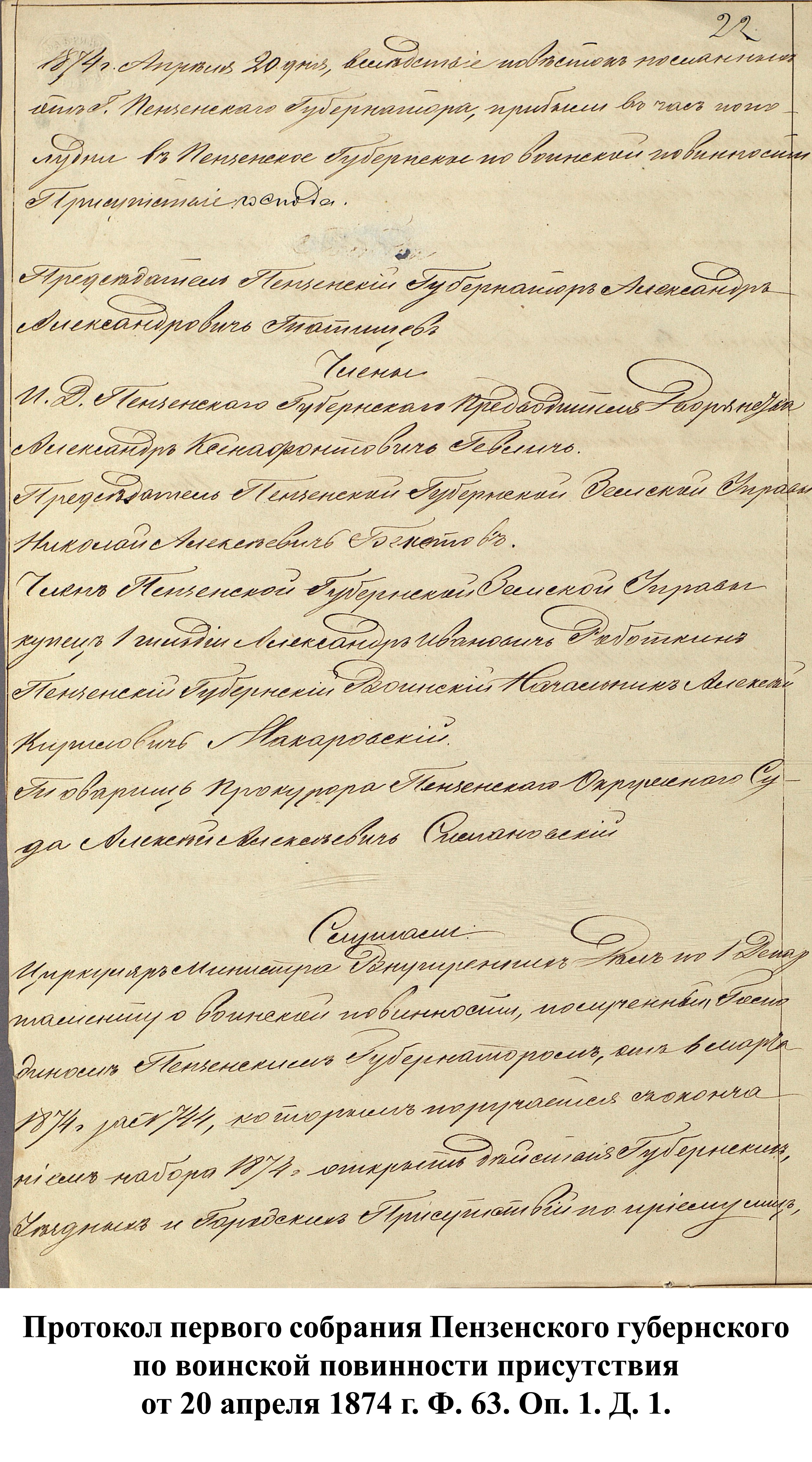 16 февраля было официально объявлено днём открытия губернских и уездных ВПП в Пензенской губернии. Однако первое собрание Пензенского губернского ВПП состоялось лишь 20 апреля, заменив собой собрания по рекрутской повинности присутствия, последнее из которых прошло 19 марта. Председателем первого собрания ВПП стал пензенский губернатор А.А. Татищев. В ходе заседания члены собрания заслушали циркуляр МВД по 1 департаменту о воинской повинности от 18 марта 1874 г., по которому поручалось, с окончанием набора 1874 г., открыть комиссии в губернском и уездных ВПП по розыску лиц, ранее укрывавшихся от рекрутского набора и пересмену прежде принятых. На основе этого циркуляра и Устава о воинской повинности, здание бывшего губернского рекрутского присутствия было официально преобразовано в губернское по воинской повинности присутствие.