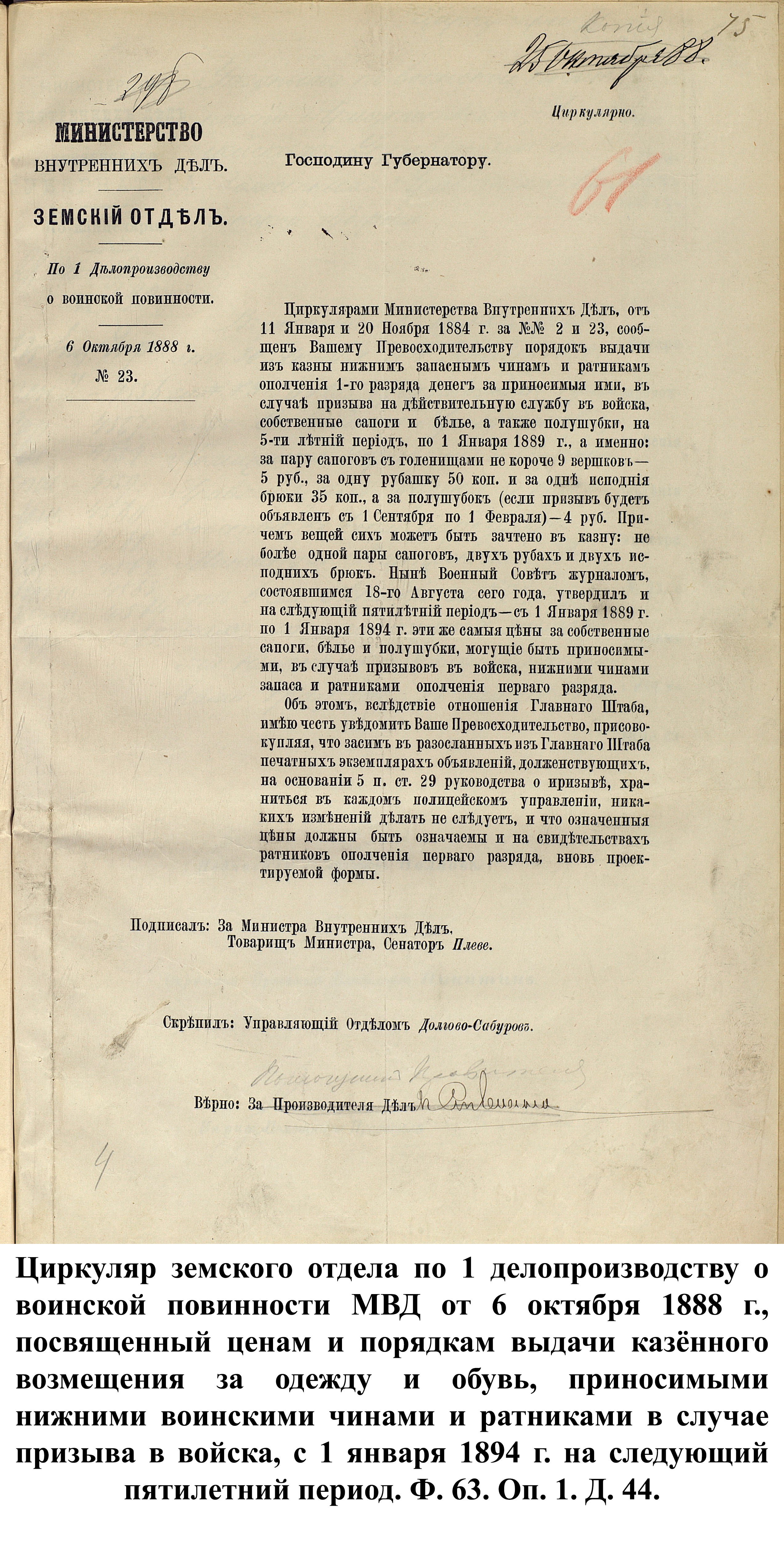11 января и 20 ноября 1884 г. циркулярами МВД за № 2 и 23 пензенскому губернатору А.А. Татищеву были доставлены сведения о порядке выдачи денег из казны нижним запасным чинам и ратникам за вещи, принесённые ими в случае призыва на службу на следующее 5-летие 1884–1889 гг.: 1 пара сапог с голенищем не короче 40 см – 5 руб., две рубахи – по 50 коп. за шт., двое исподних брюк – по 35 коп. за шт. и за полушубок (в случае призыва с 1 сентября по 1 февраля) – 4 руб. Размер выплаты сохранился в 1889–1894 гг. и, с постепенным повышением выкупных, выдавался вплоть до конца существования Российской империи.