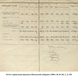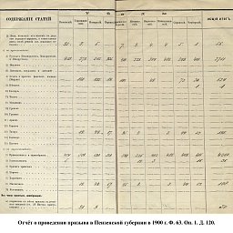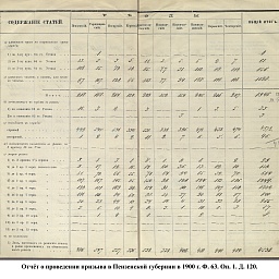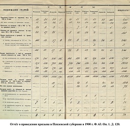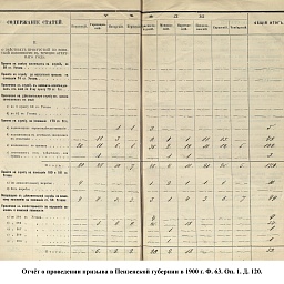 В 1900 г. в призывные списки были внесены 17509 чел. Из них имели право на льготу по семейному положению: I – 4019, II – 3632, III – 815. К исполнению воинской службы принято 4594 новобранца, в ополчение зачислено 8933 ратника. Недобор призывников составил 17 чел. магометан и 1 христианин. Общие траты на содержания присутствия и призыв: из казны – 6039 руб. 51 коп., из земских сборов – 10555 руб.