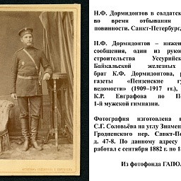 Одной из интересных находок сотрудников архива стала фотография Н.Ф. Дормидонтова в солдатской форме времен правления Александра III, сделанная в Санкт-Петербурге в 1880-е гг.