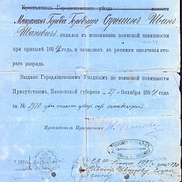 Важным изменением стало сокращение срока службы нижних чинов: для сухопутных – 6 л. действительной службы и 9 л. запаса, во флоте – 7 л. действительной службы и 3 г. запаса. Устав предполагал льготы по образованию и семейному положению призывников. Лица, находящиеся на действительной службе, освобождались от государственных, земских и общественных сборов, а также от натуральных повинностей, но не от налогов на имущество. Признанные негодными к несению воинской службы получали свидетельство о полном освобождении от воинской службы, зачисленные в рекруты – свидетельство с обозначением номера жребия [И.И. Спрыгин].