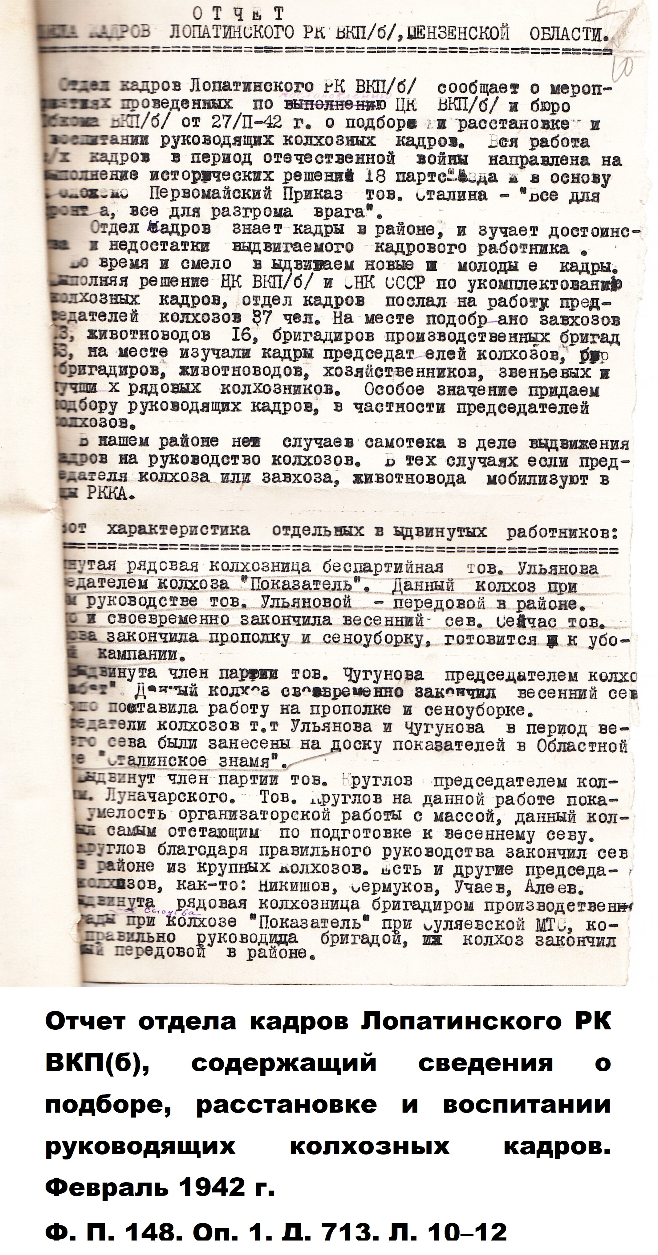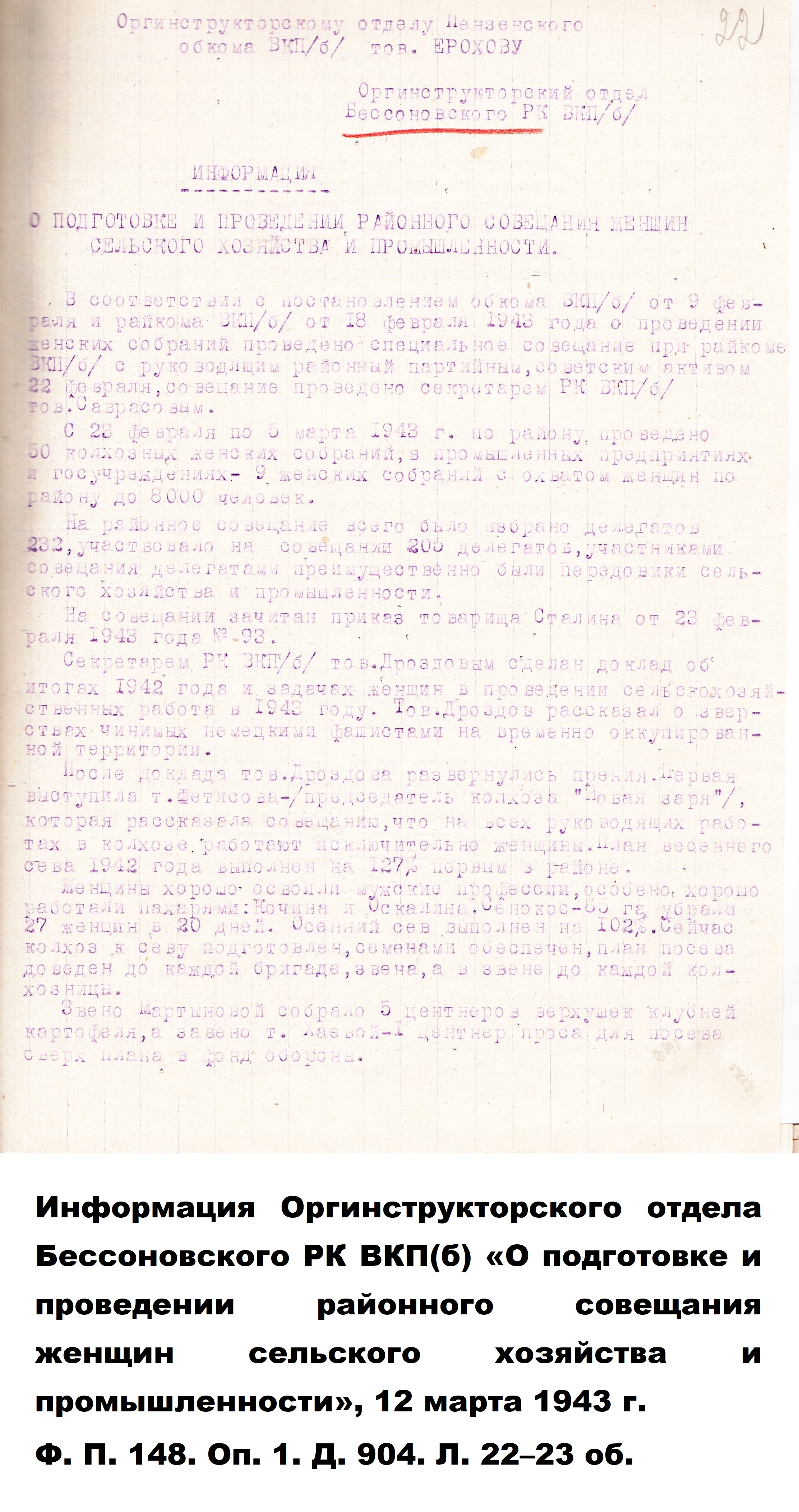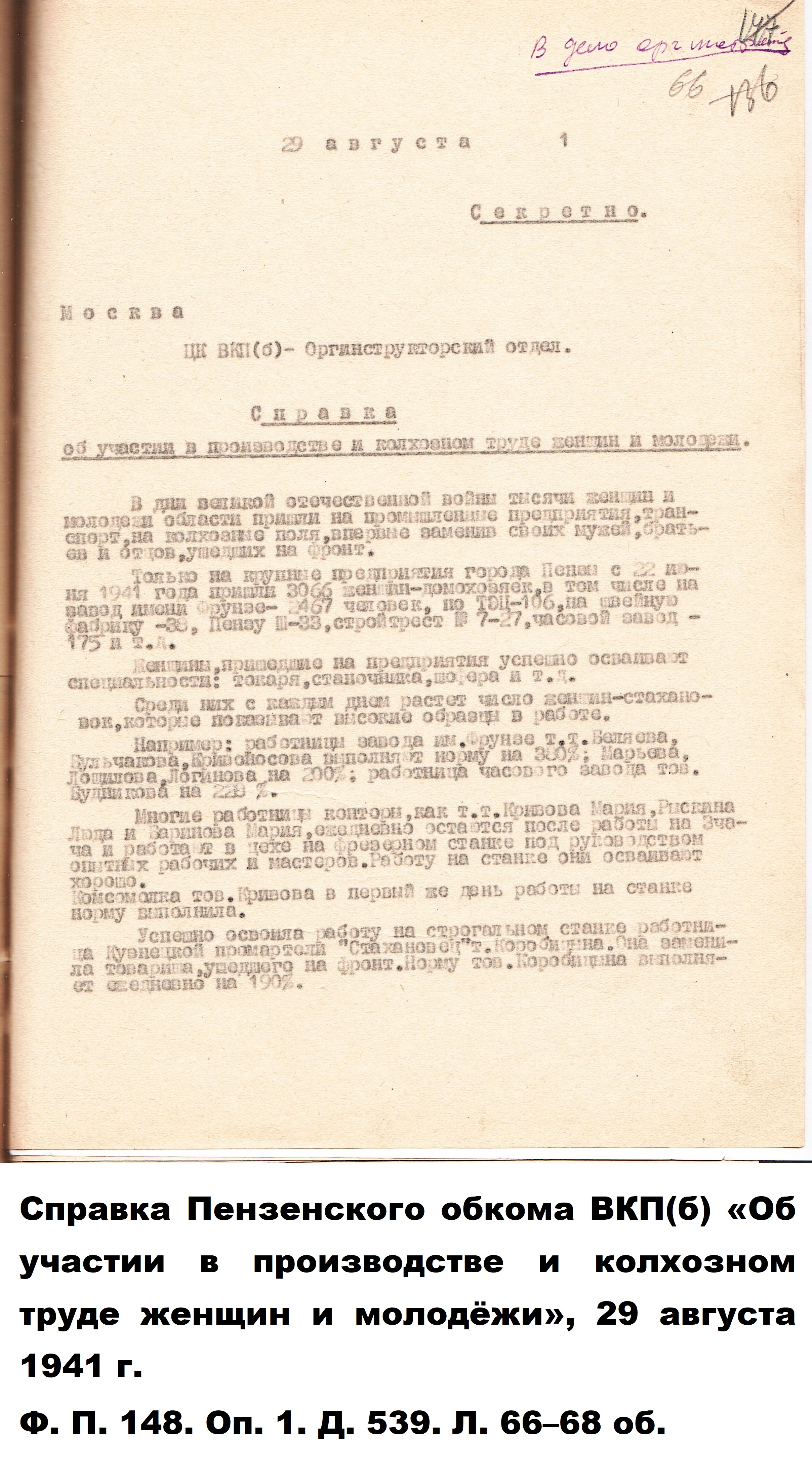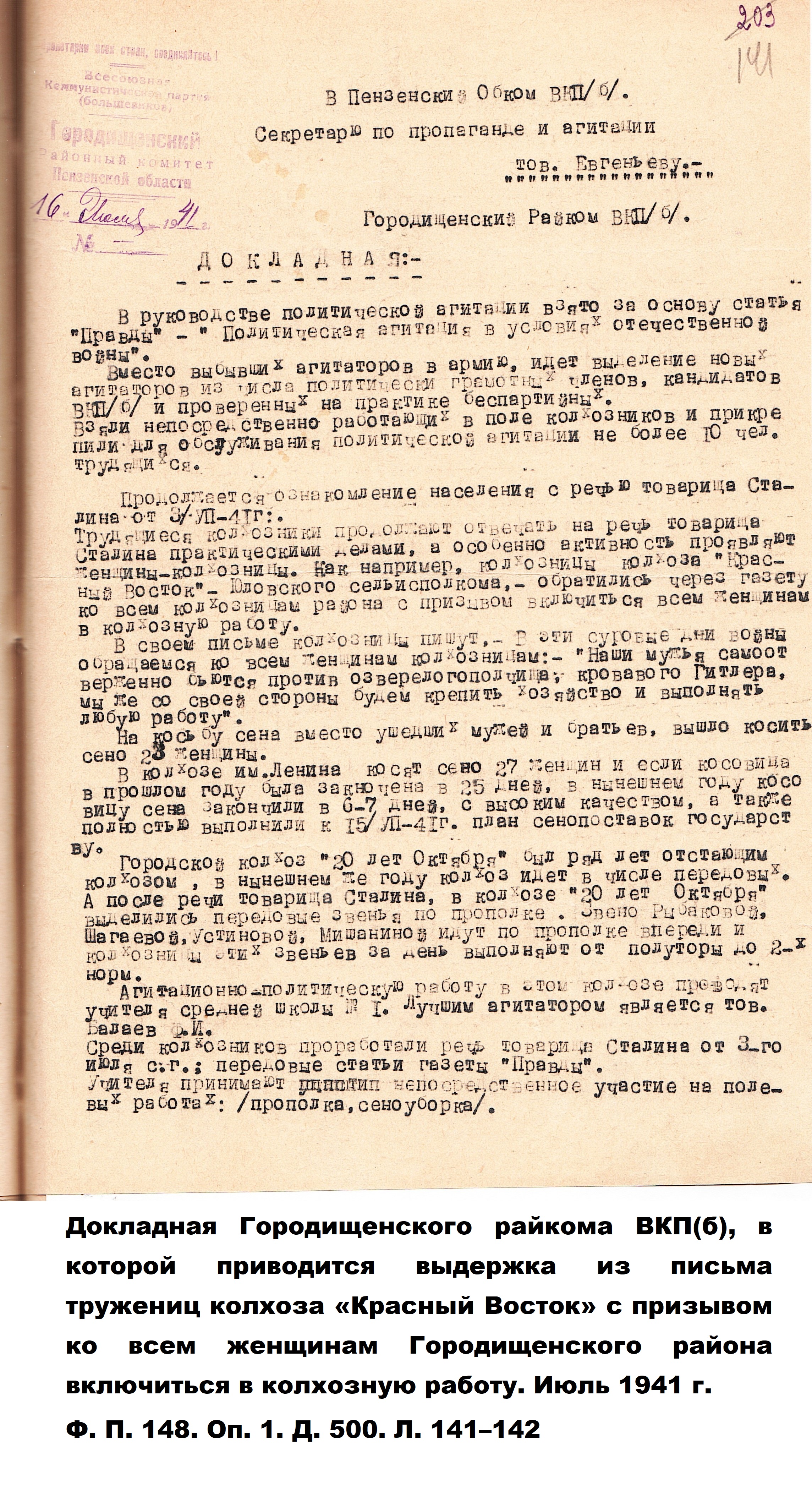 Когда началась Великая Отечественная война, и работники-мужчины ушли на фронт, заменить их предстояло женщинам, пожилым людям, подросткам. По призыву партии советские крестьянки, движимые чувством патриотизма и солидарности с защитниками Родины, вышли в поля, обещая «крепить хозяйство и выполнять любую работу». Надо сказать, что уже в документах первых недель войны зафиксировано множество примеров, когда колхозницы и домохозяйки действительно с большим воодушевлением, самоотверженно выполняют и свою работу, и работу ушедших отражать гитлеровскую агрессию мужей, отцов и сыновей. Так, в справке Пензенского обкома ВКП(б) «Об участии в производстве и колхозном труде женщин и молодёжи» от 29 августа 1941 г. сообщается, что «в Большевьясском районе на уборке хлебов работают 6678 женщин, из них водителями простейших машин – свыше полутора тысяч». Другой пример из того же источника: «Всему колхозу "Свобода" Шемышейского района известна замечательная работа звена Ольги Лытковой из пятой бригады. Там каждая женщина вырабатывает ежедневно по две нормы, а Анна Потапова и Анна Россонанская – по две с половиной нормы». «Многие женщины, – читаем в том же документе, – успешно окончили курсы механизаторских кадров сельского хозяйства» и «сейчас работают по специальности».