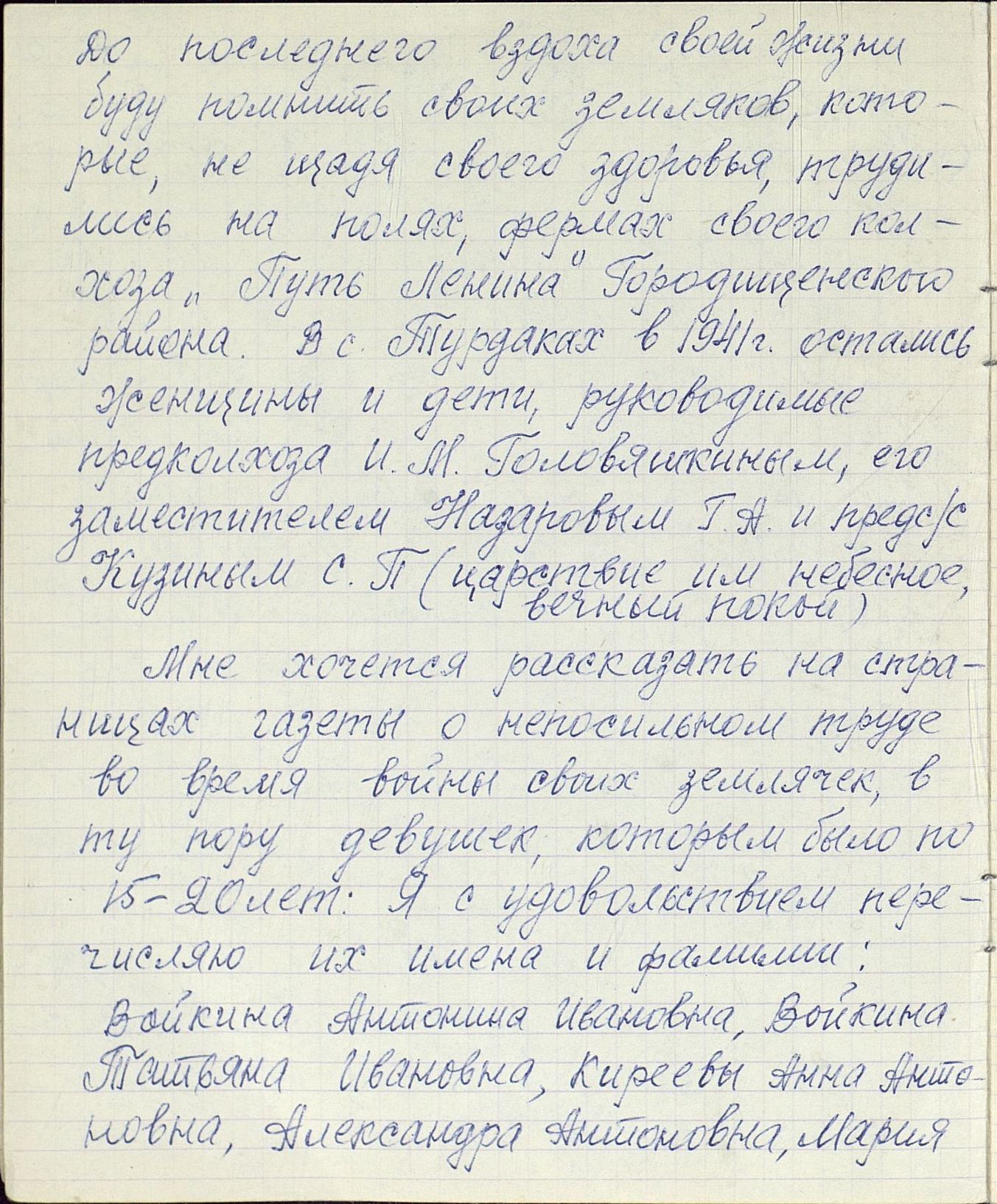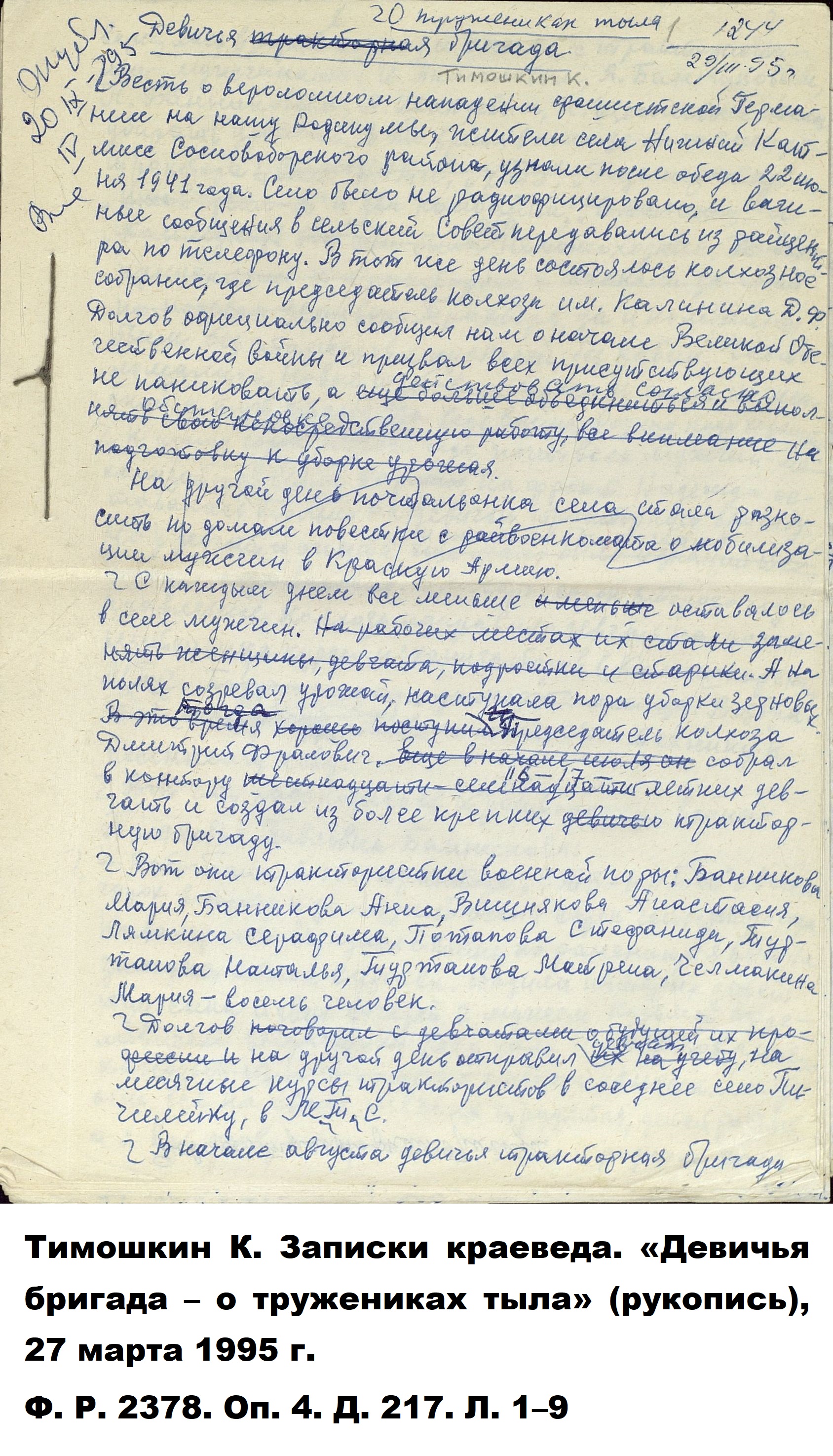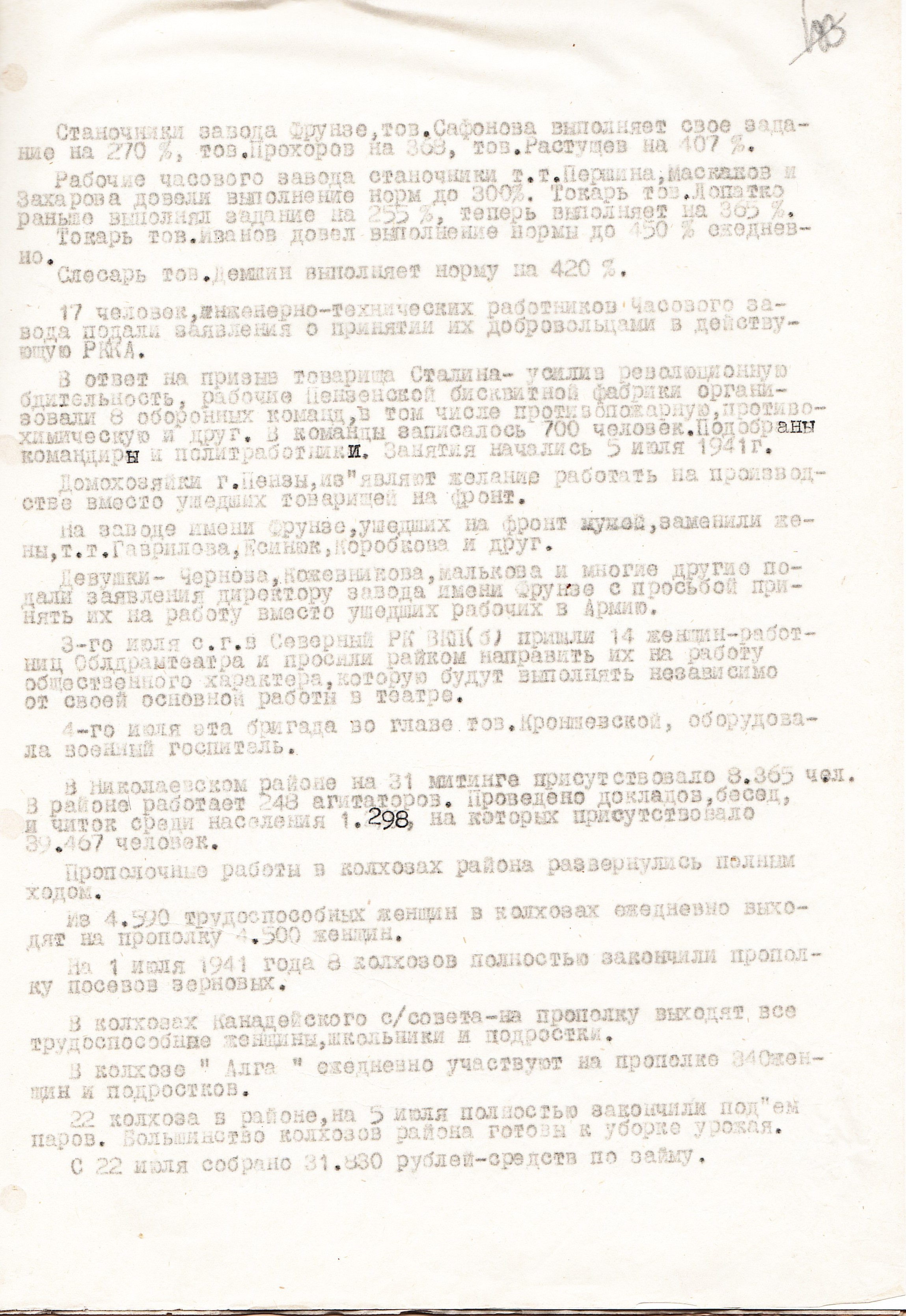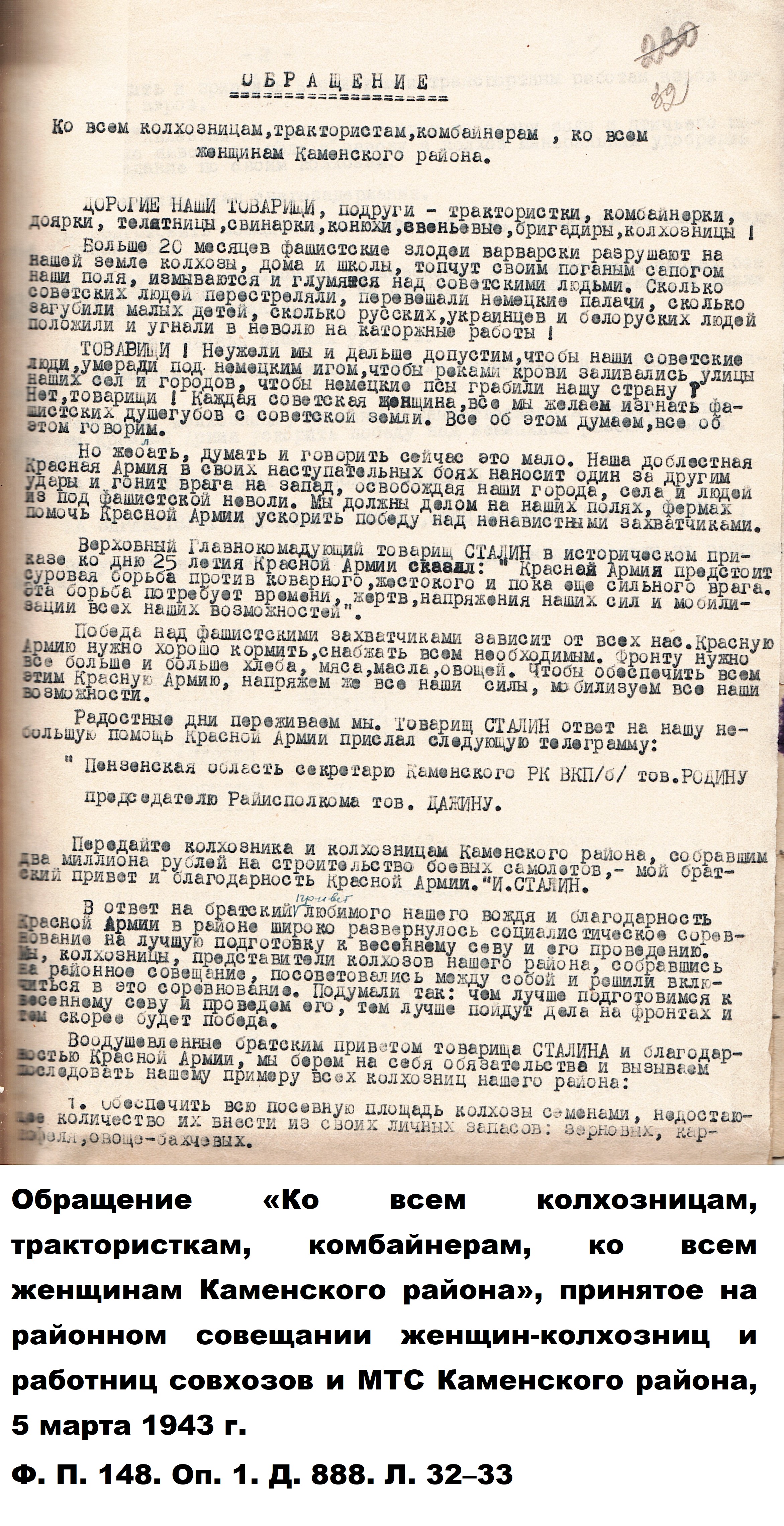 Когда началась Великая Отечественная война, и работники-мужчины ушли на фронт, заменить их предстояло женщинам, пожилым людям, подросткам. По призыву партии советские крестьянки, движимые чувством патриотизма и солидарности с защитниками Родины, вышли в поля, обещая «крепить хозяйство и выполнять любую работу». Надо сказать, что уже в документах первых недель войны зафиксировано множество примеров, когда колхозницы и домохозяйки действительно с большим воодушевлением, самоотверженно выполняют и свою работу, и работу ушедших отражать гитлеровскую агрессию мужей, отцов и сыновей. Так, в справке Пензенского обкома ВКП(б) «Об участии в производстве и колхозном труде женщин и молодёжи» от 29 августа 1941 г. сообщается, что «в Большевьясском районе на уборке хлебов работают 6678 женщин, из них водителями простейших машин – свыше полутора тысяч». Другой пример из того же источника: «Всему колхозу "Свобода" Шемышейского района известна замечательная работа звена Ольги Лытковой из пятой бригады. Там каждая женщина вырабатывает ежедневно по две нормы, а Анна Потапова и Анна Россонанская – по две с половиной нормы». «Многие женщины, – читаем в том же документе, – успешно окончили курсы механизаторских кадров сельского хозяйства» и «сейчас работают по специальности».