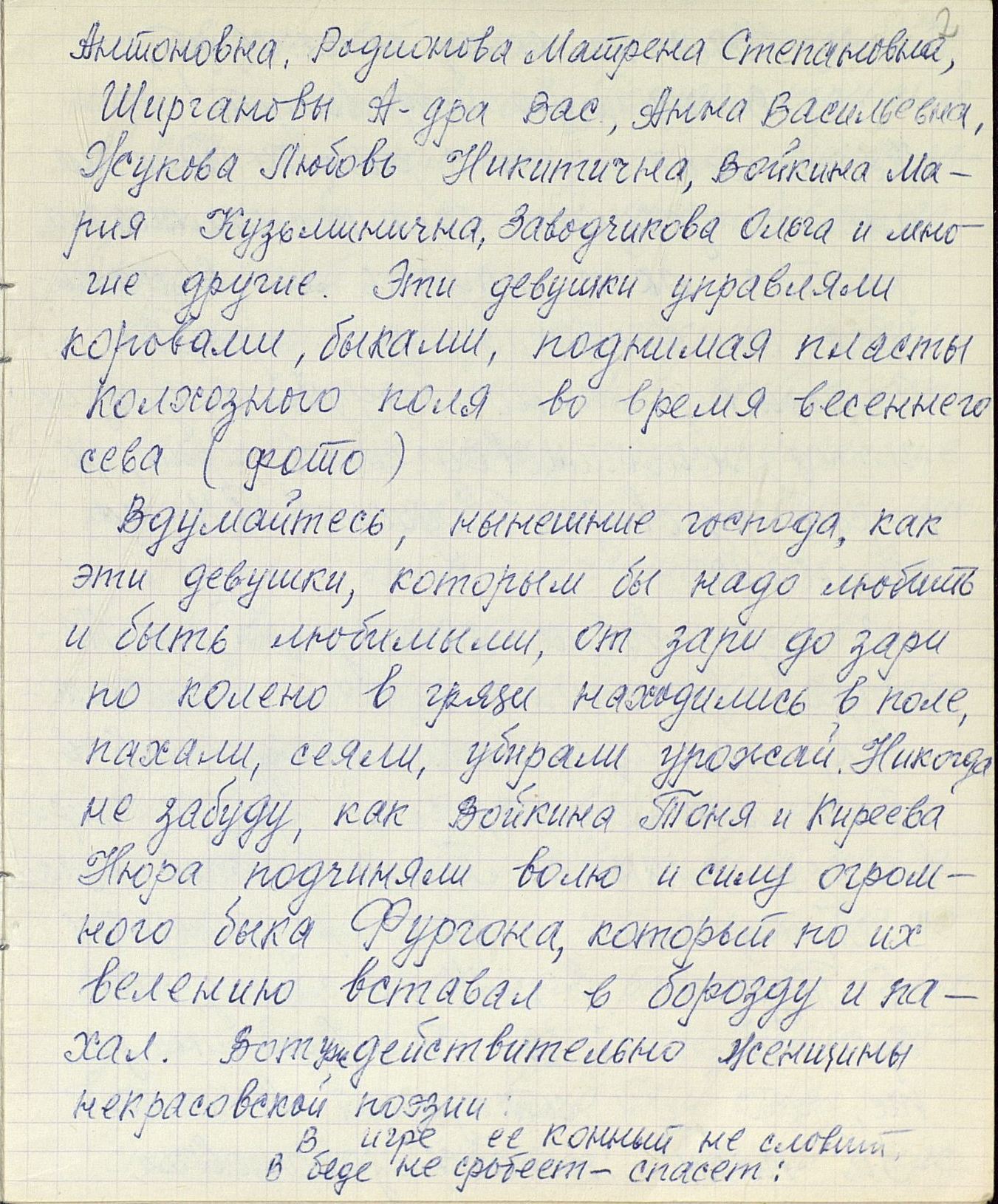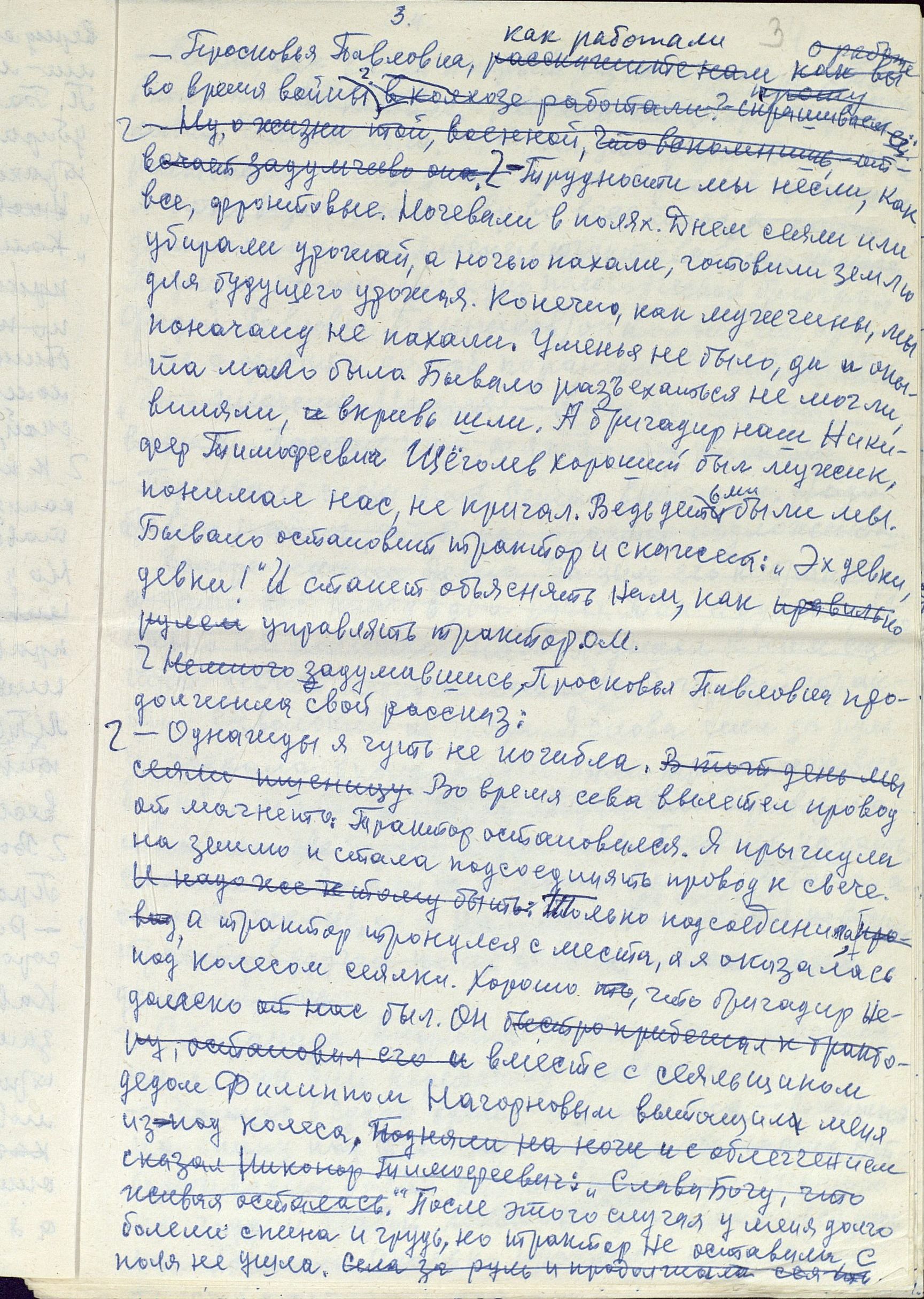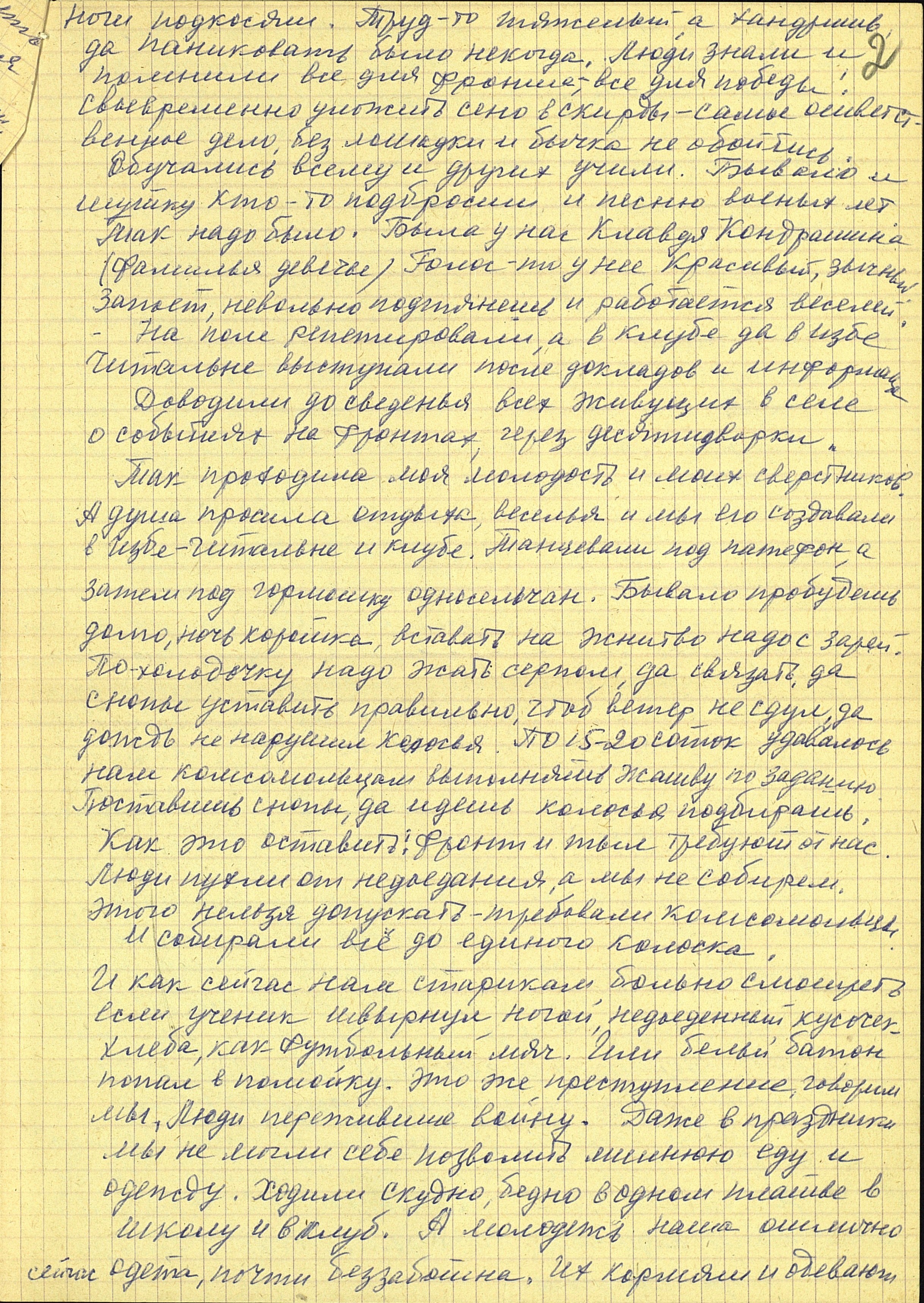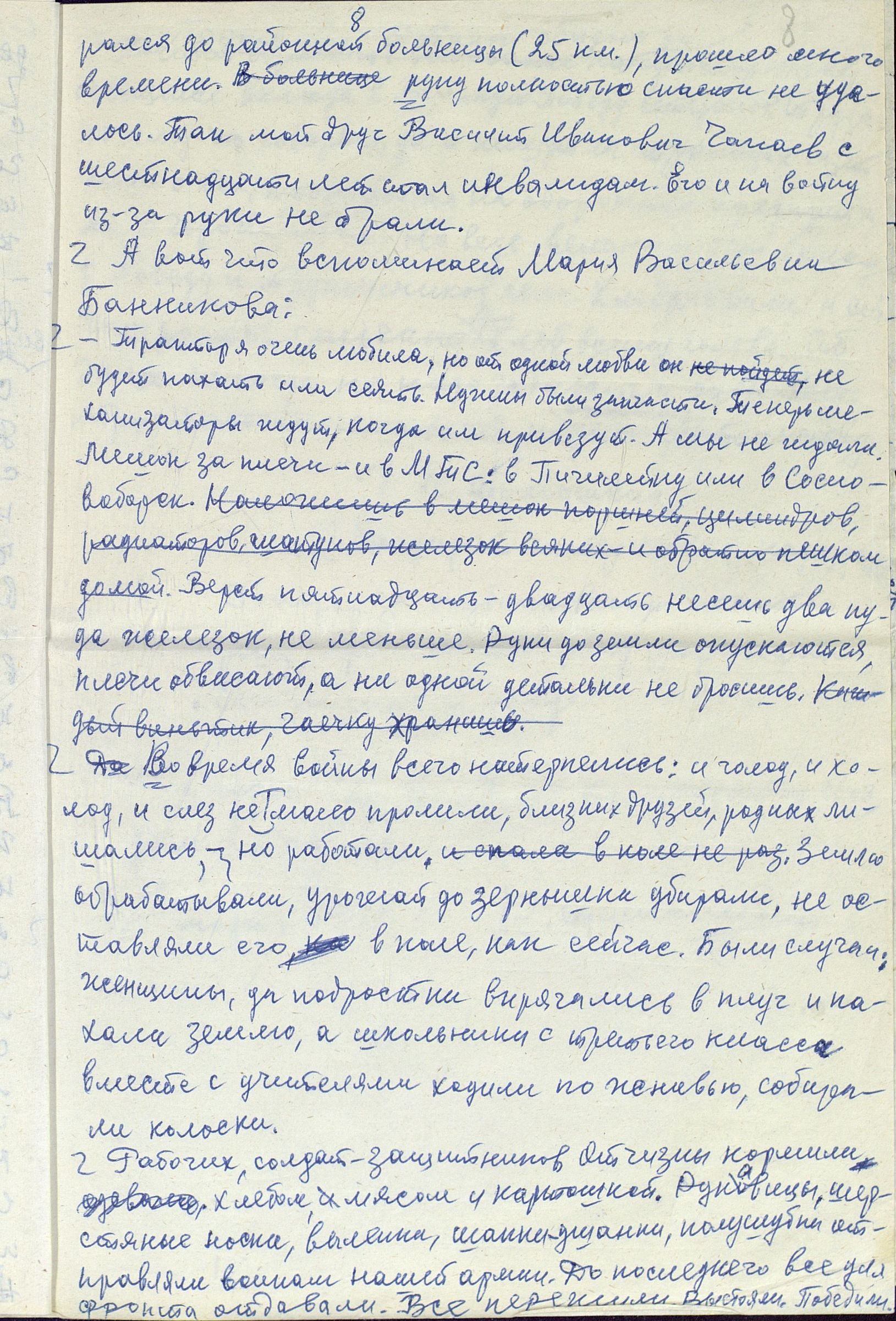 Чтобы понять, насколько сложным и напряжённым был труд в тылу, какие испытания взваливались на плечи работниц, и что стояло за высокими производственными показателями, необходимо дать слово непосредственным участникам и очевидцам. Например, А.Р. Улисова (Жукова) так описывает труд сельчан, в том числе и женщин: «...больше вручную и косили, и жали, и молотили цепом. <...> И на быках, и на коровах обрабатывали земличку. И дрова готовили, возили, на чём могли. И в тележку впрягались, и в плуг. Хорошо, коровушки помогали, и кормили и возили». «…Девушки, которым бы надо любить и быть любимыми, – вспоминает О.И. Иванова, – от зари до зари по колено в грязи находились в поле, пахали, сеяли, убирали урожай. Никогда не забуду, как Войкина Тоня и Киреева Нюра подчиняли волю и силу огромного быка Фургона, который по их велению вставал в борозду и пахал». А вот что рассказывает работавшая трактористкой в годы войны П.П. Банникова: «Трудности мы несли... Ночевали в полях. Днём убирали урожай, а ночью пахали, готовили землю для будущего урожая. Конечно, опыта мало было. Бывало, разъехаться не могли, виляли, вкривь шли. А бригадир наш, Никифор Тимофеевич Щеголев, хороший был мужик, понимал нас, не кричал. Ведь детьми были мы. <...> Однажды я чуть не погибла. Во время сева вылетел провод от магнето. Трактор остановился. Я прыгнула на землю и стала подсоединять провод к свече. Только подсоединила, а трактор тронулся с места, а я оказалась под колесом сеялки. Хорошо, что бригадир недалеко был. Он вместе с сеяльщиком дедом Филиппом Нагорновым вытащил меня из-под колеса. После этого случая у меня долго болели спина и грудь, но трактор не оставила, с поля не ушла».