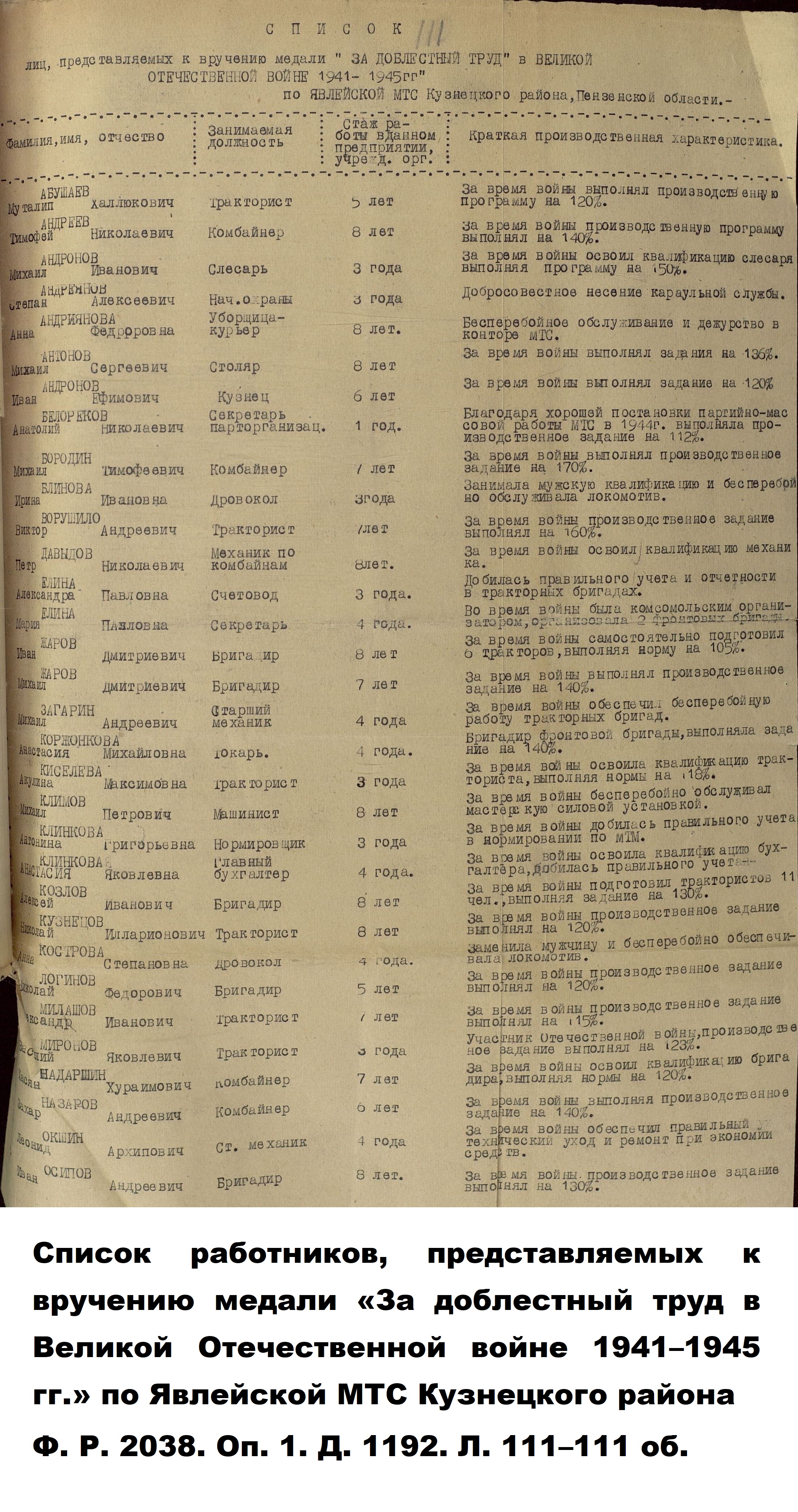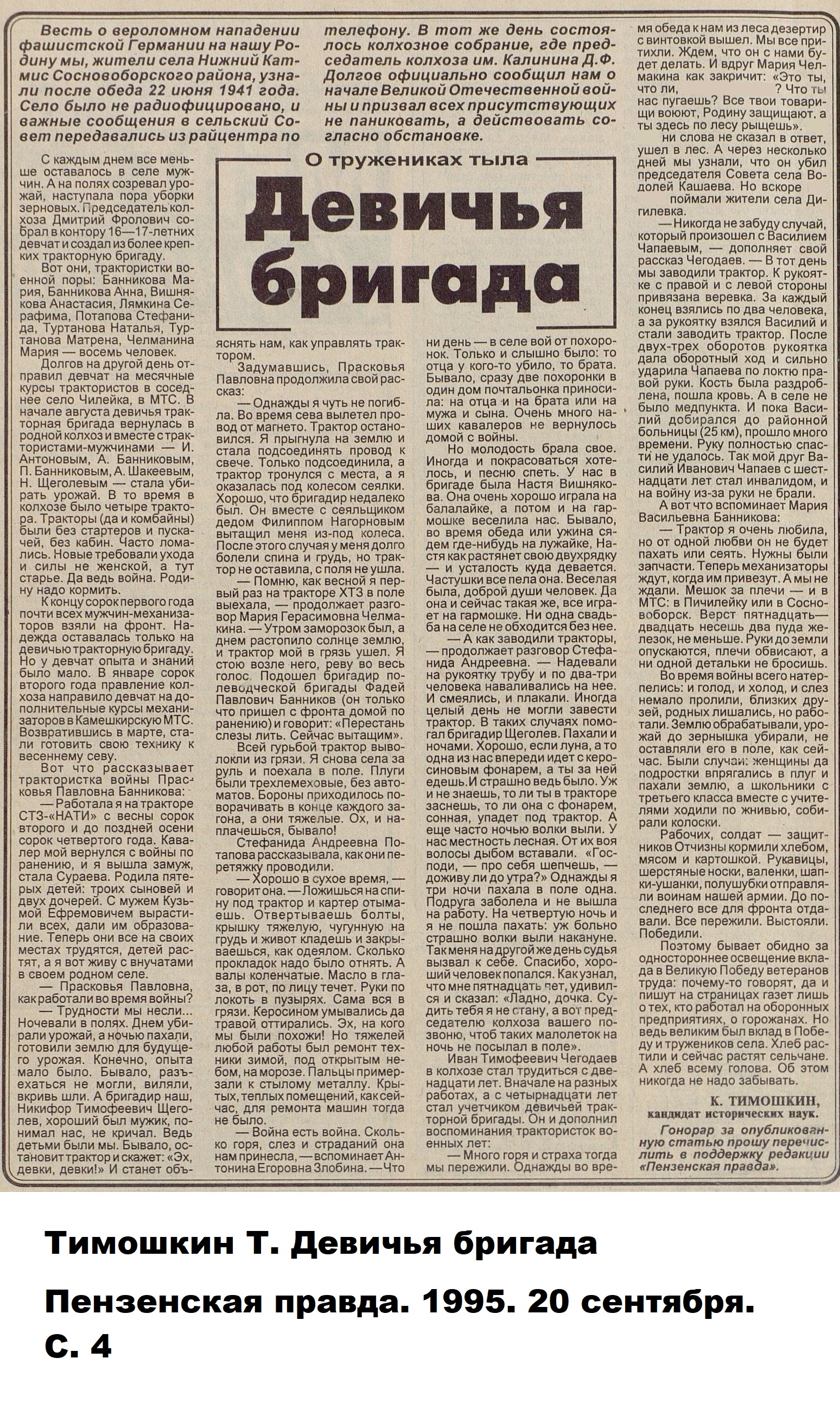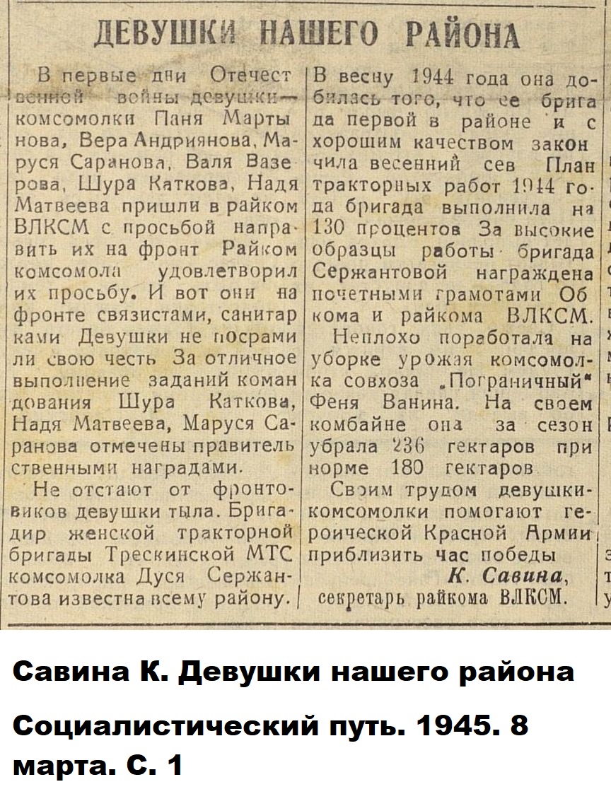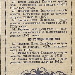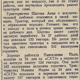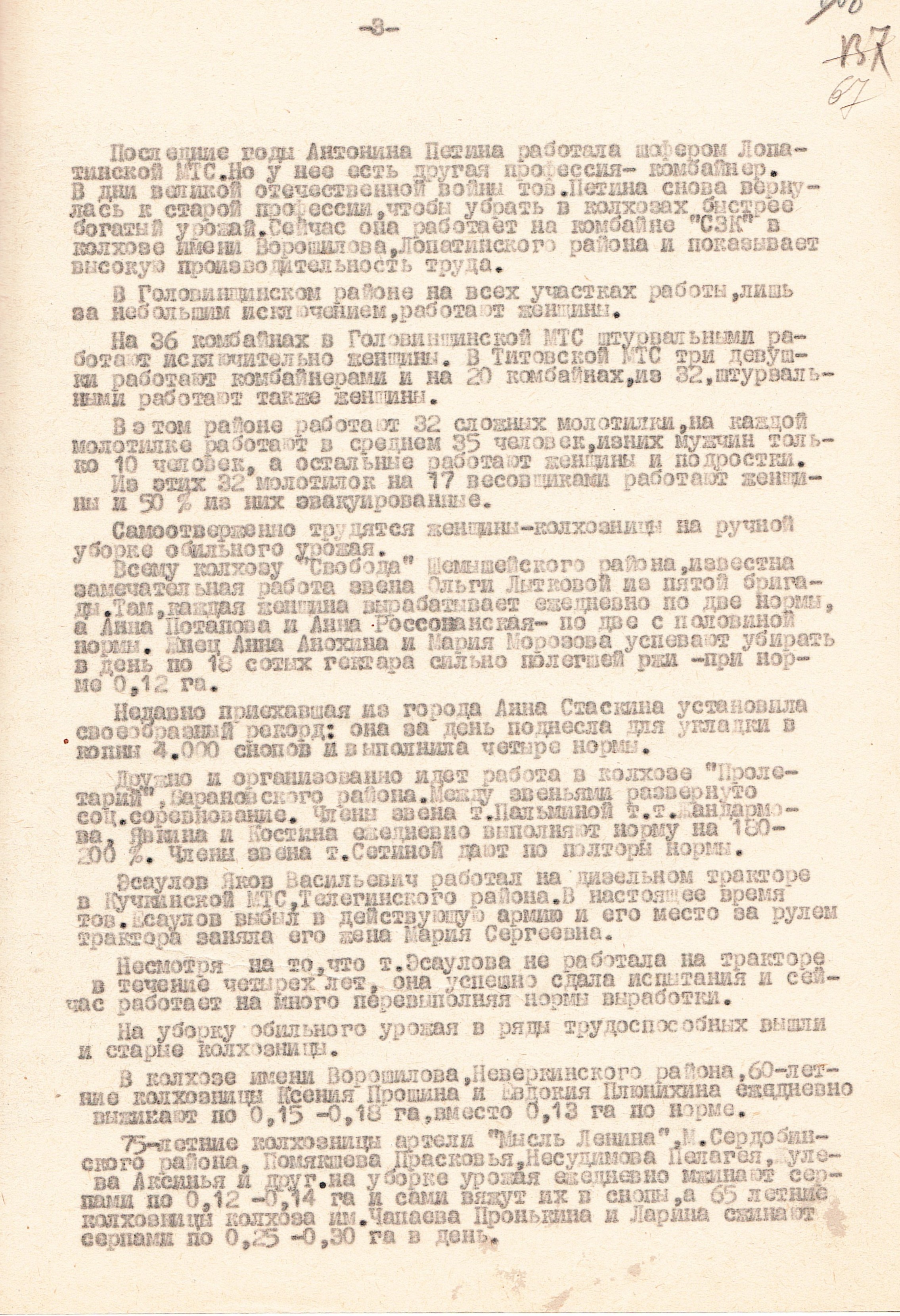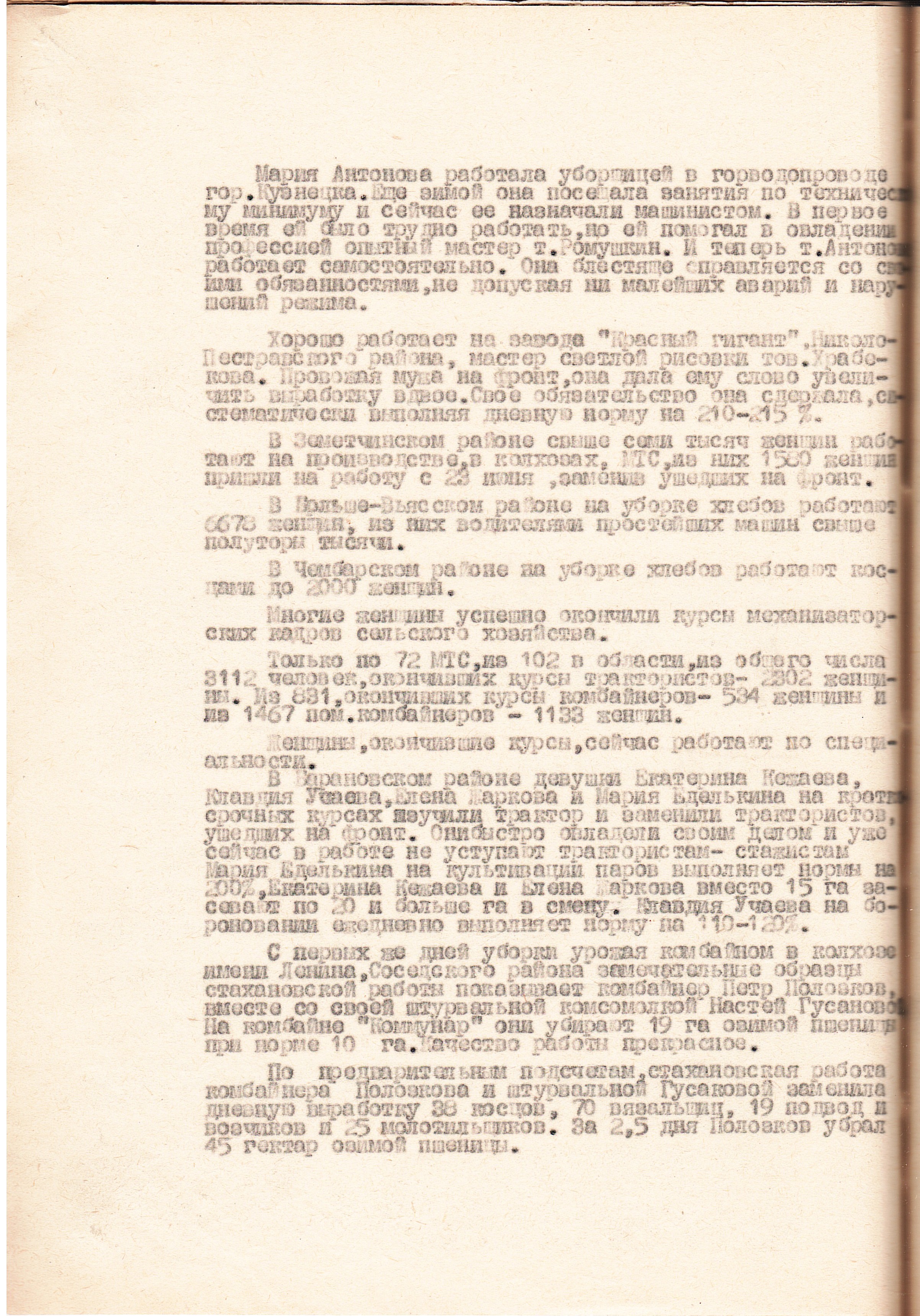 Авторами книги «Пензенская область в годы Великой отечественной войны» (Саратов, 1985), подсчитано, что «к 1944 году в МТС области 56,6 процента трактористов и 62,2 процента комбайнёров составляли женщины».