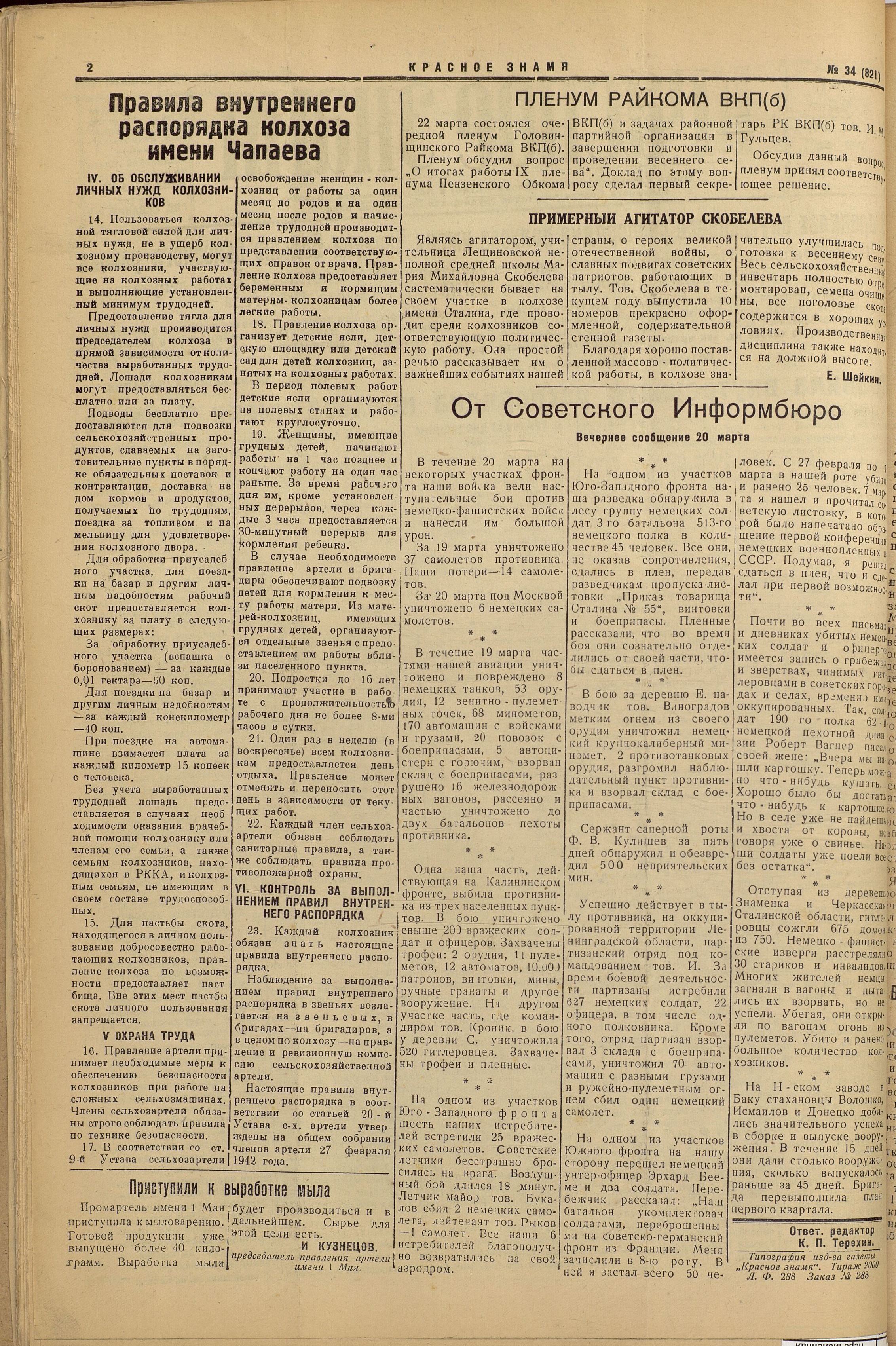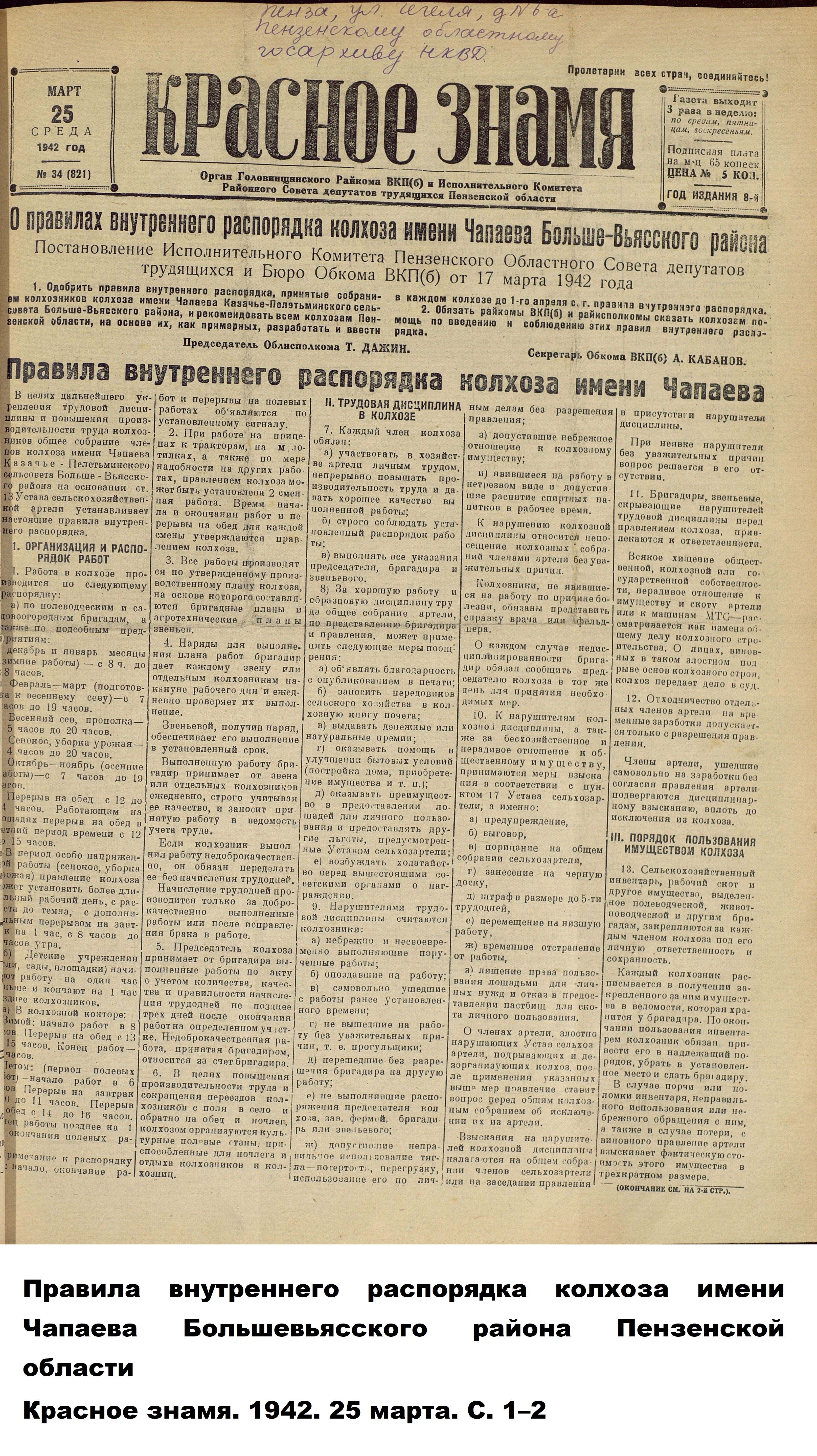 Так, в «Правилах внутреннего распорядка колхоза имени Чапаева Больше-Вьясского района» (1942 г.), «рекомендованных» областным руководством к повсеместному внедрению, прописано, что в период весеннего сева рабочий день в полеводческих бригадах начинается в 5 часов утра, а заканчивается в 8 вечера. Во время сенокоса и уборки урожая период работ длится с 4 часов до 20. Обеденный перерыв – с 12 до 14 часов или с 12 до 15 часов (для тех, кто работает на лошадях). Детским учреждениям предписывалось начинать работу на один час раньше всех колхозников и завершать на час позже.