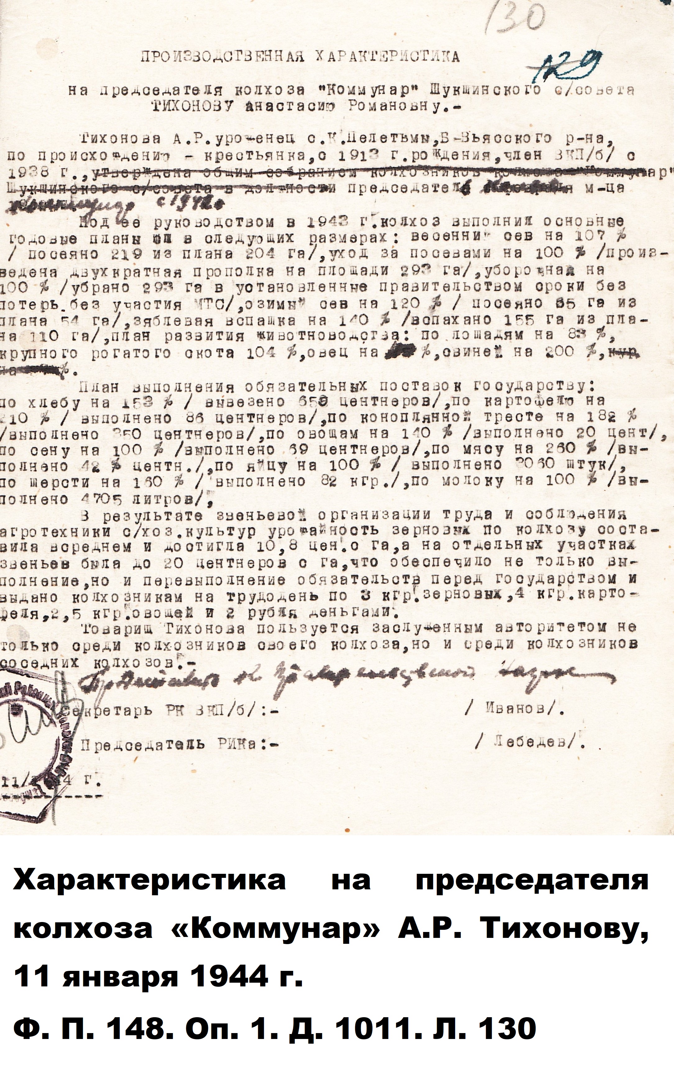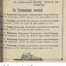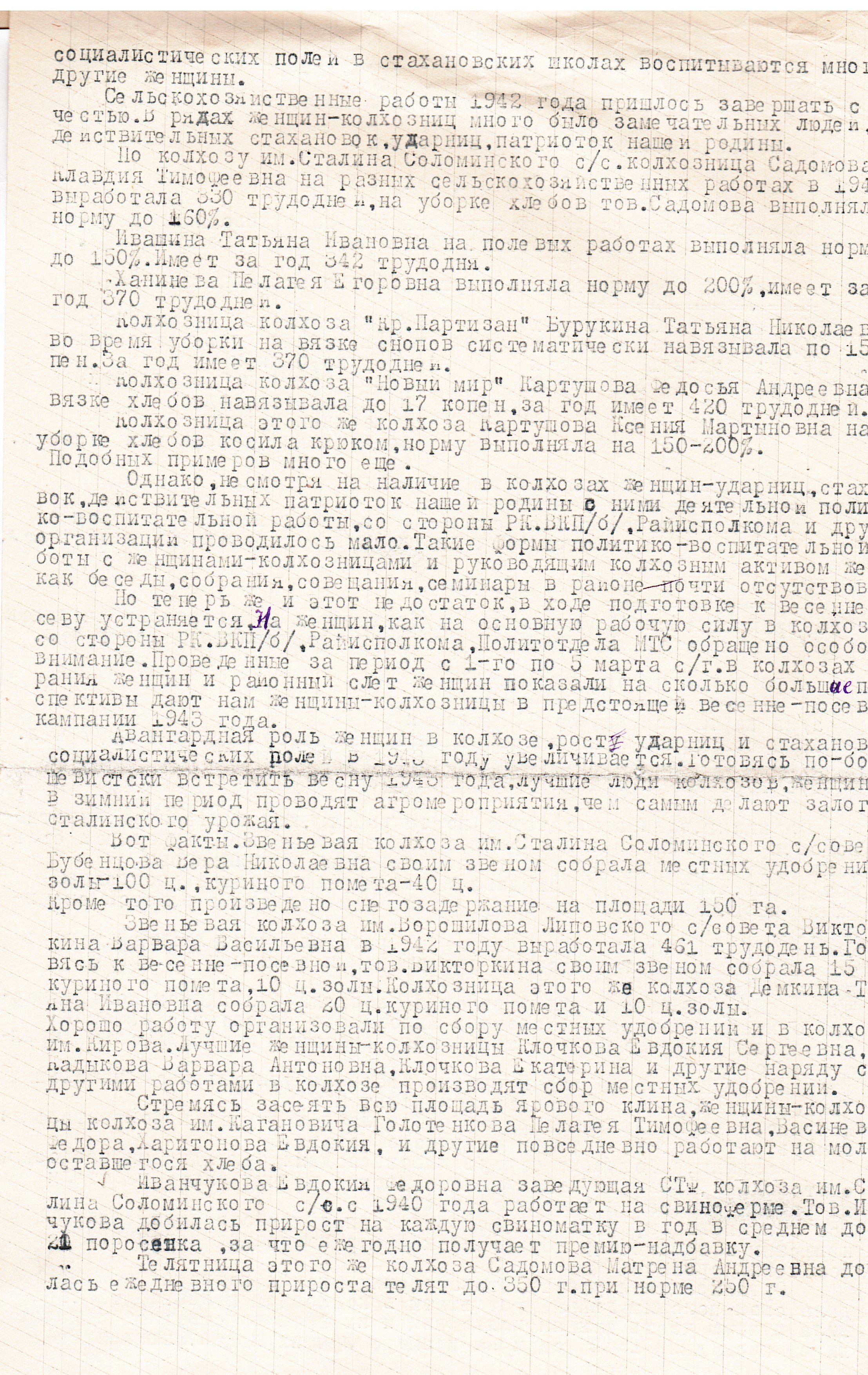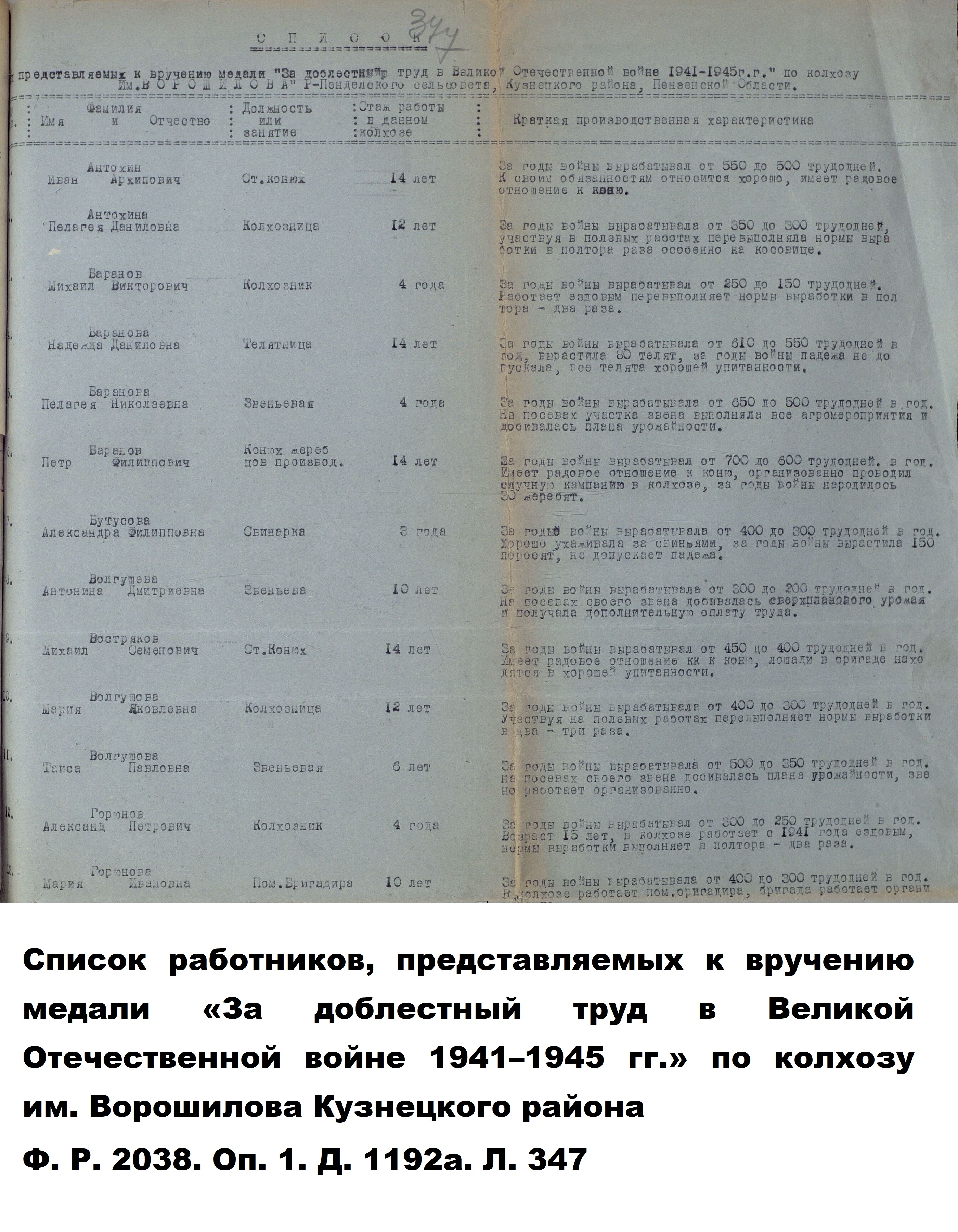 Показательными являются производственные характеристики на лиц, удостоенных различных поощрений и наград. К примеру, о звеньевой колхоза им. Ворошилова Кузнецкого района П.Н. Барановой, удостоенной медали «За доблестный труд в Великой Отечественной войне 1941–1945 гг.», написано следующее: «За годы войны вырабатывала от 650 до 500 трудодней в год. На посевах участка звена выполняла все агромероприятия и добивалась плана урожайности».