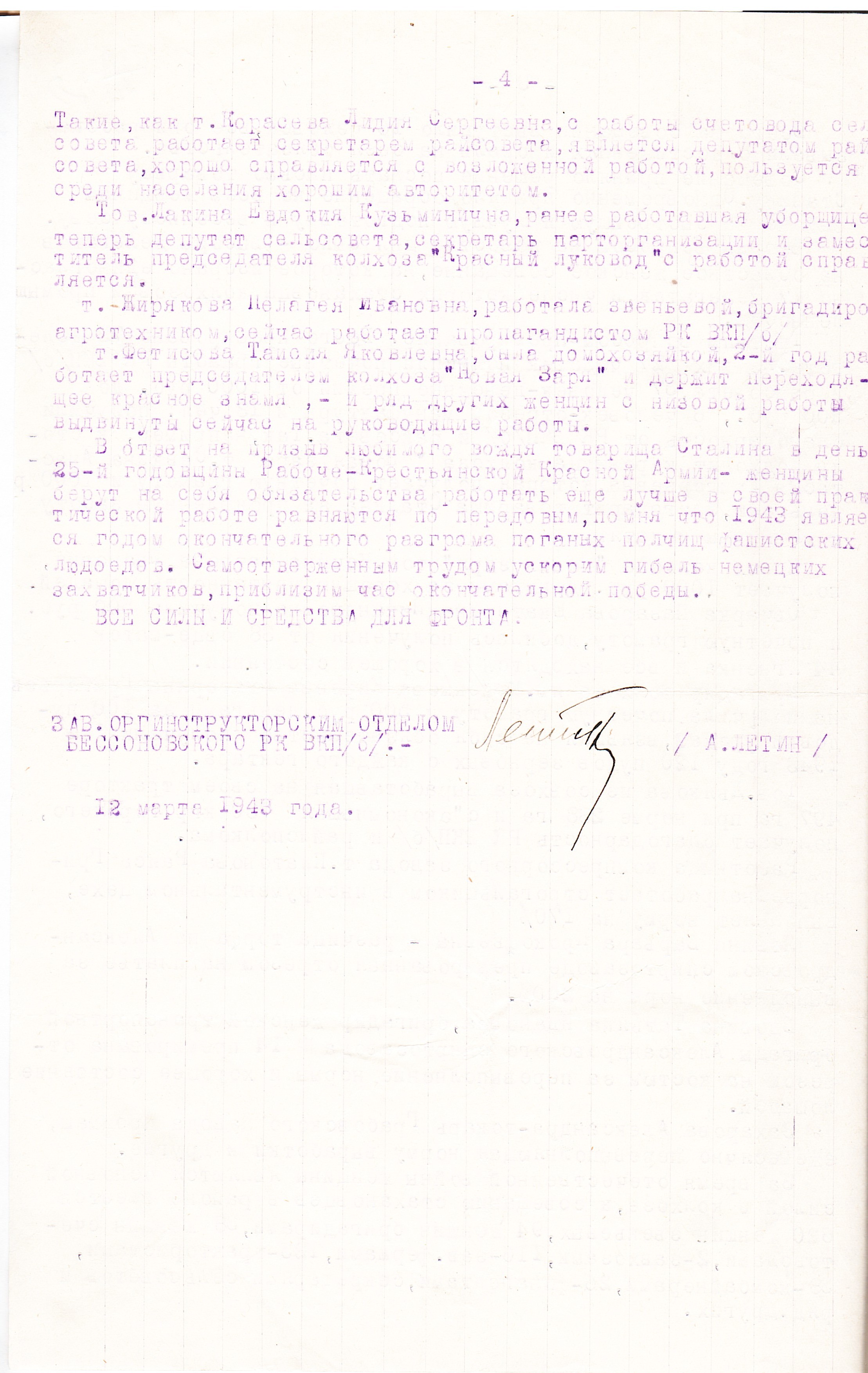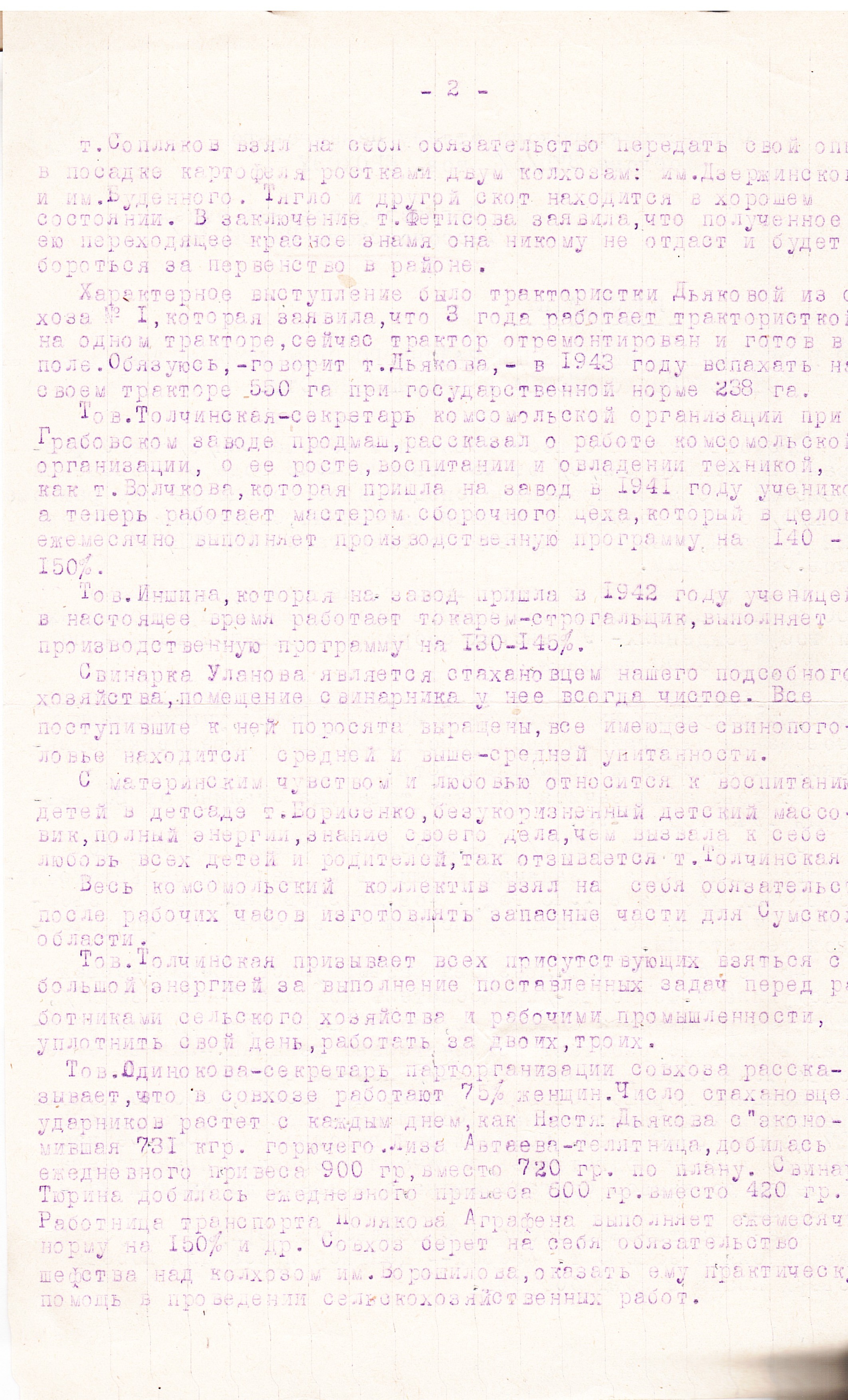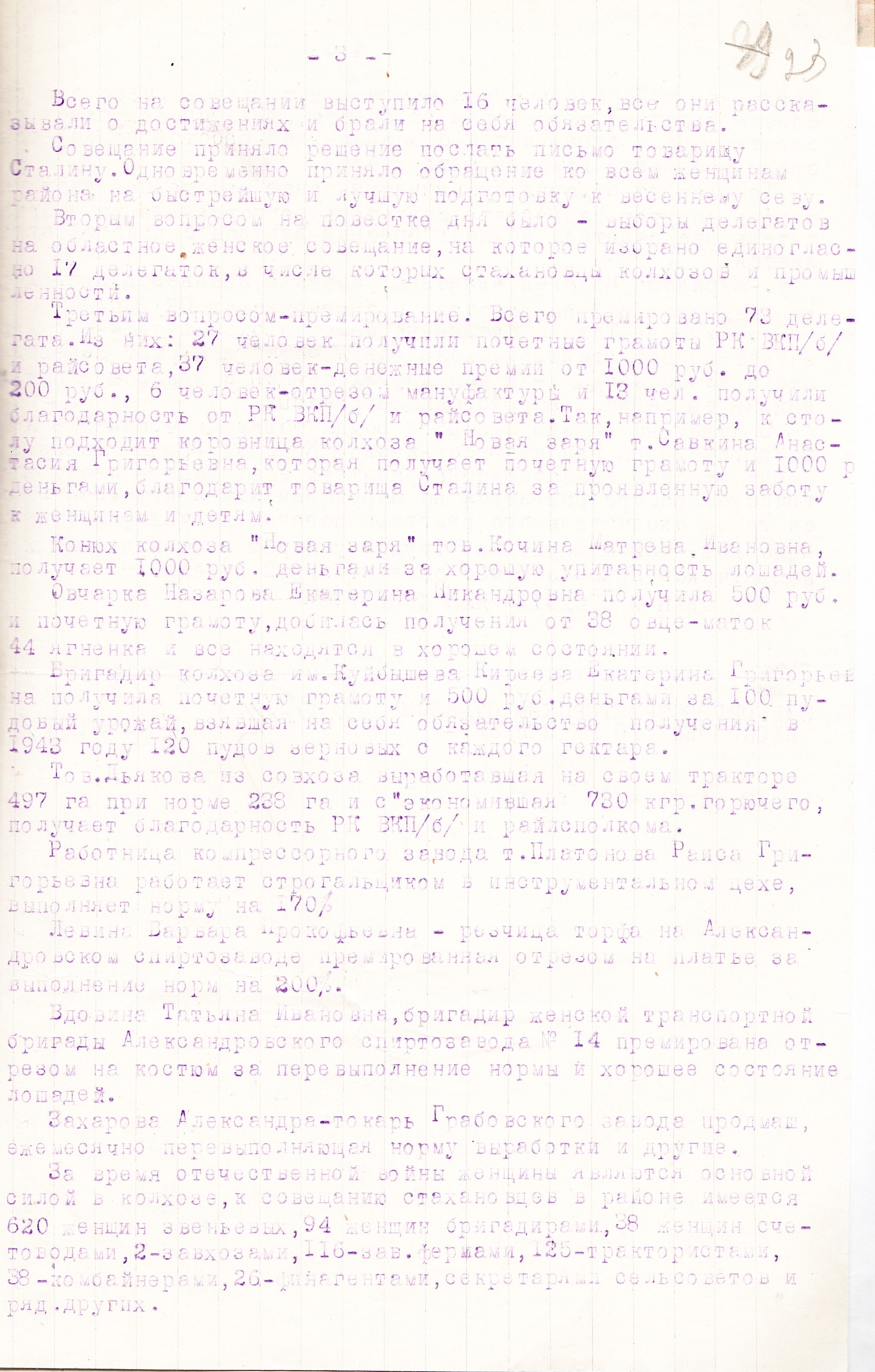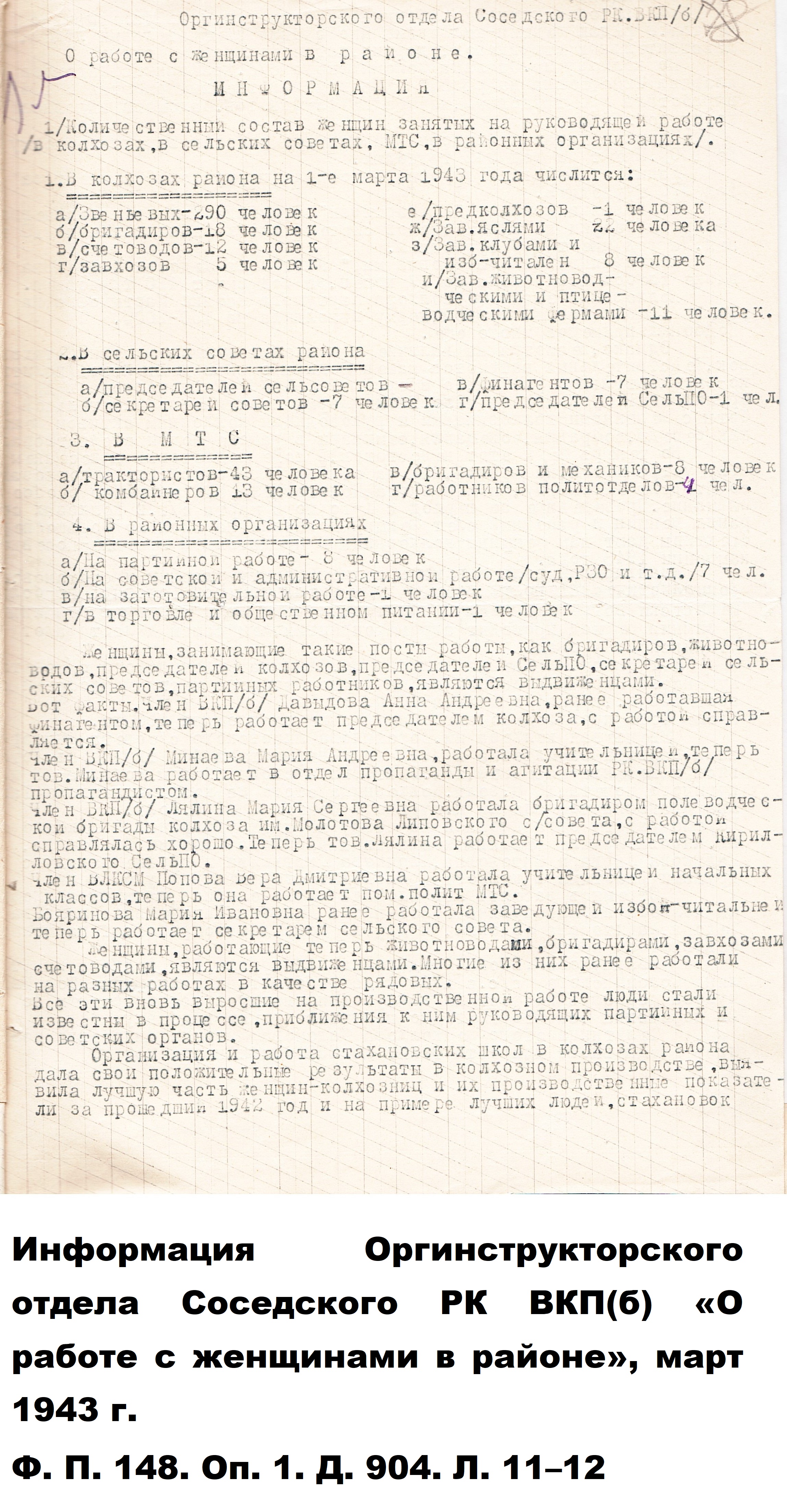 Так, в МТС Соседского района по состоянию на 1 марта 1943 г. трактористами работали 43 женщины, комбайнерами – 13. Что касается количественного состава женщин на руководящей работе в колхозах, сельсоветах, МТС и в районных организациях того же Соседского района, то перед нами предстают следующие числа: