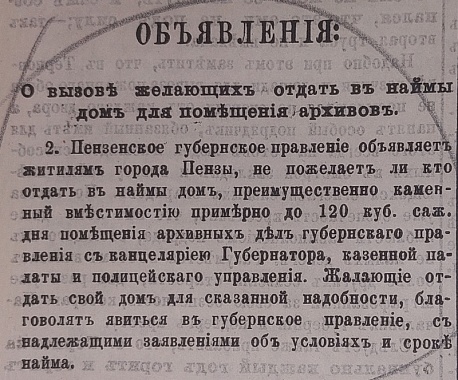 Объявление о вызове желающих отдать в наймы дом для помещения архивов. Было опубликовано в газете Пензенские губернские ведомости № 86 от 23 июля 1877 года.