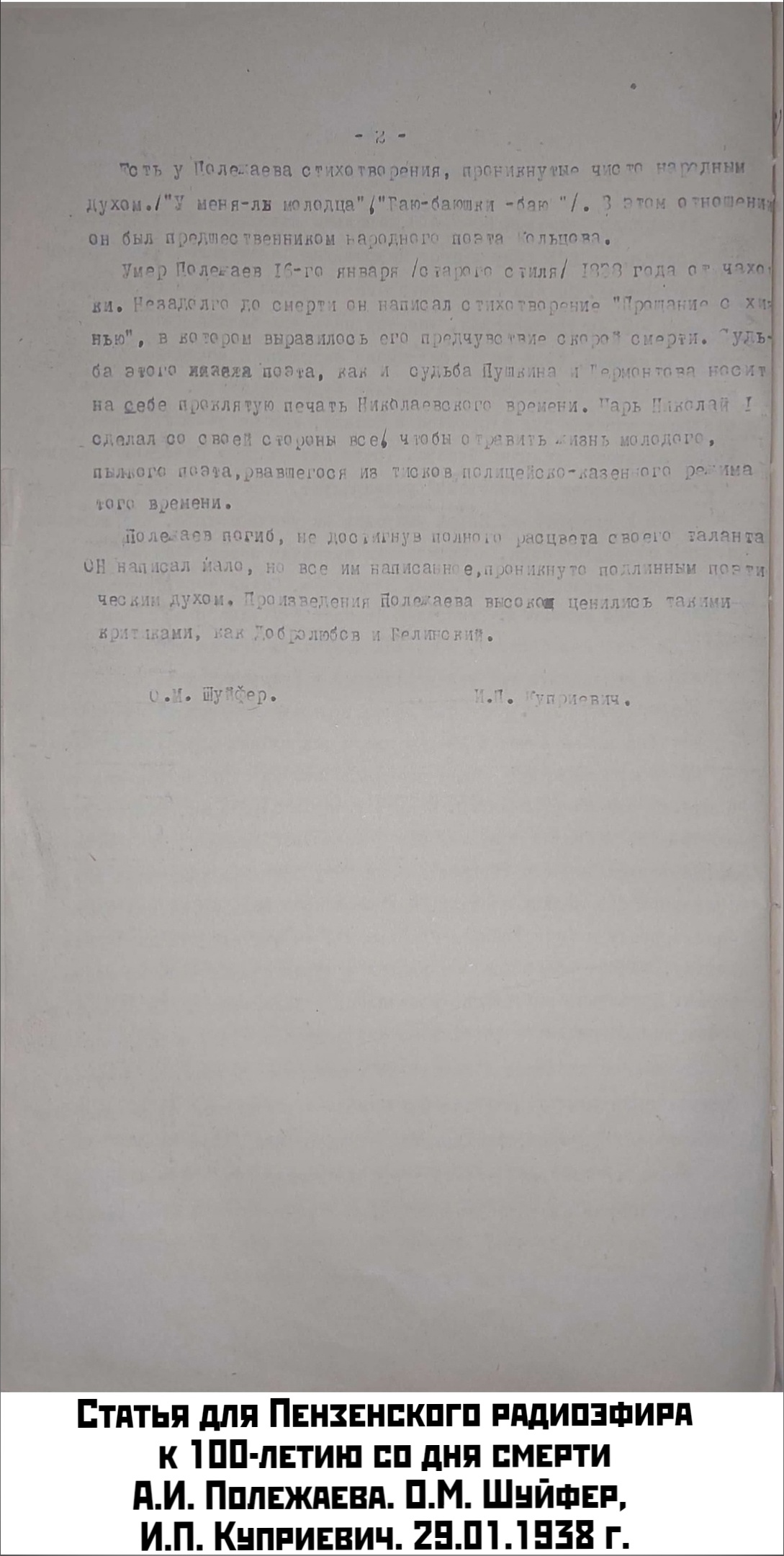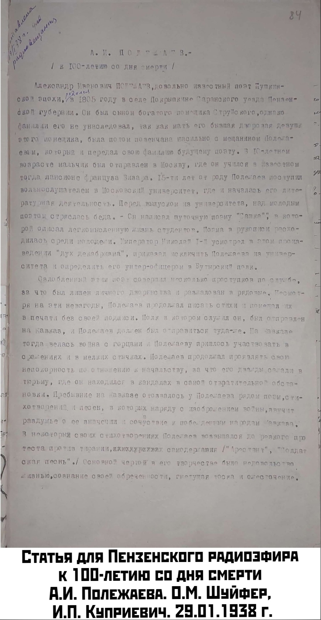 11 сентября (30 августа) 1804 г. в с. Рузаевке Инсарского уезда Пензенской губернии в семье крепостной крестьянки родился поэт Александр Иванович Полежаев. Внебрачный сын помещика Л.Н. Струйского. Получил свою фамилию после венчания матери с саранским купцом И.И. Полежаевым. Для узаконения ребёнка в браке рождение Александра Ивановича в документах записали на 1805 г. После смерти отчима и матери находился под присмотром дворового учителя. В 1816 г. Л.Н. Струйский, приговорённый к переселению в Сибирь за убийство крестьянина, устроил Александра Ивановича в пансион при Московском университете. С 1820 г. – вольный слушатель Отделения словесных наук Московского университета. Под влиянием романа А.С. Пушкина «Евгений Онегин» в 1825 г. пишет собственную сатирическую поэму «Сашка». В 1826 г. жандармский полковник И.П. Бибиков доносит на поэму императору Николаю I, за что Полежаев был разжалован в унтер-офицеры, а после самовольного оставления службы в июне 1927 г. – в рядовые с лишением личного дворянства. В 1828 г. год проводит в заключении, где пишет поэму «Узник». Принимал участие в боевых действиях на Кавказе, в 1831 г. вновь произведен в унтер-офицеры.