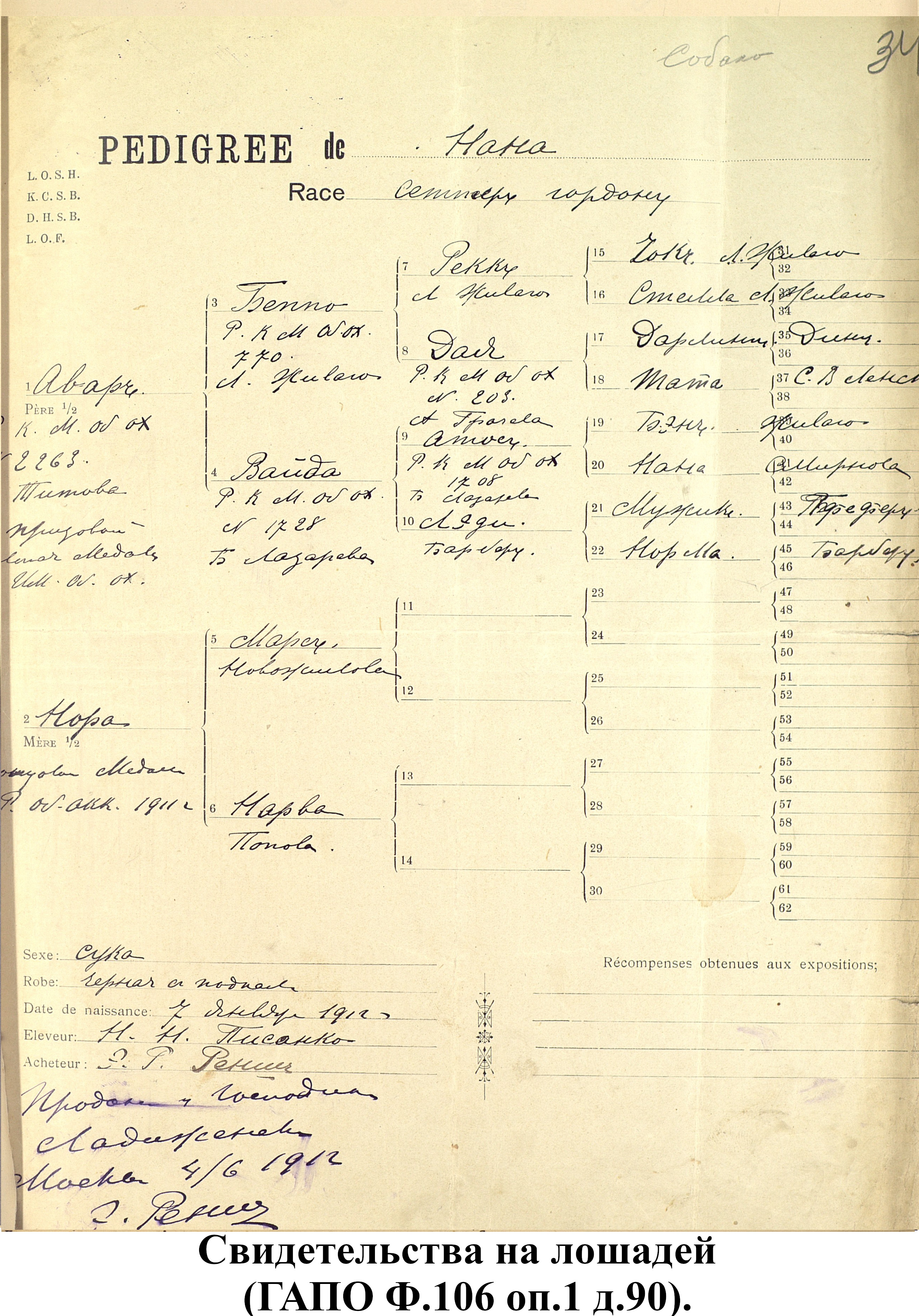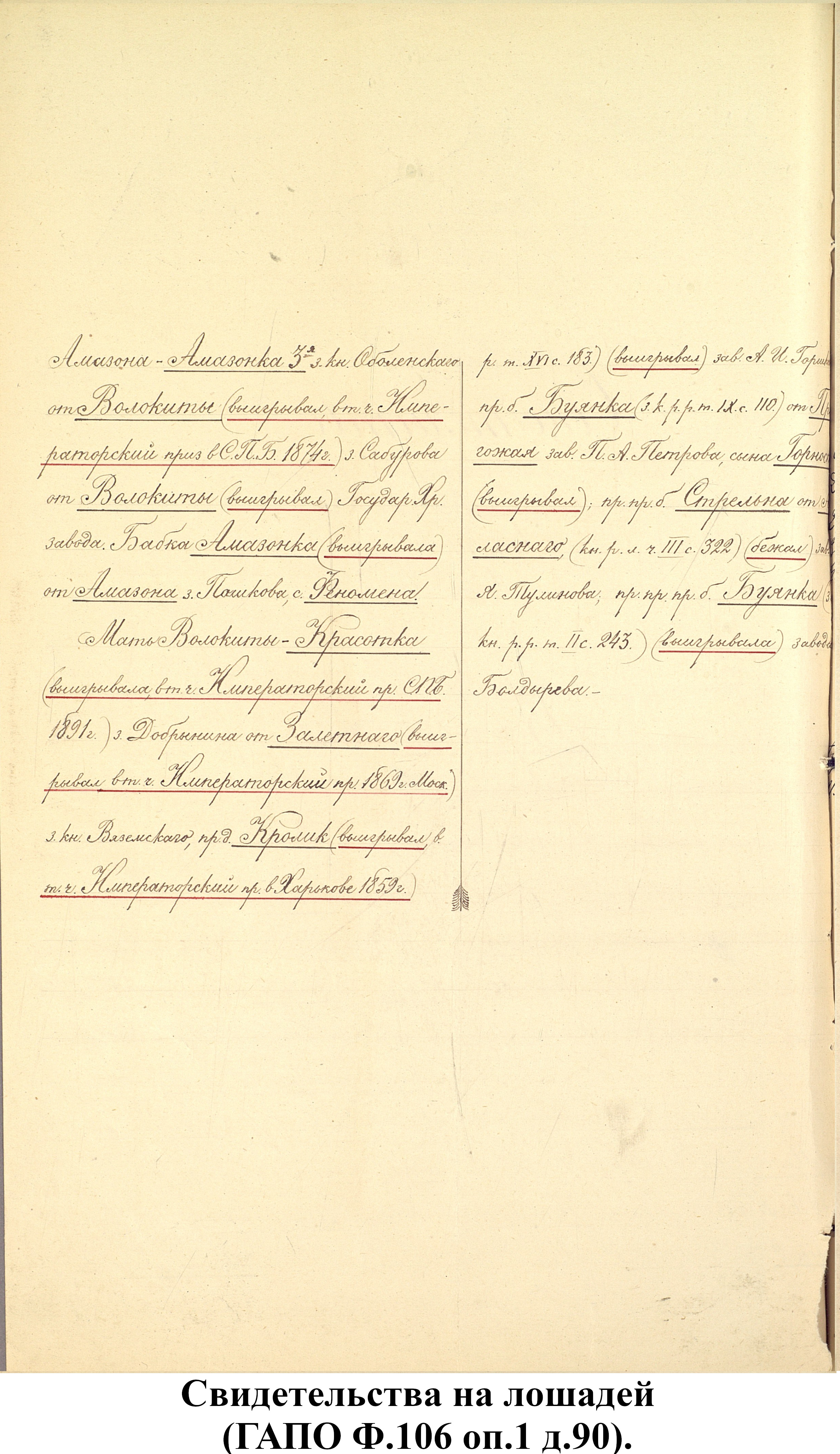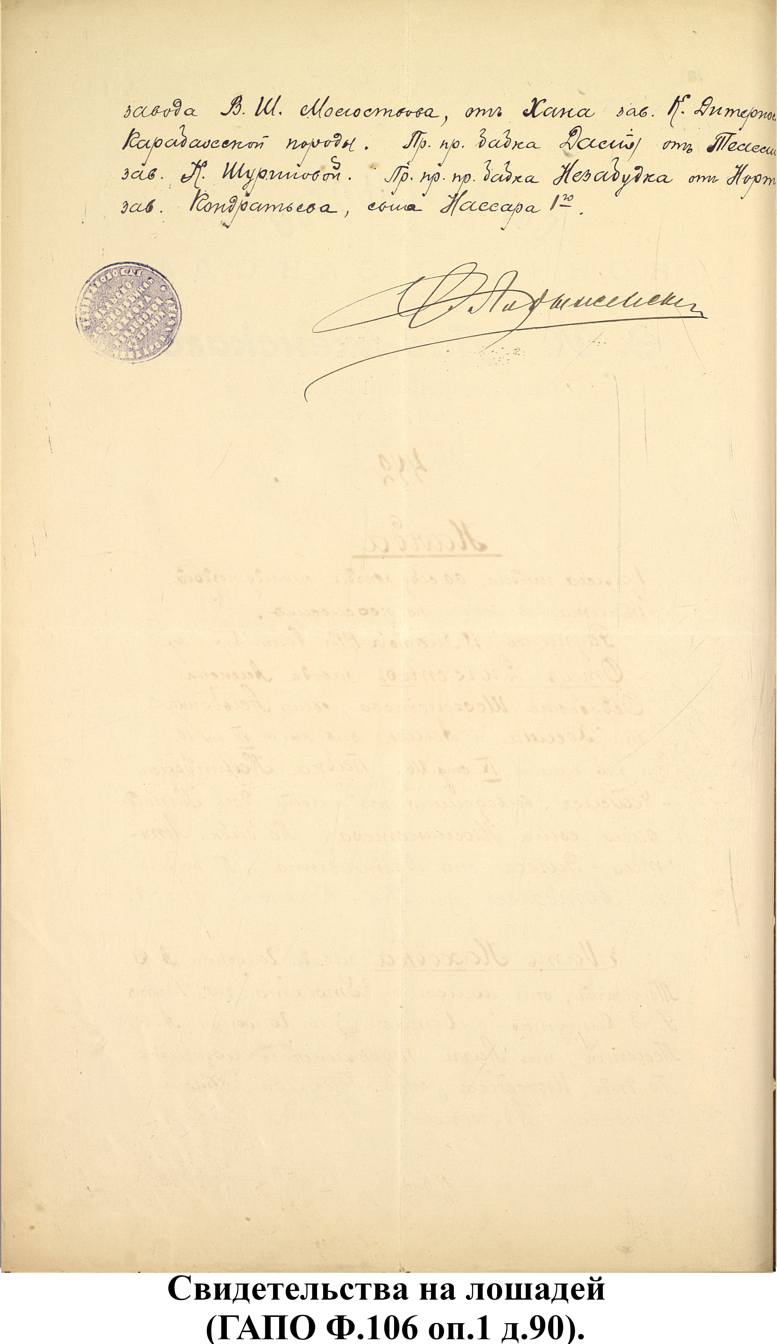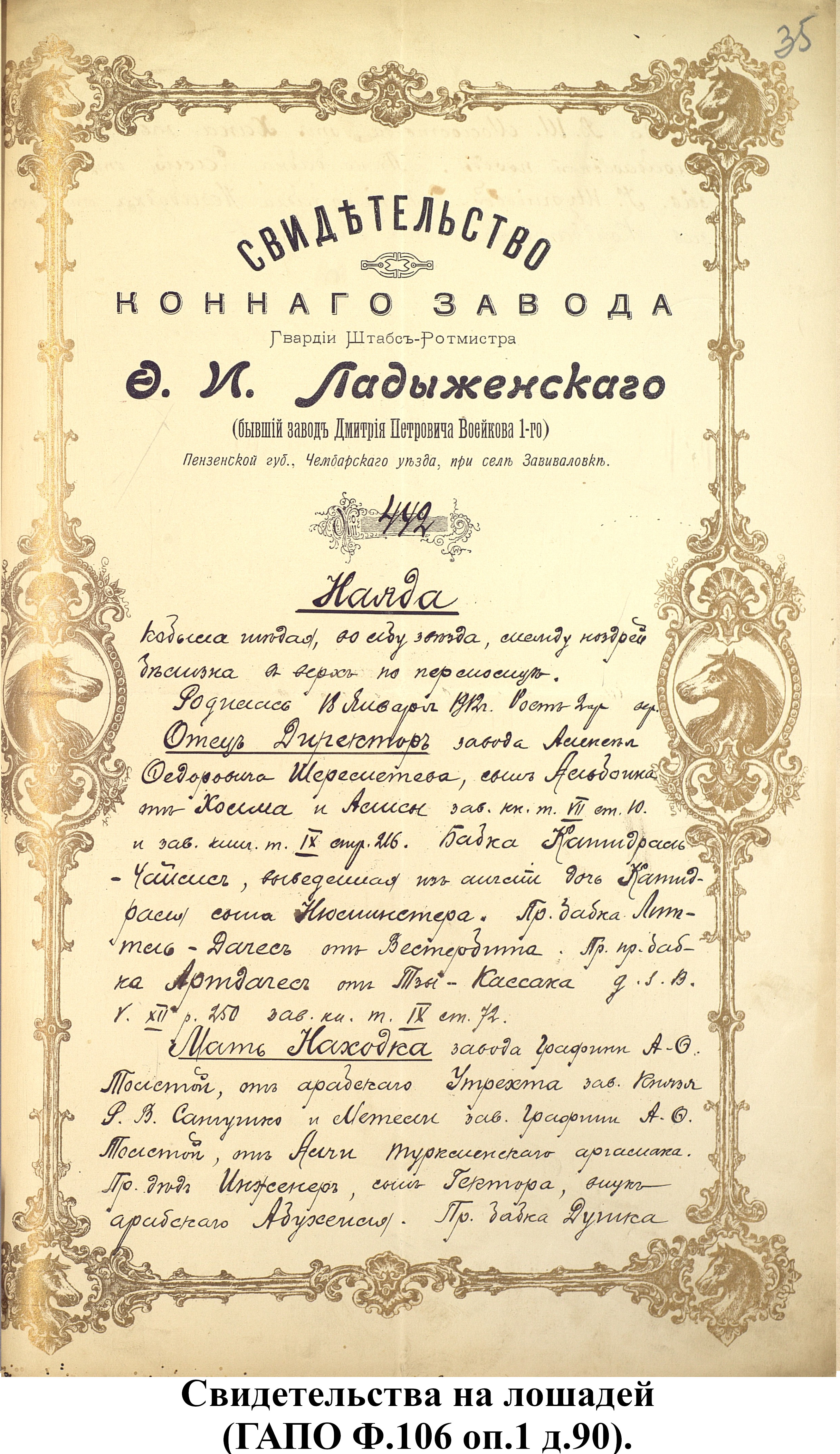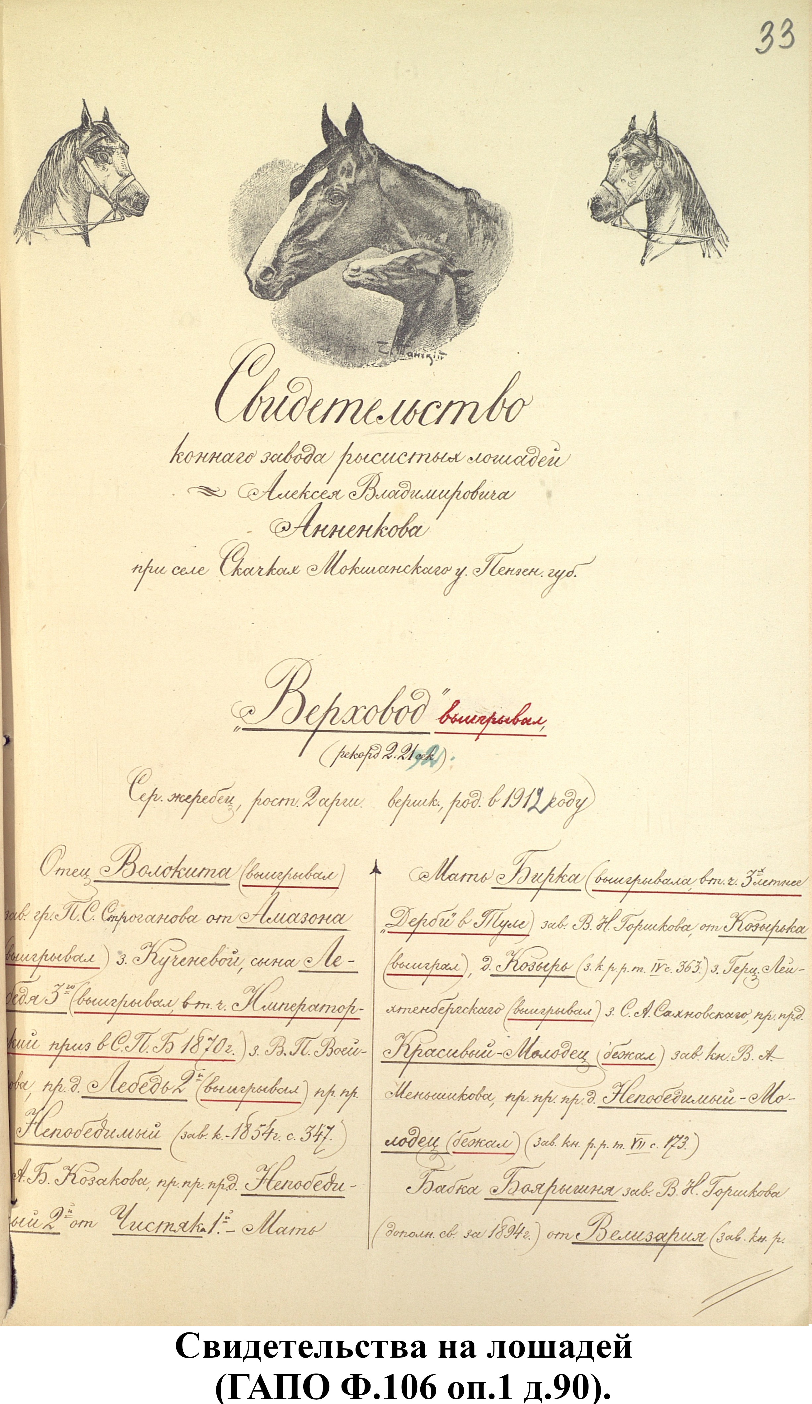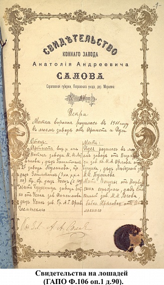 Свидетельства на лошадей из фонда Пензенской государственной заводской конюшни (ф.106).