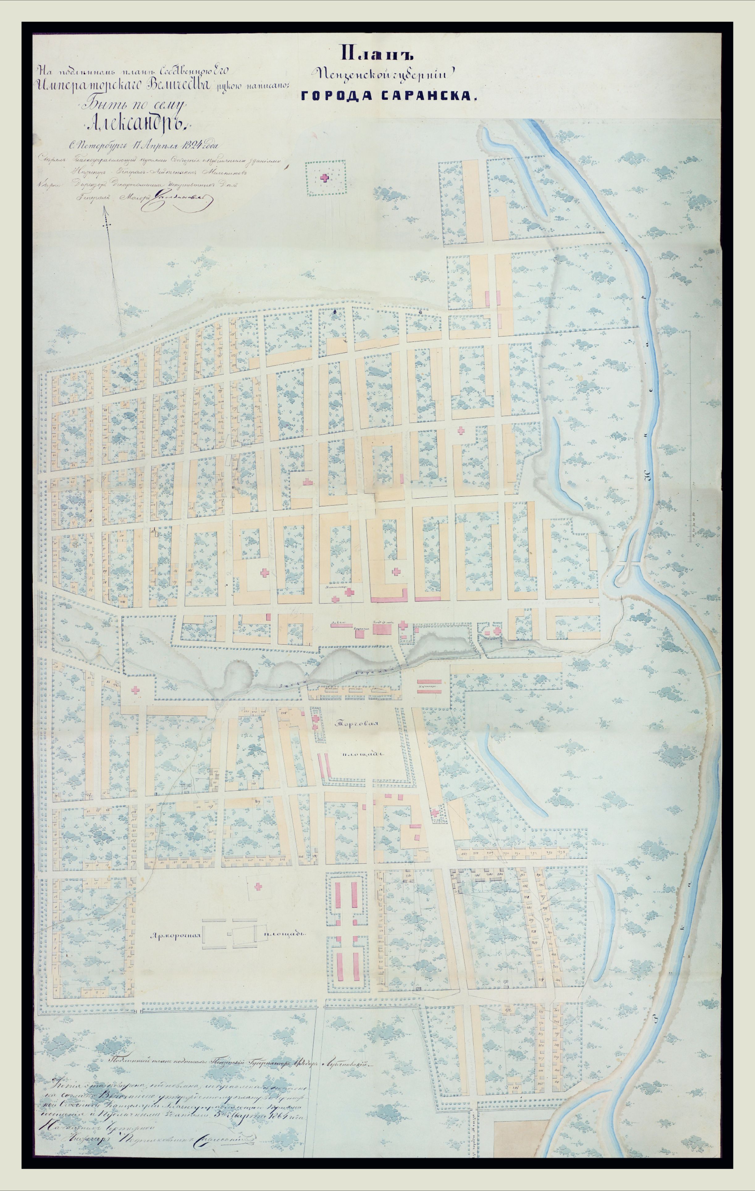План города Саранска Пензенской губернии» это заверенная копия плана, подписанного пензенским губернатором Федором Лубяновским и утвержденного 17 апреля 1824 года императором Александром I.