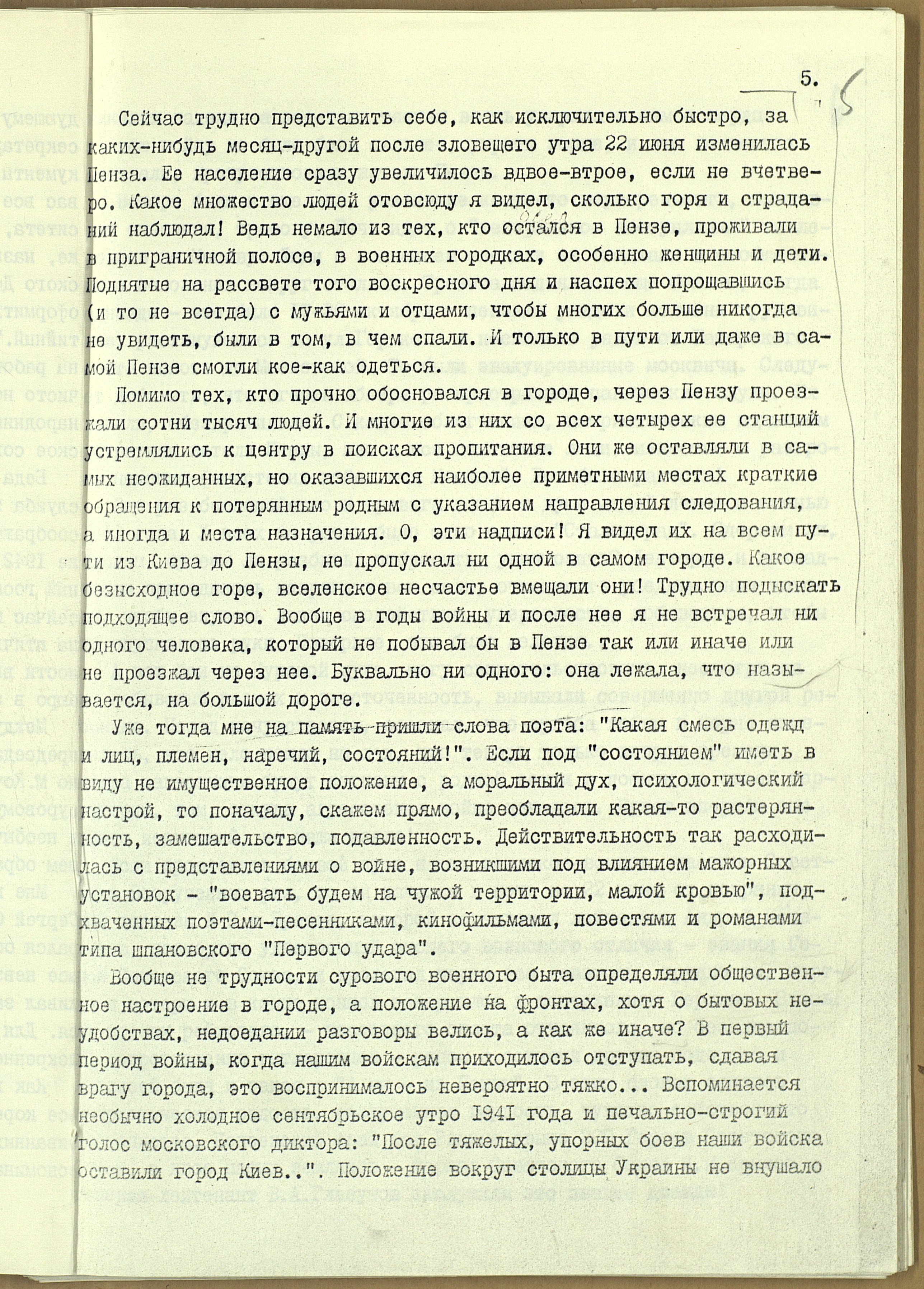 В год 80-летия Победы предлагаем ознакомиться с редкими документами Госархива области о Великой Отечественной войне. Сегодня публикуем часть воспоминаний хорошо известного пензенским старожилам лектора-международника обкома партии В.П. Грановского о тыловой Пензе, где он остановился на пути в эвакуацию, а в итоге осел в нашем городе. Мемуары интересны не только тем, что описывают трагические события войны. В дневниках содержится интересная информацию о старой Пензе, её виде, подробно рассказывается о настроениях людей и жизни в условиях тотальной экономии. Приятного прочтения!