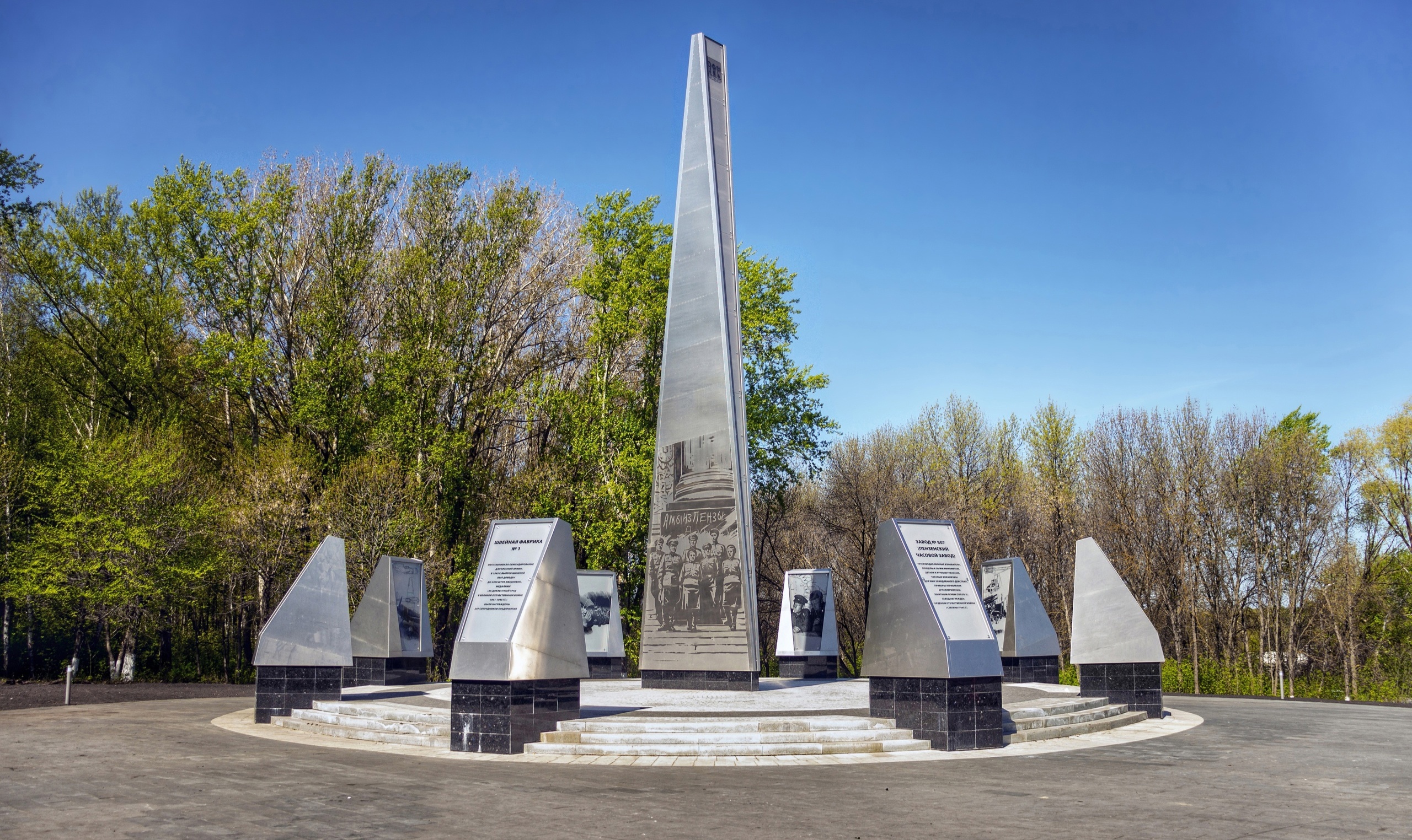 Стройные ряды елок и туй разбегаются от центра. Они, словно часовые стоят на мирном посту. В начале века в парке собирались разместить выставку военной техники, а 27 декабря 2021 года здесь состоялось торжественное открытие стелы «Город трудовой доблести», посвященной увековечению подвига жителей Пензенской области в годы Великой Отечественной войны.
