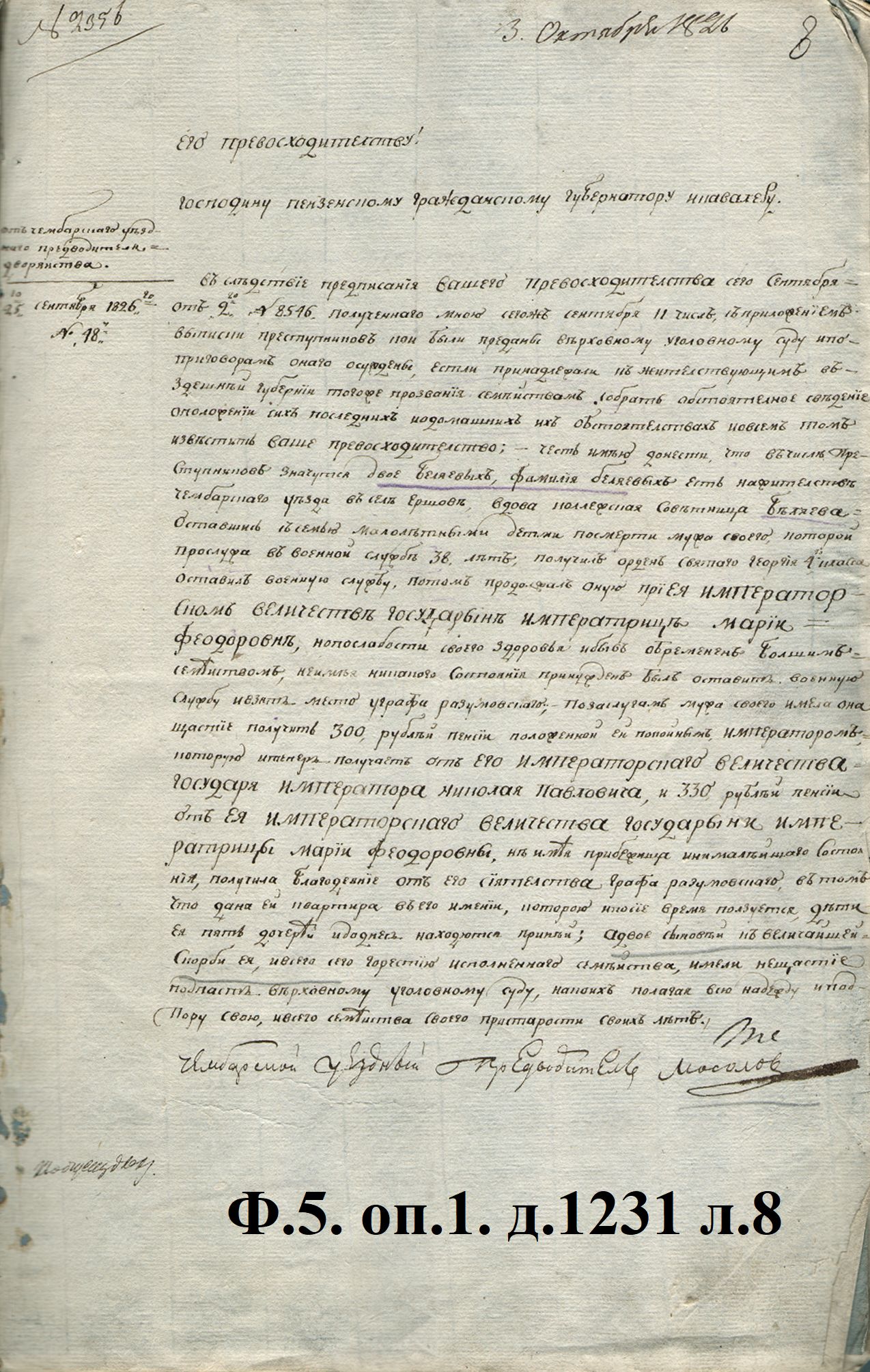 В 1805 году в село Ершово Чембарского уезда Пензенской губернии в имение графа Разумовского приехала семья Петра Гавриловича Белева, сыновья которого Александр и Петр примут активное участие в подготовке восстания на Сенатской площади, как члены тайного общества, носившего название «Общество Гвардейского экипажа». В Пензенской губернии прошло их беззаботное детство. После Минусинской ссылки братья были отправлены в 1839 году солдатами на Кавказ. После возвращения оттуда жили в Саратове и в Самаре у своих родственников, часто посещая Пензенскую губернию, где у них оставалось много друзей, знакомых и родственников.