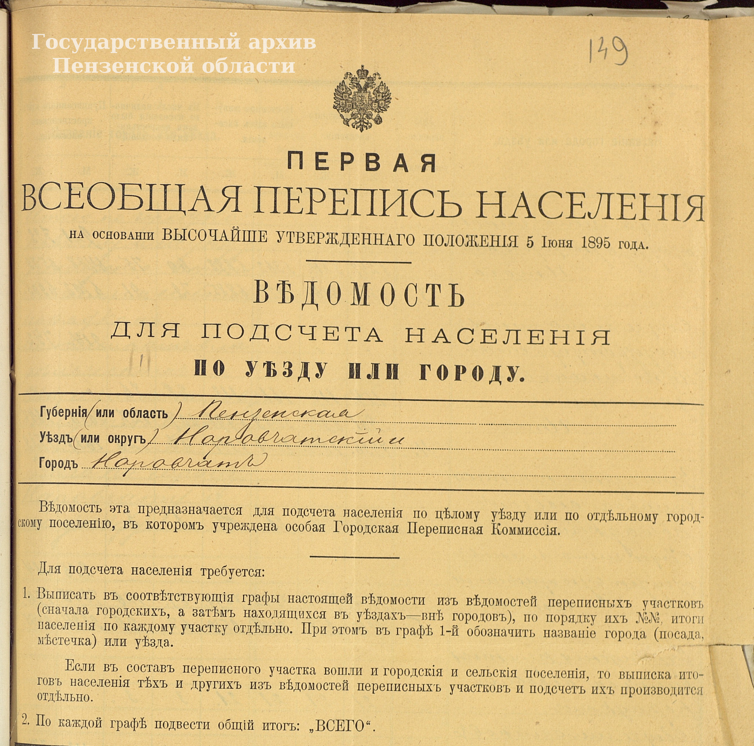 Формально перепись была проведена в январе 1897 года. По ее итогам были изданы статистические итоговые сборники в количестве 89 штук, в том числе и по Пензенской губернии (в нем насчитывается свыше 200 страниц подробной статистической информации). Конечно, сравнивать ее результаты с нынешним населением Пензенской области не совсем корректно в силу значительных территориальных изменений нашего региона в XX веке. Тем не менее определенные выводы она все же позволяет сделать. Так, например, значительная часть населения губернии, более (80 %), была занята в сельском хозяйстве. Даже центральный губернский город не мог считаться крупным по имперским меркам - в Пензе тогда проживало не более 60000 жителей, из них только 27000 были зарегистрированы непосредственно в городе. 12000 проживало в Саранске, еще 9000 в Мокшане. В остальных уездных центрах населения было еще меньше. Всего же в губернии на тот момент насчитывалось почти полтора миллиона населения. Для сравнения, сейчас - на 200 тысяч меньше.