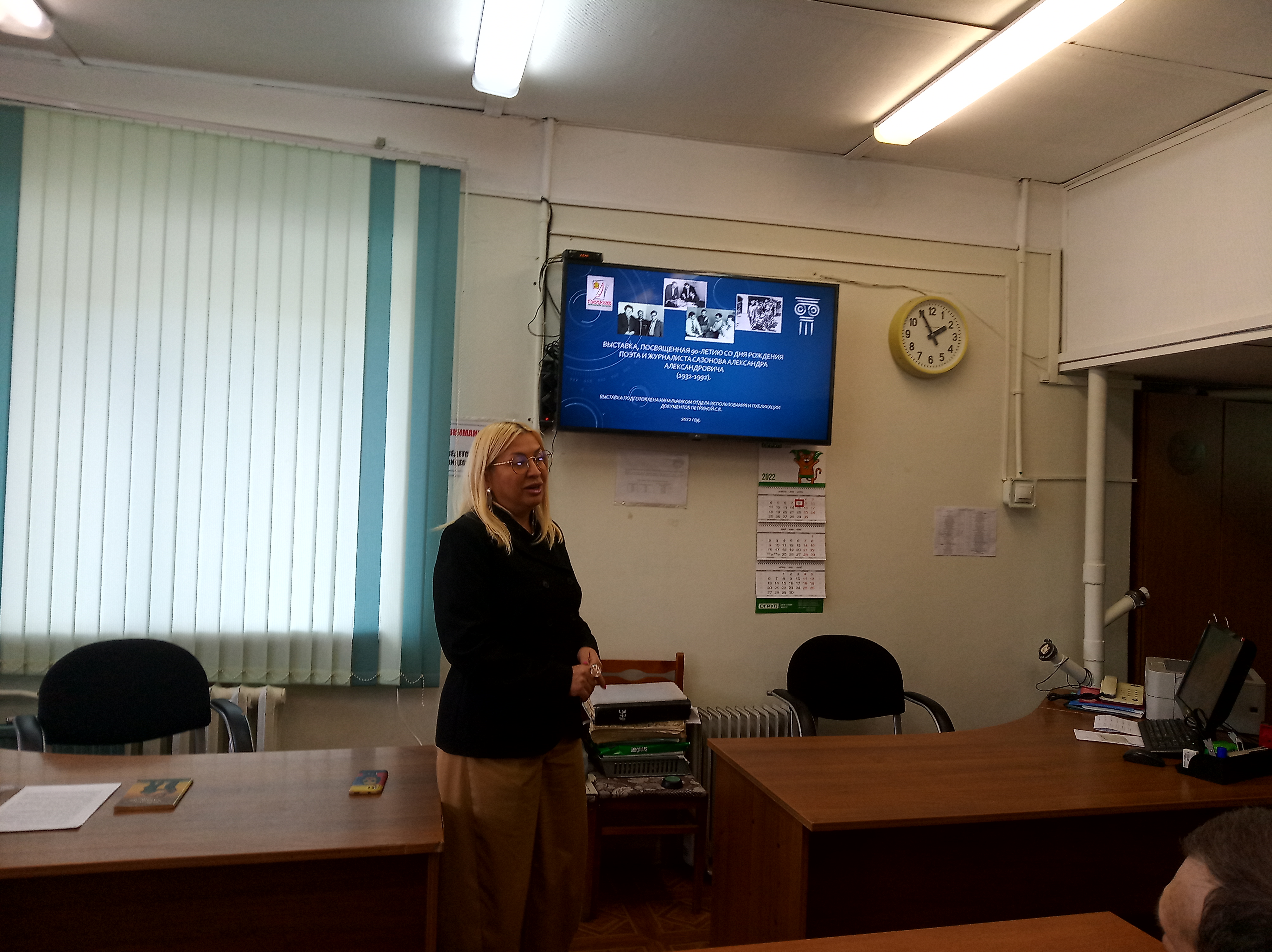 Она презентовала виртуальную выставку, основанную на документах из личного фонда А. А. Сазонова, а также представила небольшую выставку подлинников архивных документов, не вошедших в концепцию выставки.