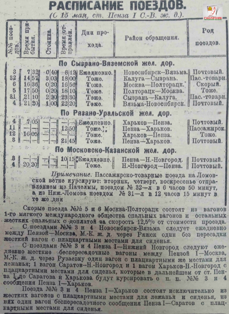 Расписание поездов, следующих через станцию Пенза I на 15 мая 1928 года, опубликованное в газете «Трудовая правда»