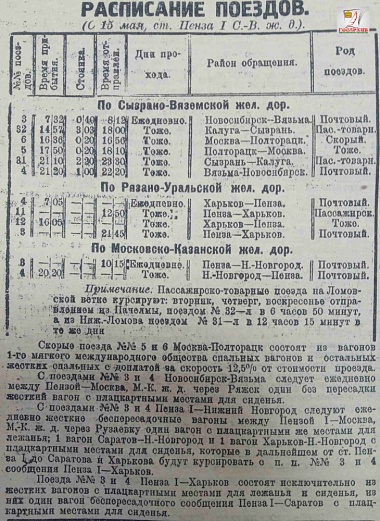 Расписание поездов, следующих через станцию Пенза I на 15 мая 1928 года, опубликованное в газете «Трудовая правда».