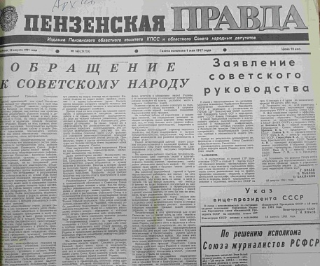 В ночь с 18 на 19 августа 1991 года начались события печально известного «Августовского путча». О том , была ли это попытка спасти Советский Союз, или заранее организованный спектакль, пошедший не по сценарию, историки будут спорить еще долго. Мы предлагаем вам взглянуть на эти дни со страниц областной газеты «Пензенская Правда». Ее редакция тогда попала в неловкую ситуацию, публикуя вначале документы ГКЧП, а потом Б. Н. Ельцина. Главному редактору В. Н. Садчикову это стоило карьеры, а сама газета потеряла много журналистов, перешедших в знак протеста в другие издания, в том числе в «Пензенские вести», вскоре получившие статус официальной газеты областной Администрации.