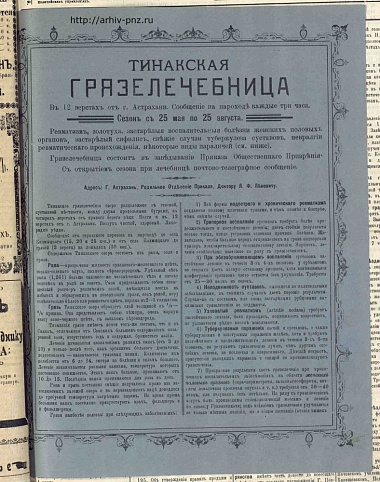 Рекламный проспект Тинакской грязелечебницы (находится недалеко от Астрахани) из подшивки газеты «Пензенские губернские ведомости» за 1904 год. Санаторий в этих местах существует с 1820 года.