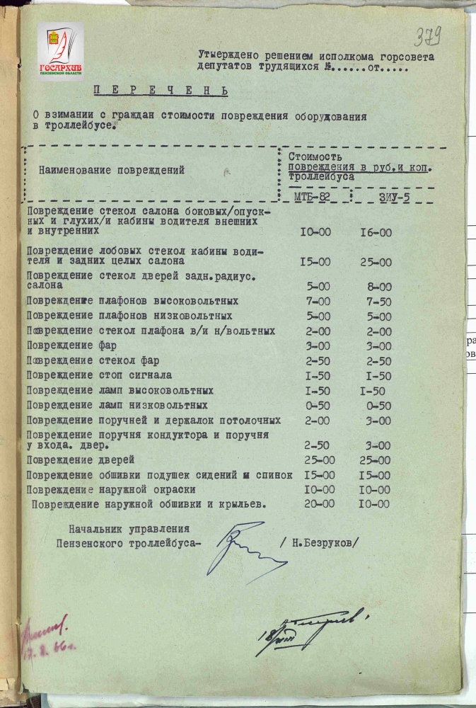 К тексту решения также были прикреплены сами Правила, а также «Перечень о взимании с граждан стоимости повреждения оборудования в троллейбусах». Самым дорогим для хулиганов было повреждение внешней обшивки, дверей и обивки сидений. Порча стекол и световых приборов оценивалась значительно меньше.