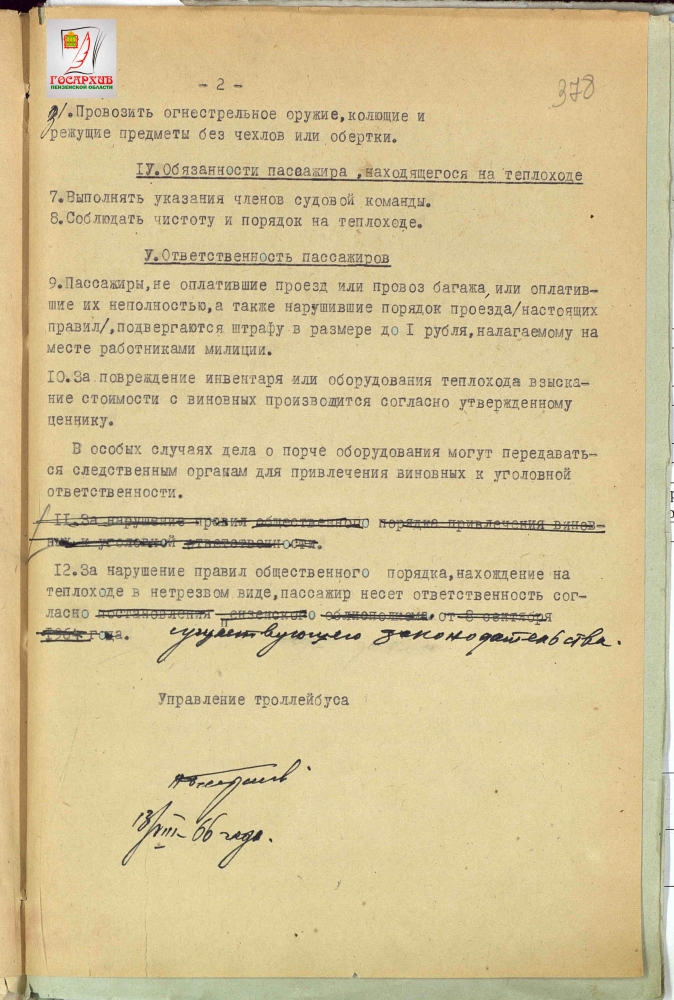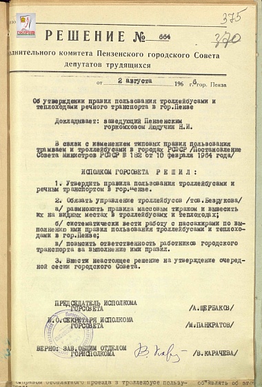 Решение исполнительно комитета Пензенского городского совета депутатов трудящихся «Об утверждении правил пользования троллейбусами и теплоходами речного транспорта в г Пензе» от 02. 08. 1966 года № 664.