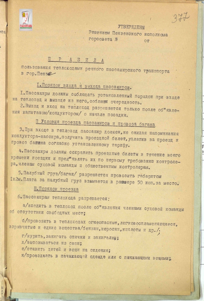 Решение исполнительно комитета Пензенского городского совета депутатов трудящихся «Об утверждении правил пользования троллейбусами и теплоходами речного транспорта в г Пензе»