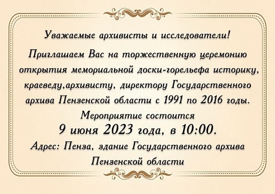 Просим обратить ваше внимание, что в связи с открытием мемориальной доски-горельефа историку, краеведу, архивисту, директору Государственного архива Пензенской области (с 1991 по 2016 г.) Татьяне Алексеевне Евневич 9 июня 2023 г. читальный зал архива работать не будет.
