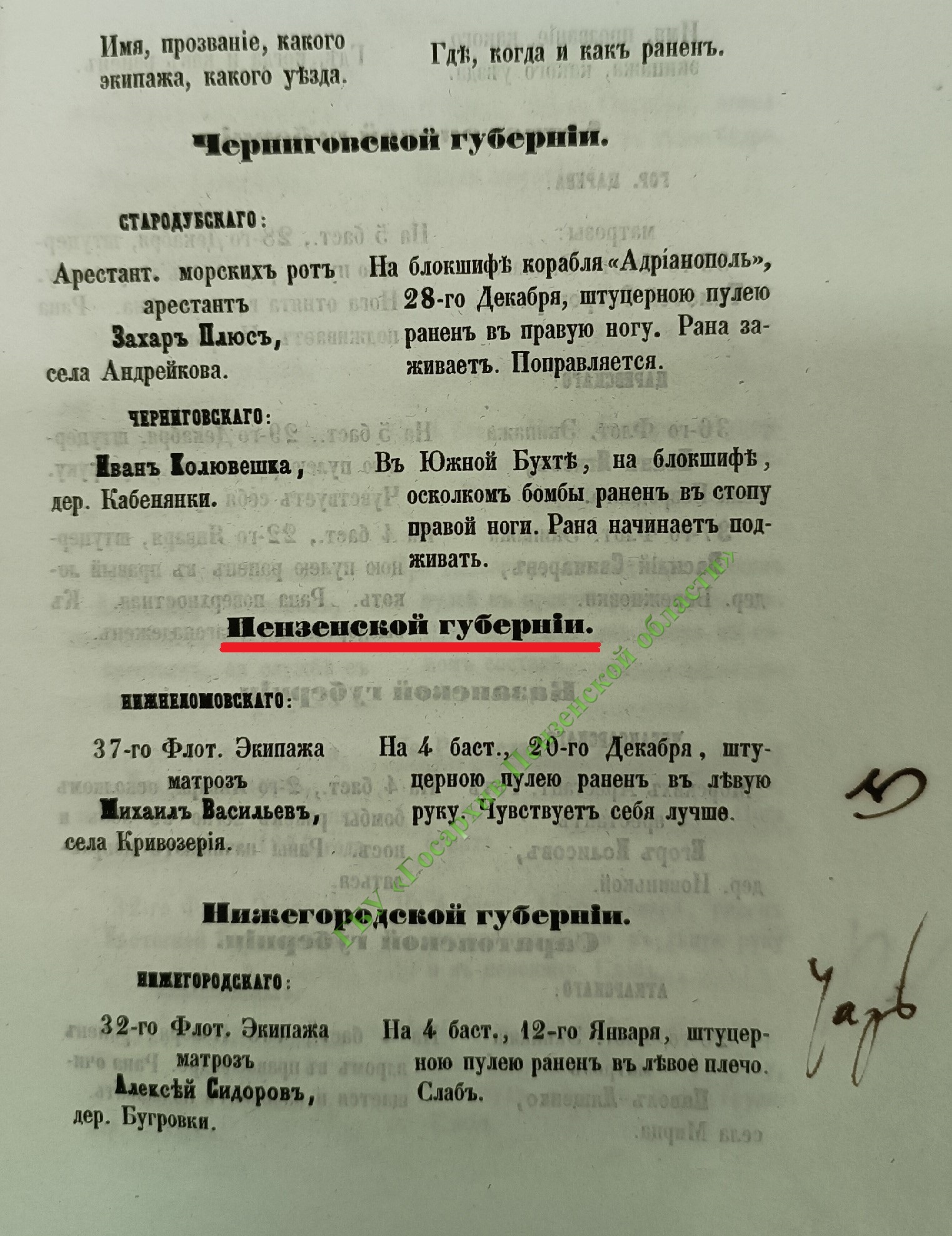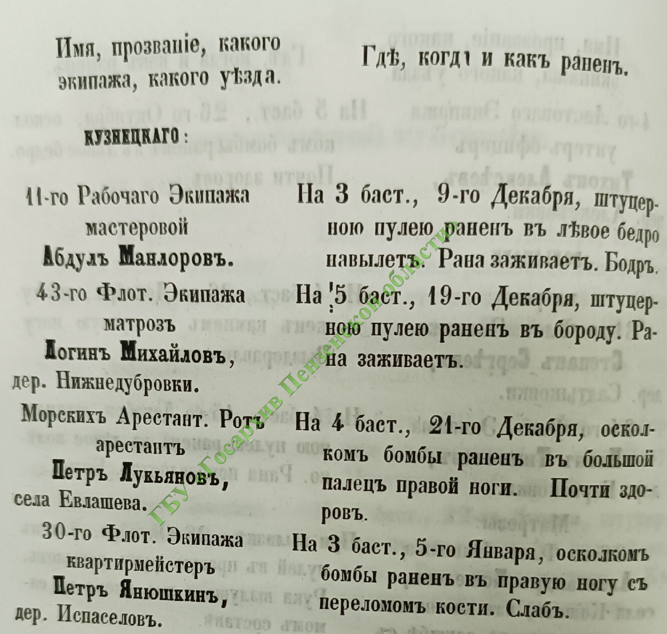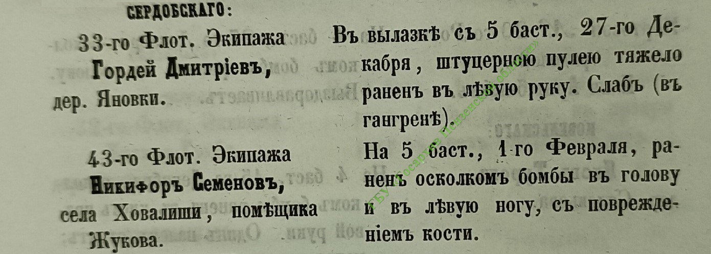 Также в списках раненых есть любопытная информация об уроженцах нашего края. К примеру, про матроса 37-го флотского экипажа Михаила Васильева говорится следующее: «На 4-м бастионе, 20 декабря, штуцерною пулею ранен в левую руку. Чувствует себя лучше», или о квартирмейстере Янюшкине: «Осколком бомбы ранен в правую ногу с переломом кости. Слаб».