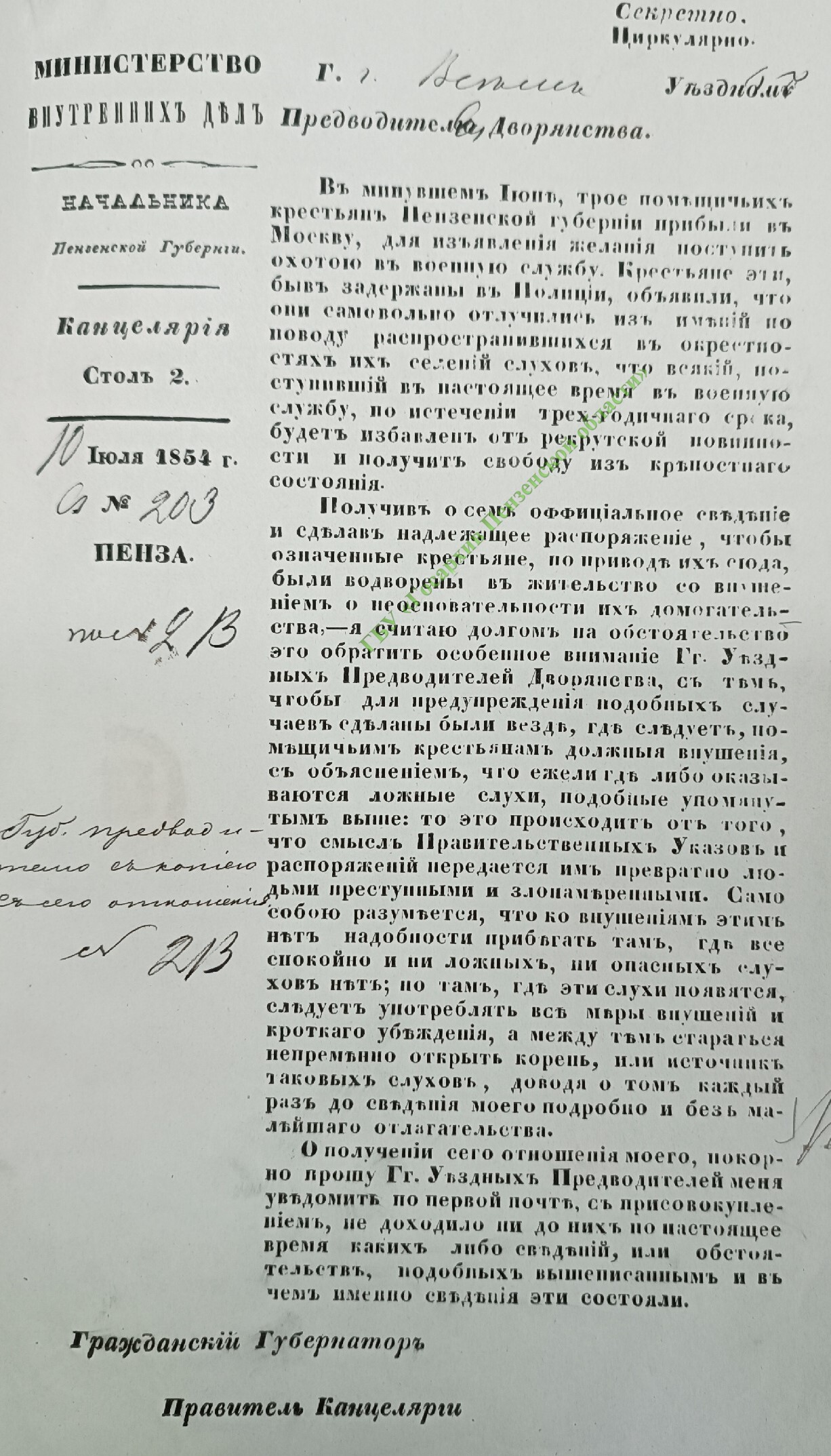 В других документах можно увидеть, как Крымская война отразилась на крестьянском сознании. Некоторые из них были уверены, что после трёх лет службы им обязаны дать вольную. Из-за этих слухов участились побеги крепостных с желанием вступить в армию. Трое из пензенских крестьян с этой целью добрались до Москвы! Всех, конечно же, задержали и отправили обратно в Пензенскую губернию.
